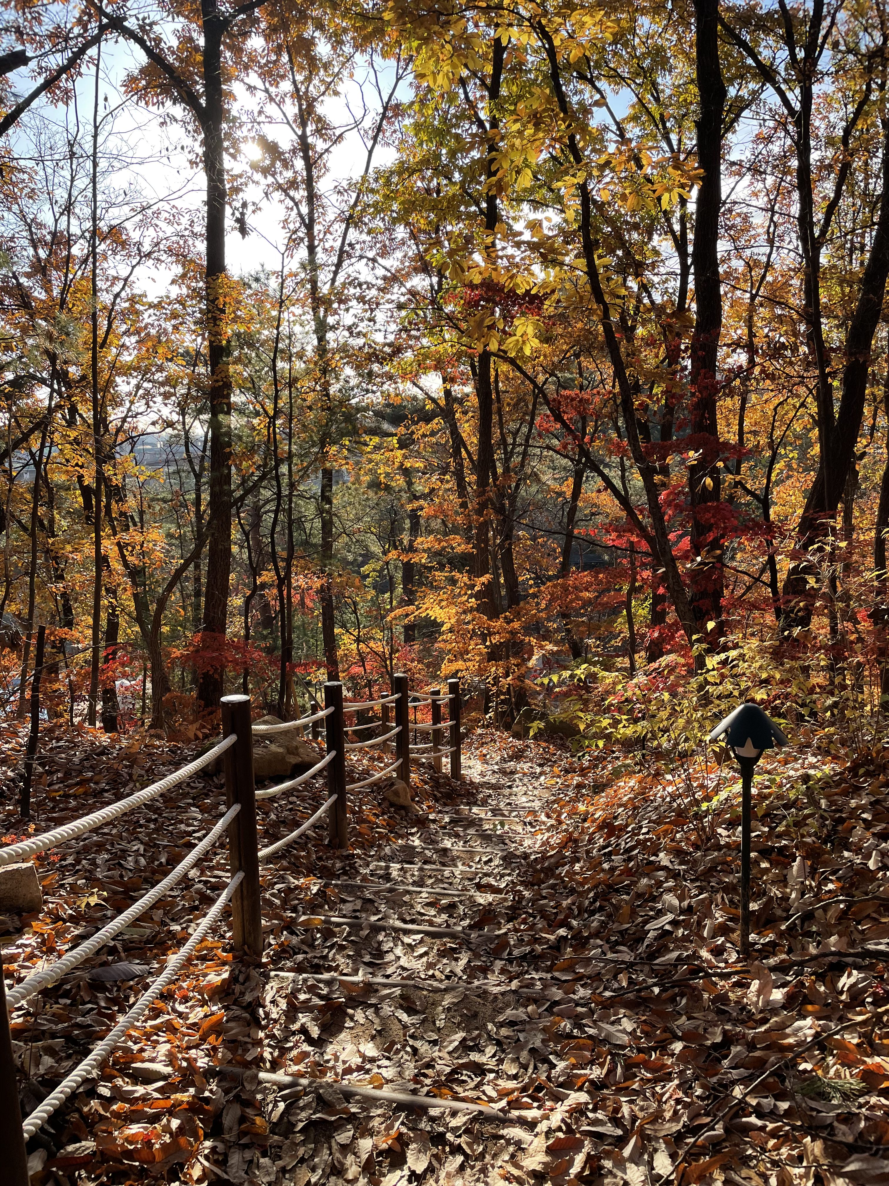 조식을 든든히 먹고, 아침 산책을 나왔는데요, 산책로에 단풍이 정말 예쁘게 물들어 있더라고요. 단풍 숲을 걸으니 마음이 편안해지는 기분이었어요.