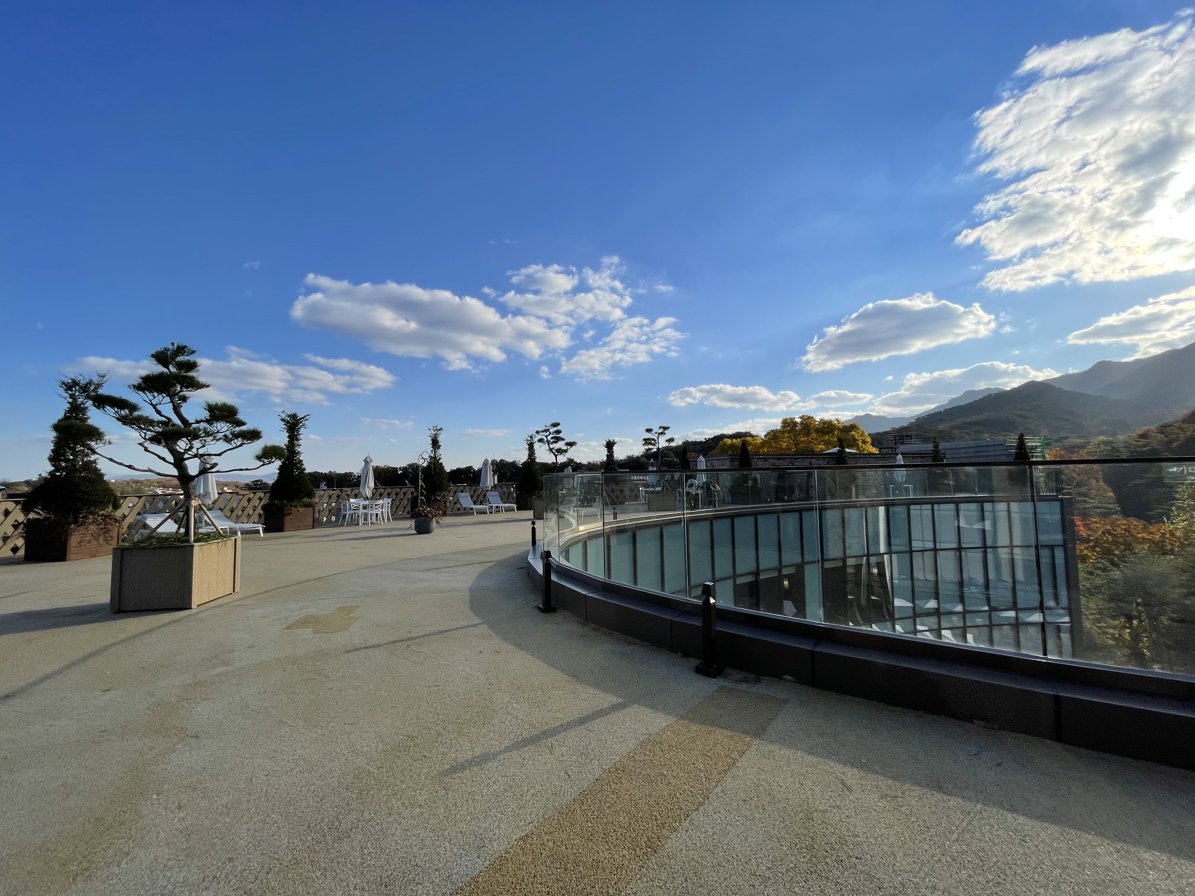 테라스 카페에서 에이드와 초콜릿을 맛있게 먹고, 방에서 옷을 갈아입은 후 테라스 카페 바로 옆에 위치한 루프탑 자쿠지에 왔는데요, 따뜻한 물속에서 마운틴 뷰를 감상하며 힐링할 수 있는 공간이에요.