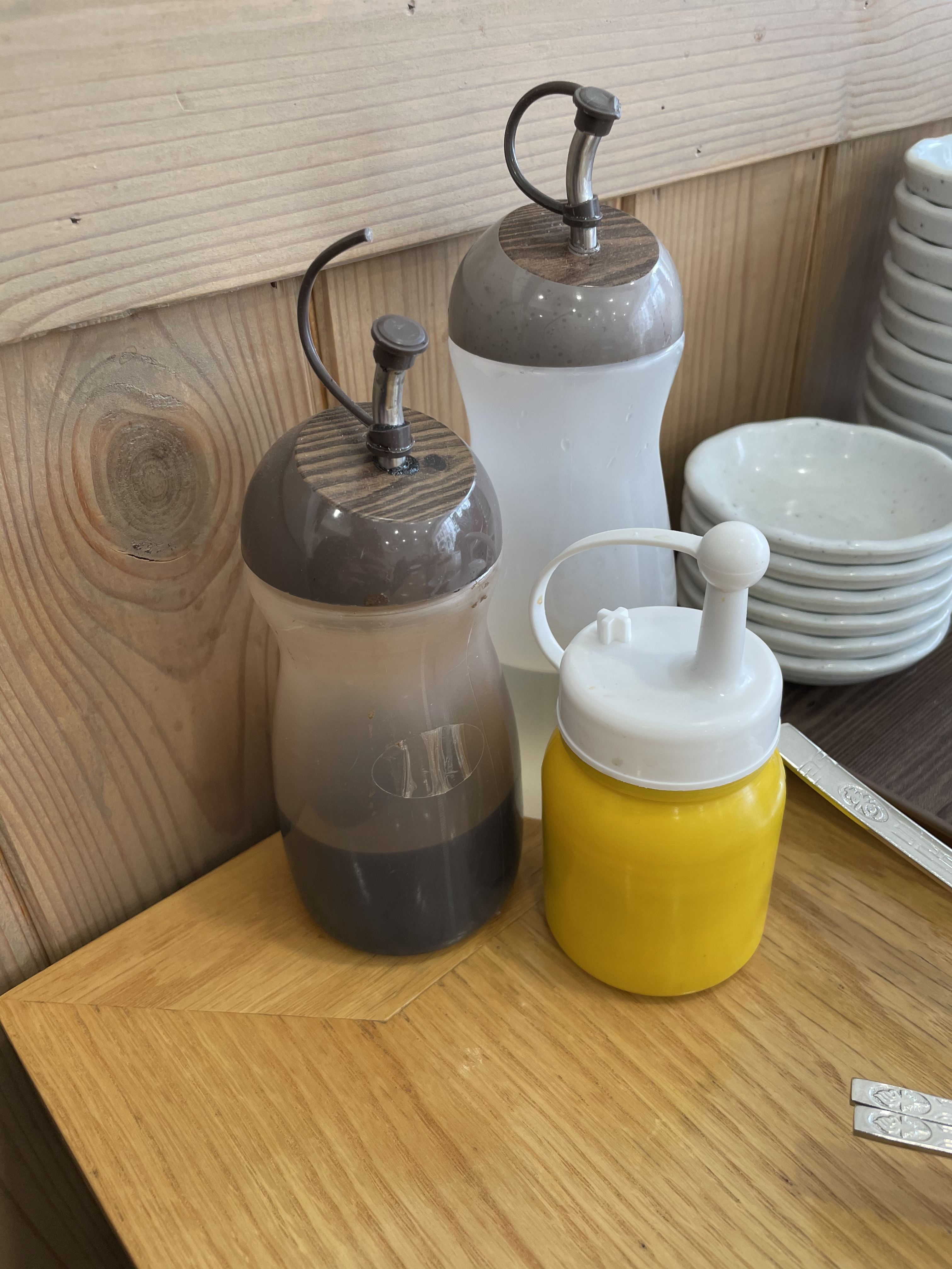 밑반찬으로는 김치와 단무지, 무채가 나와요. 일반적인 밀면집 밑반찬 구성이에요. 그리고 테이블 옆에는 밀면에 넣어서 먹을 수 있는 식초와, 겨자 그리고 만두를 찍어먹을 수 있는 간장이 준비되어 있어요.