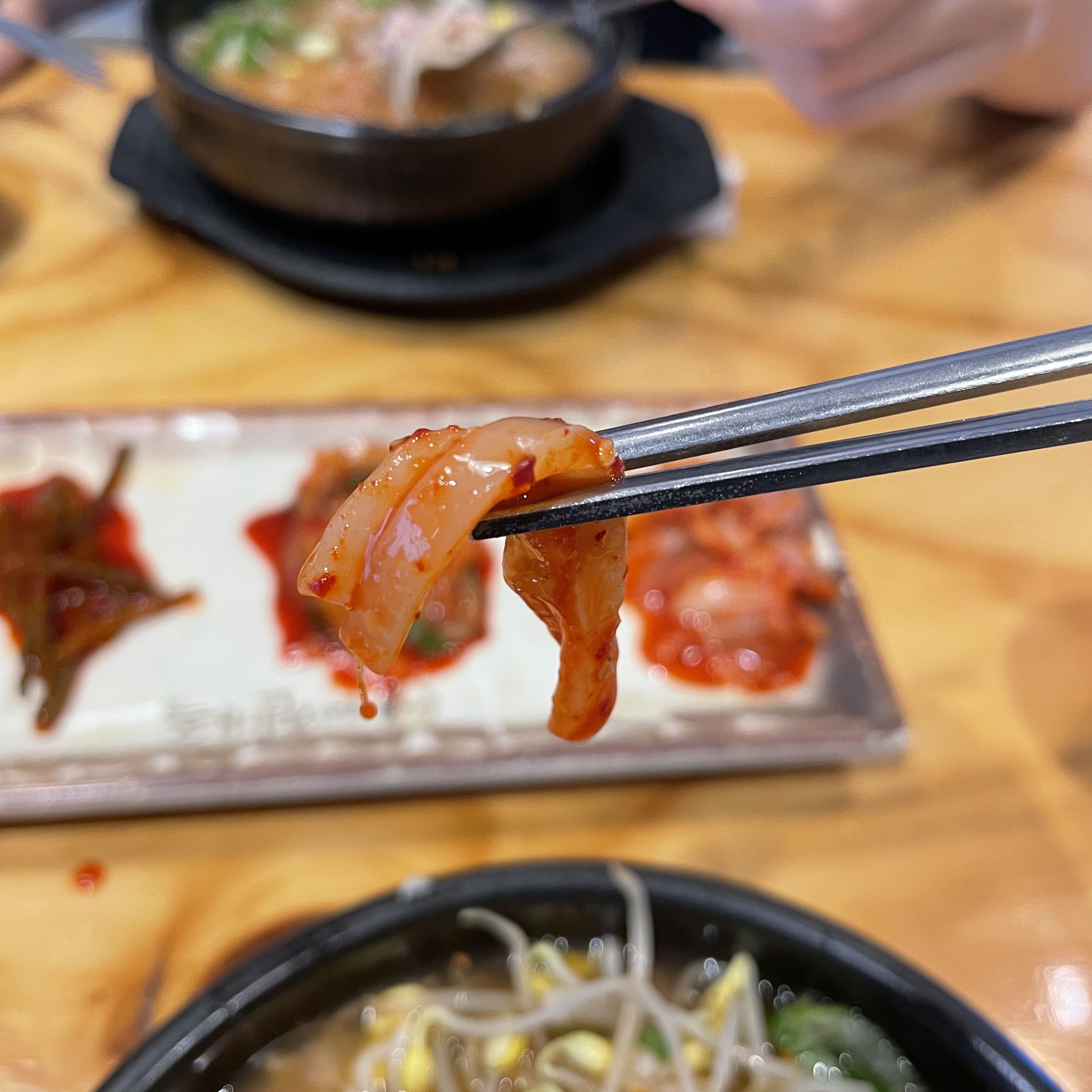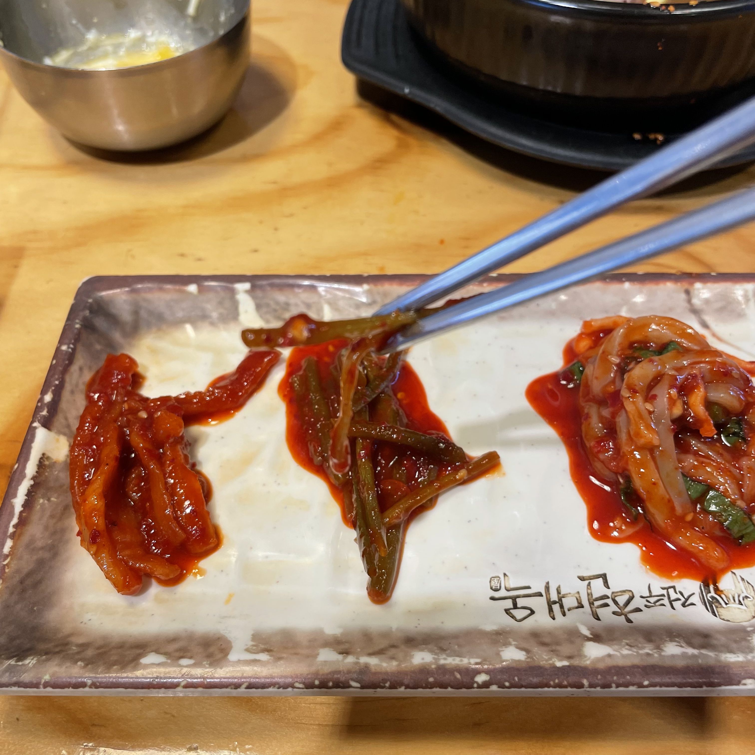 저는 현대옥 콩나물국밥을 먹으면서 마늘종 무침을 밑반찬으로 즐겨 먹었어요. 요즘 식당에서 배추김치를 최대한 안 먹으려고 하고 있기 때문에 마늘종 무침의 아삭함으로 식감을 대신했던 것 같아요.