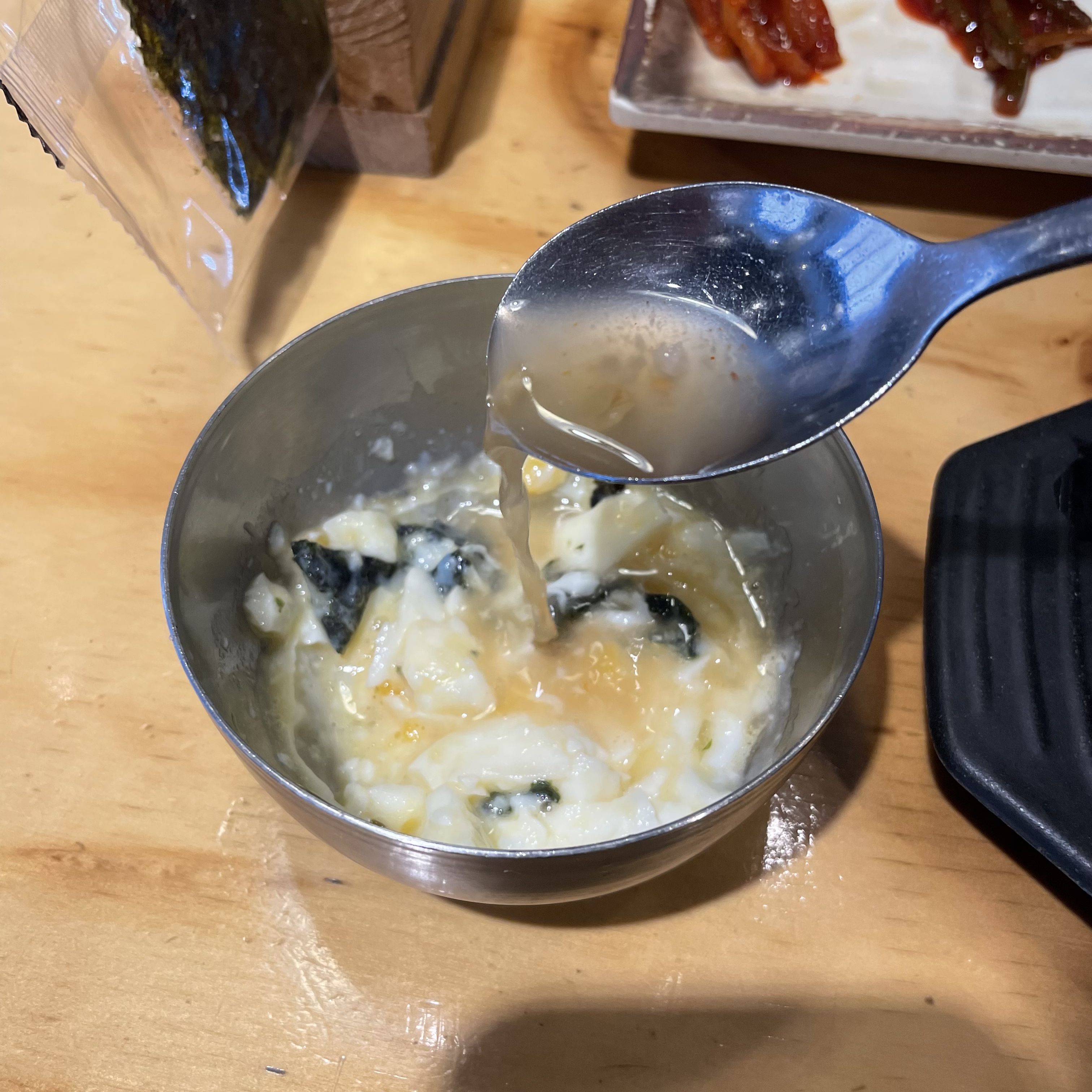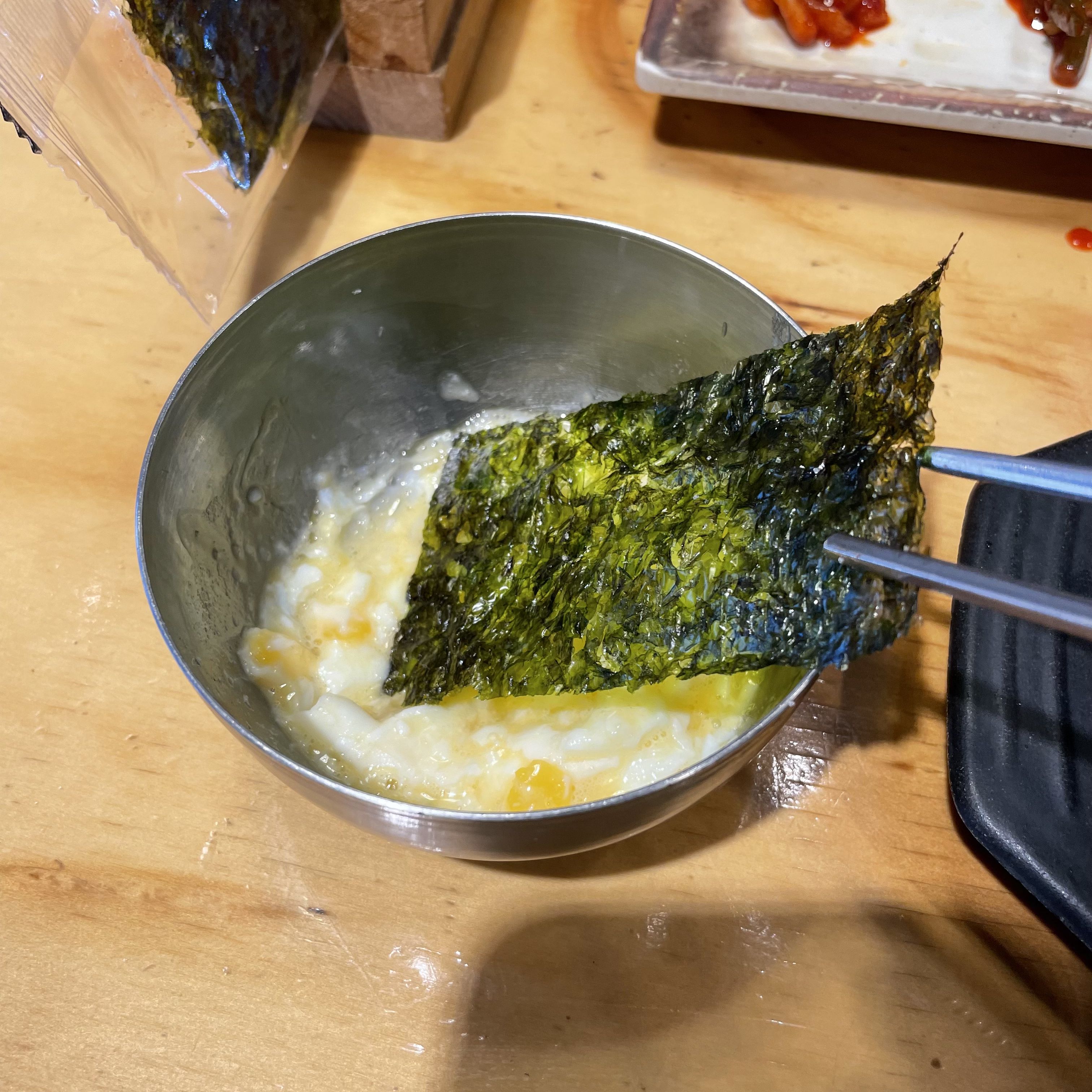 반대로 김가루를 넣은 수란을 국밥에 넣어서 먹을 수 있으니 기호에 따라서 조절해 먹으면 됩니다.