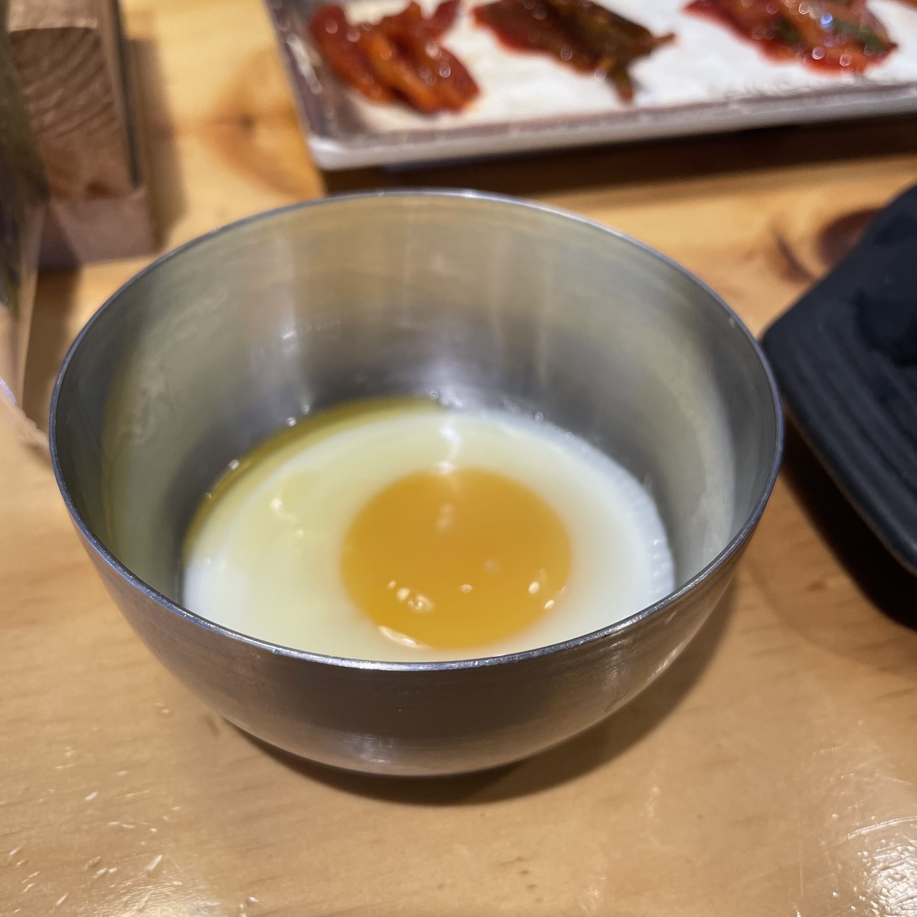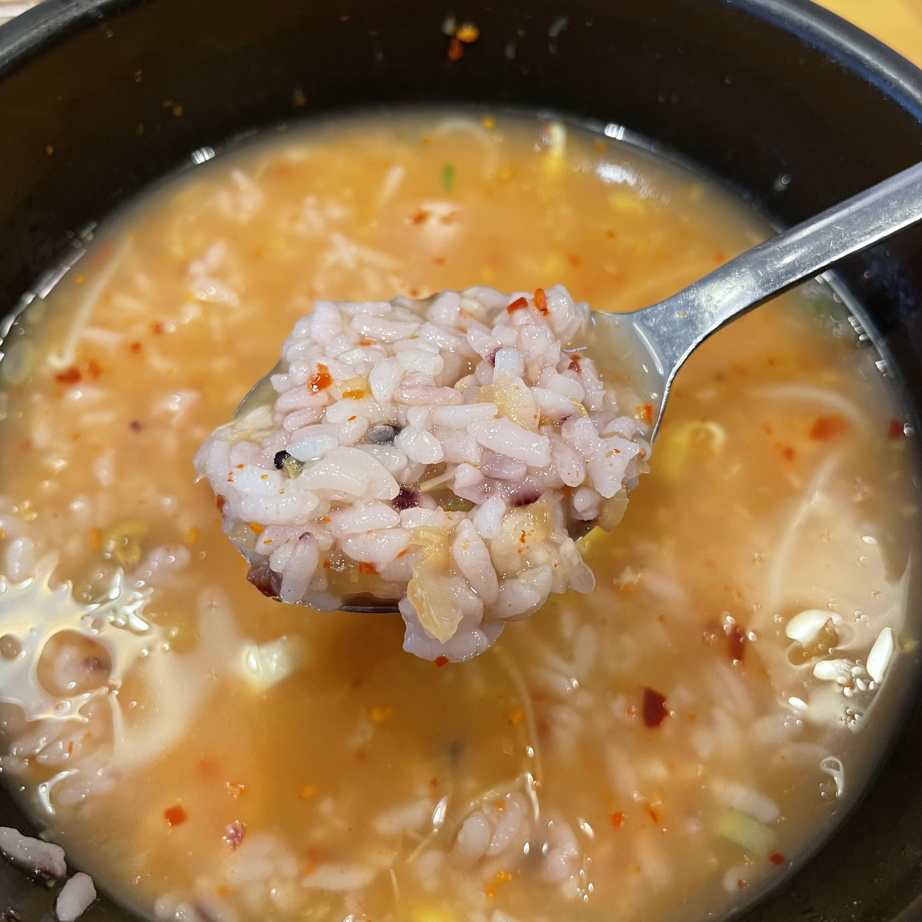 전주 남부식 콩나물국밥에는 밥과 콩나물, 각종 신선한 야채 그리고 고춧가루가 들어가 있어서 꽤 칼칼한 맛을 느낄 수 있었어요. 저는 개인적으로 콩나물국밥에 계란을 넣어서 국물이 탁해지는 걸 싫어하기 때문에 수란 따로, 국밥 따로 먹었어요.