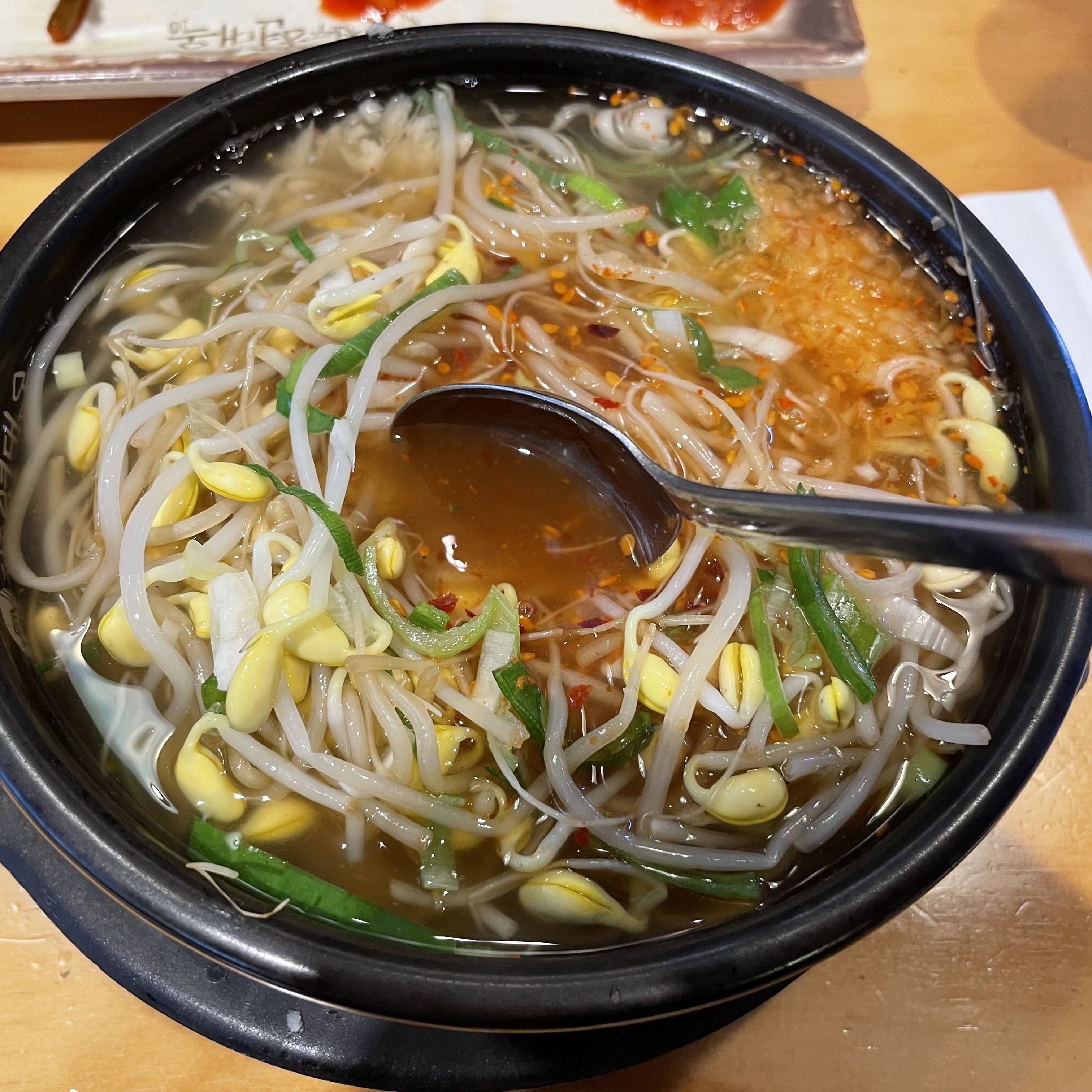 밥과 콩나물 한 번, 밥과 국물 한 번, 계속 이렇게 먹다 보니까 뚝배기의 바닥이 점점 드러나고 있어요. 원래 다른 식당에서 콩나물국밥을 먹을 땐 조미료로 후추를 조금씩 넣곤 하는데 현대옥의 전주 콩나물국밥은 간이 잘 되어 있어서 따로 조미료를 넣지 않을 채 끝까지 먹을 수 있었어요.