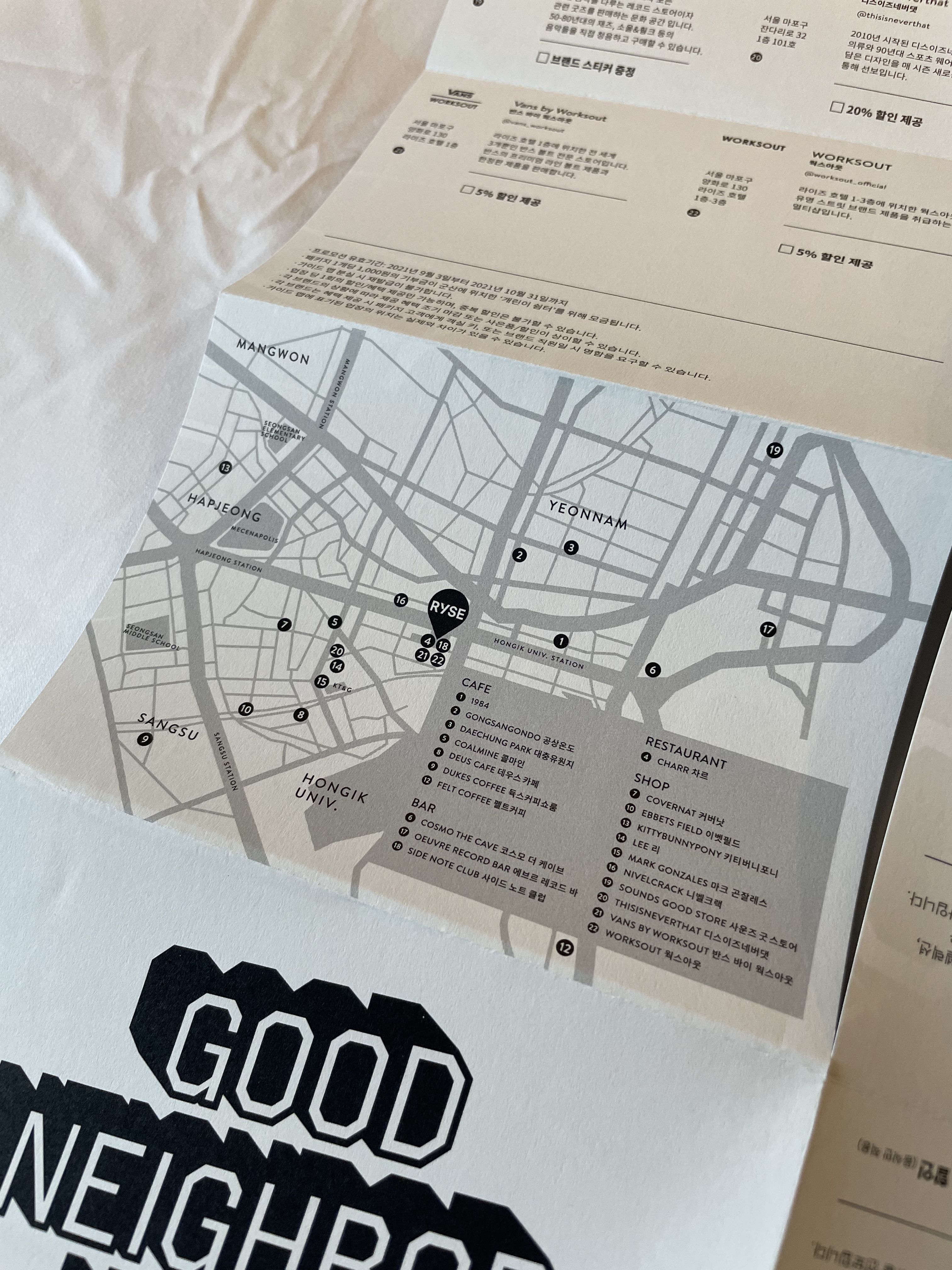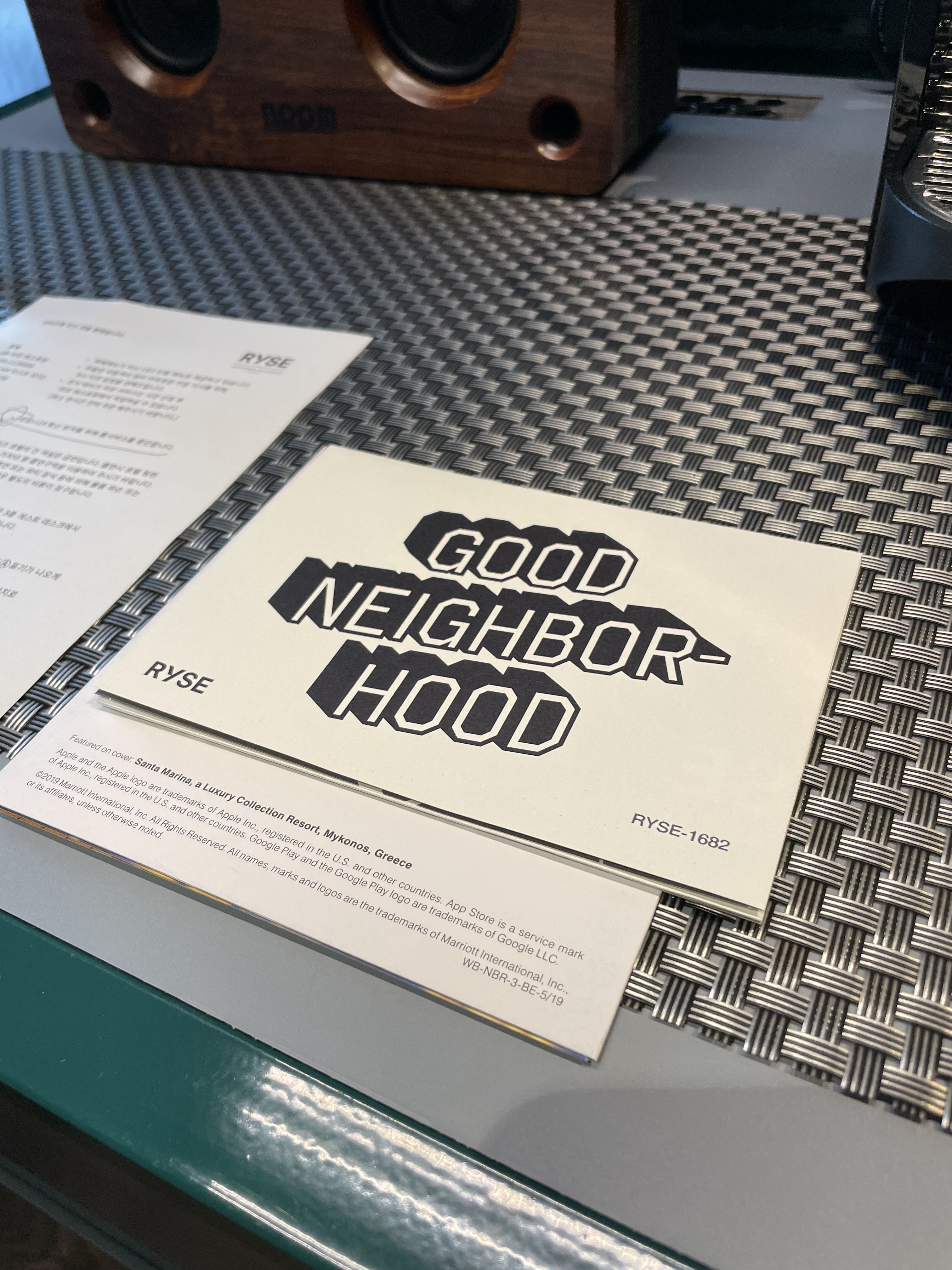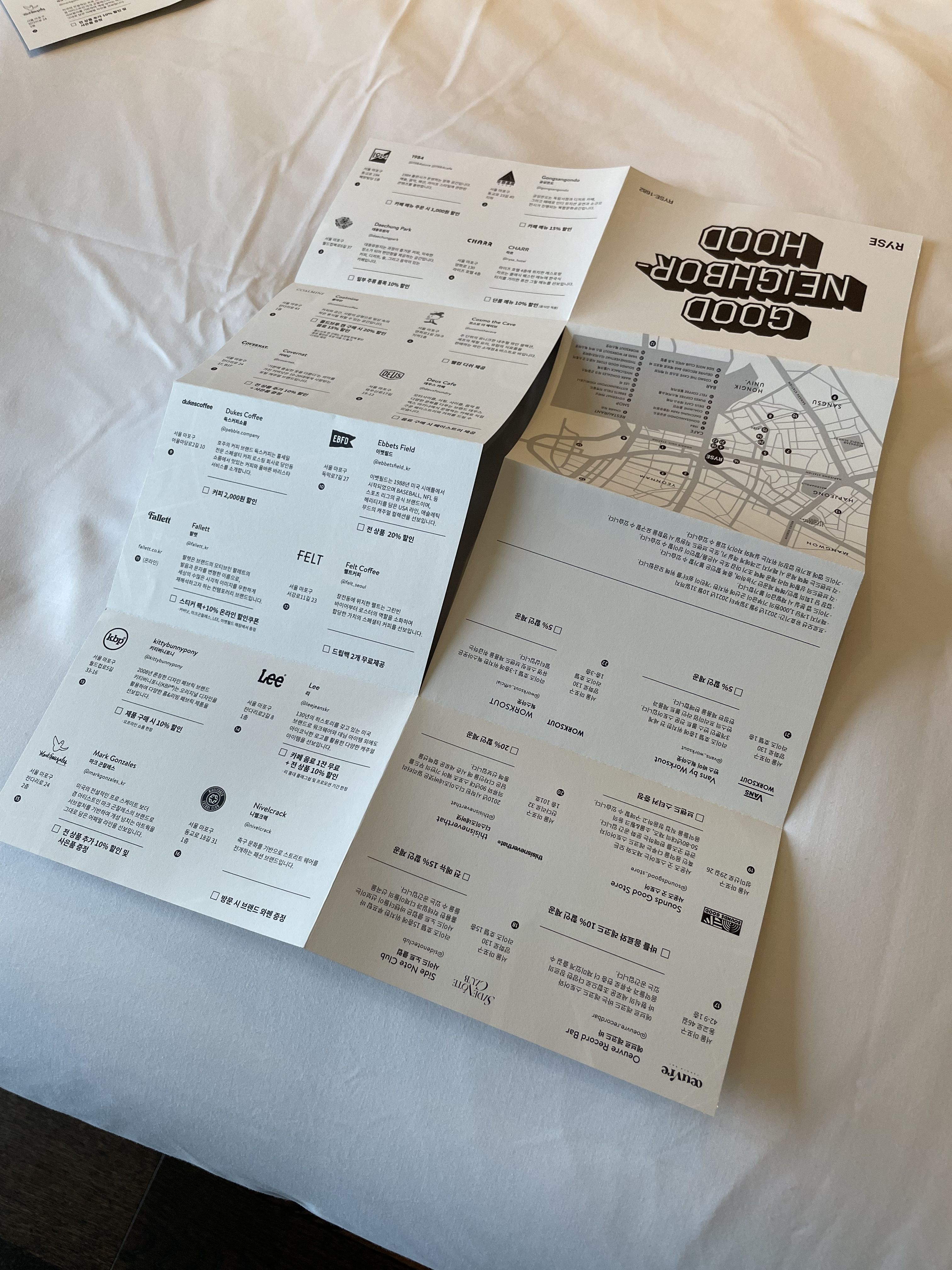 현재 라이즈 호텔에 투숙을 하게 되면 굿네이버후드라는 쿠폰북을 발급해주는데요, 라이즈 호텔 주변에 위치한 카페나 옷 매장 그리고 바 등을 할인된 가격으로 이용할 수 있어요.