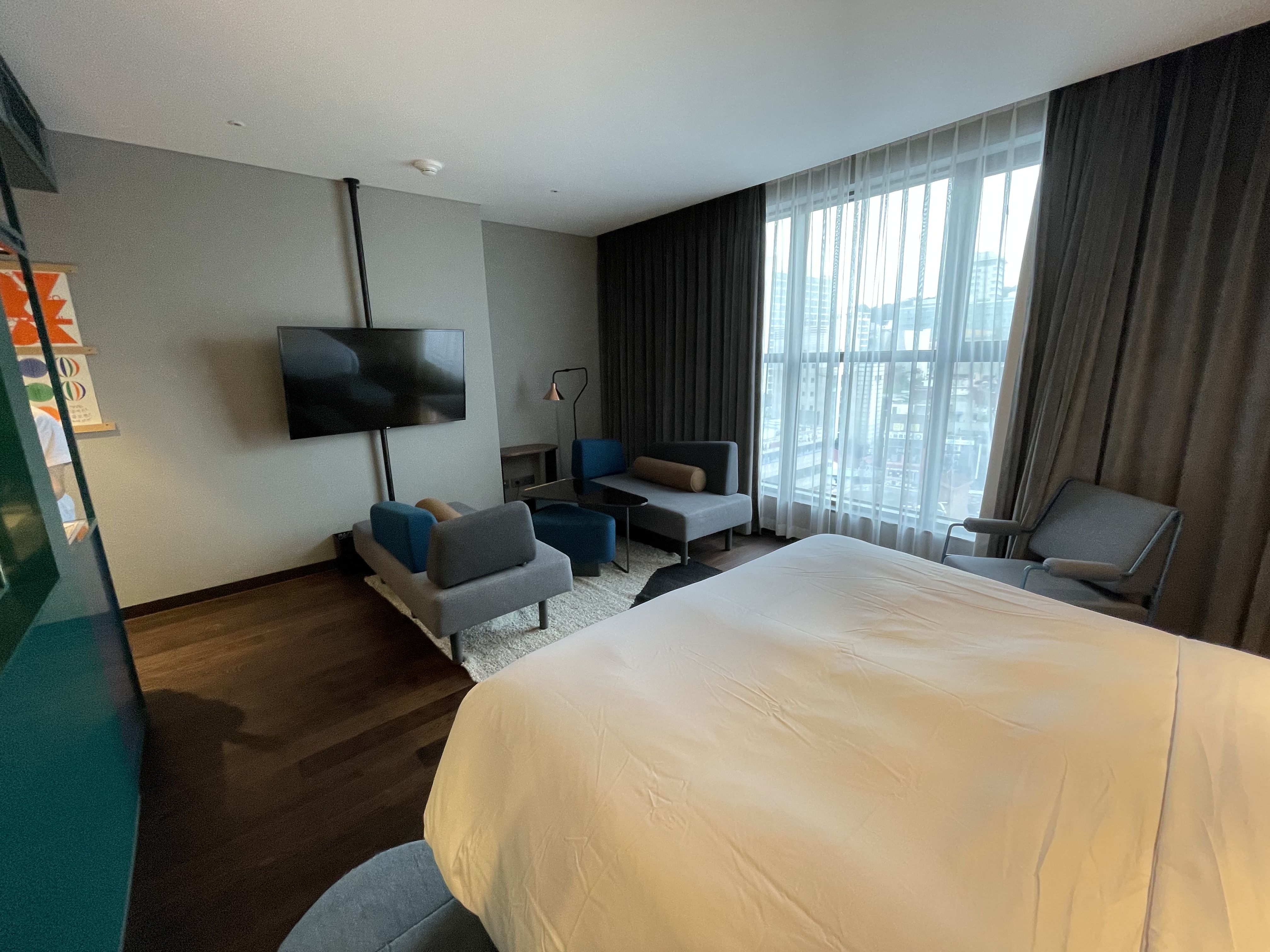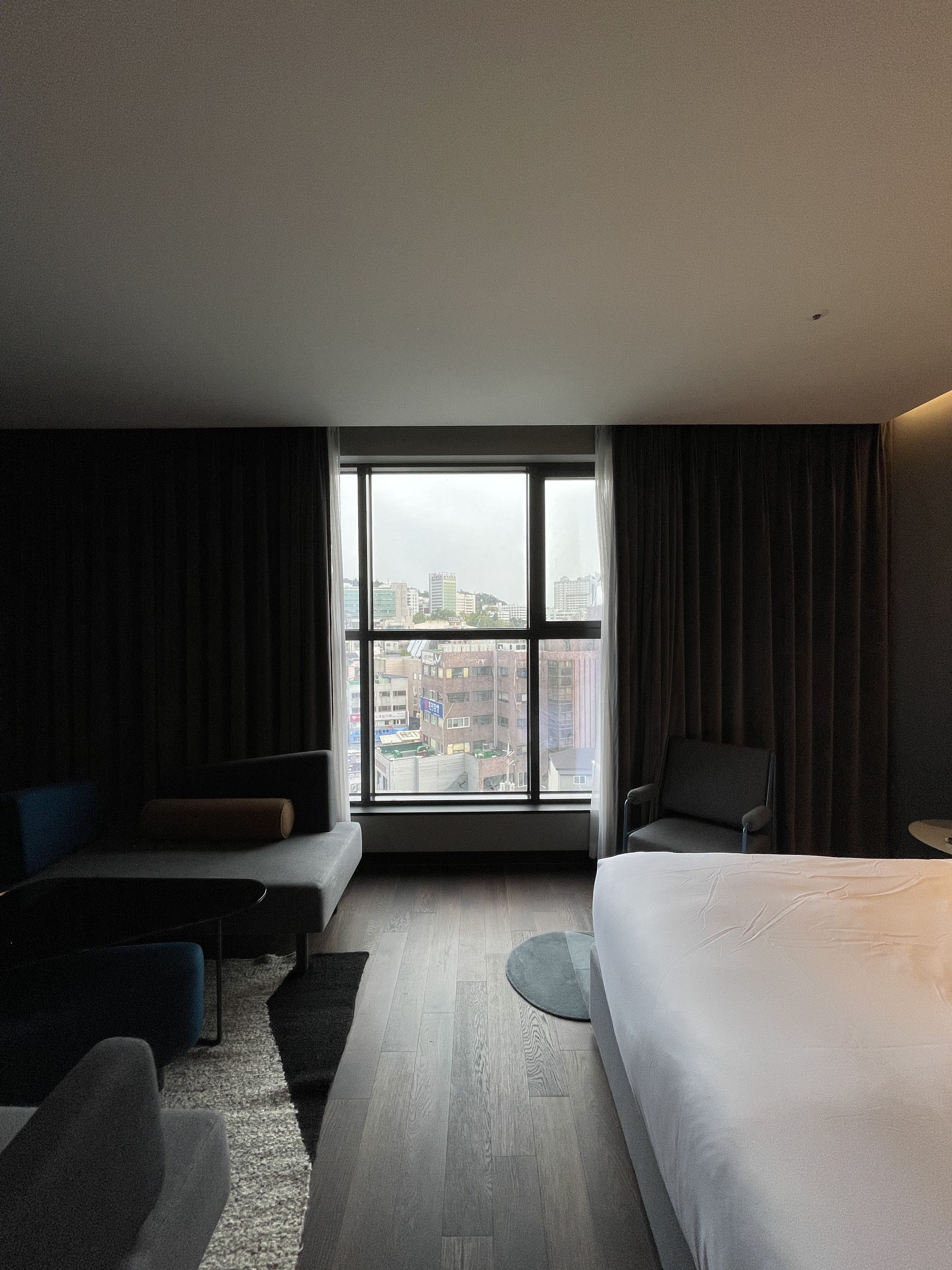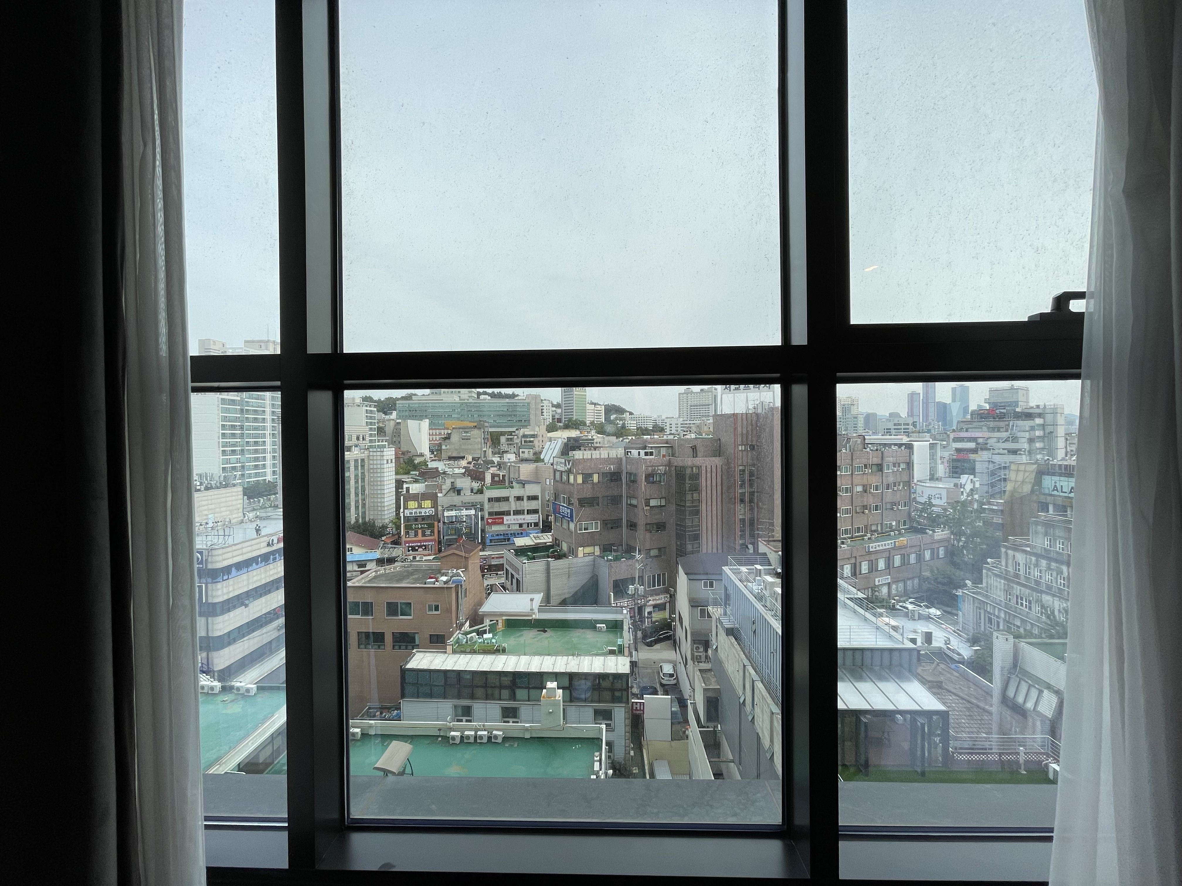 디렉터 스위트룸은 통창 너머로 홍대뷰를 볼 수 있어요. 이날 날씨가 우중충하기도 했지만 사실 시티뷰가 그렇게 이쁜 편은 아니더라고요. 차라리 야경이 보기에는 더 좋았습니다.