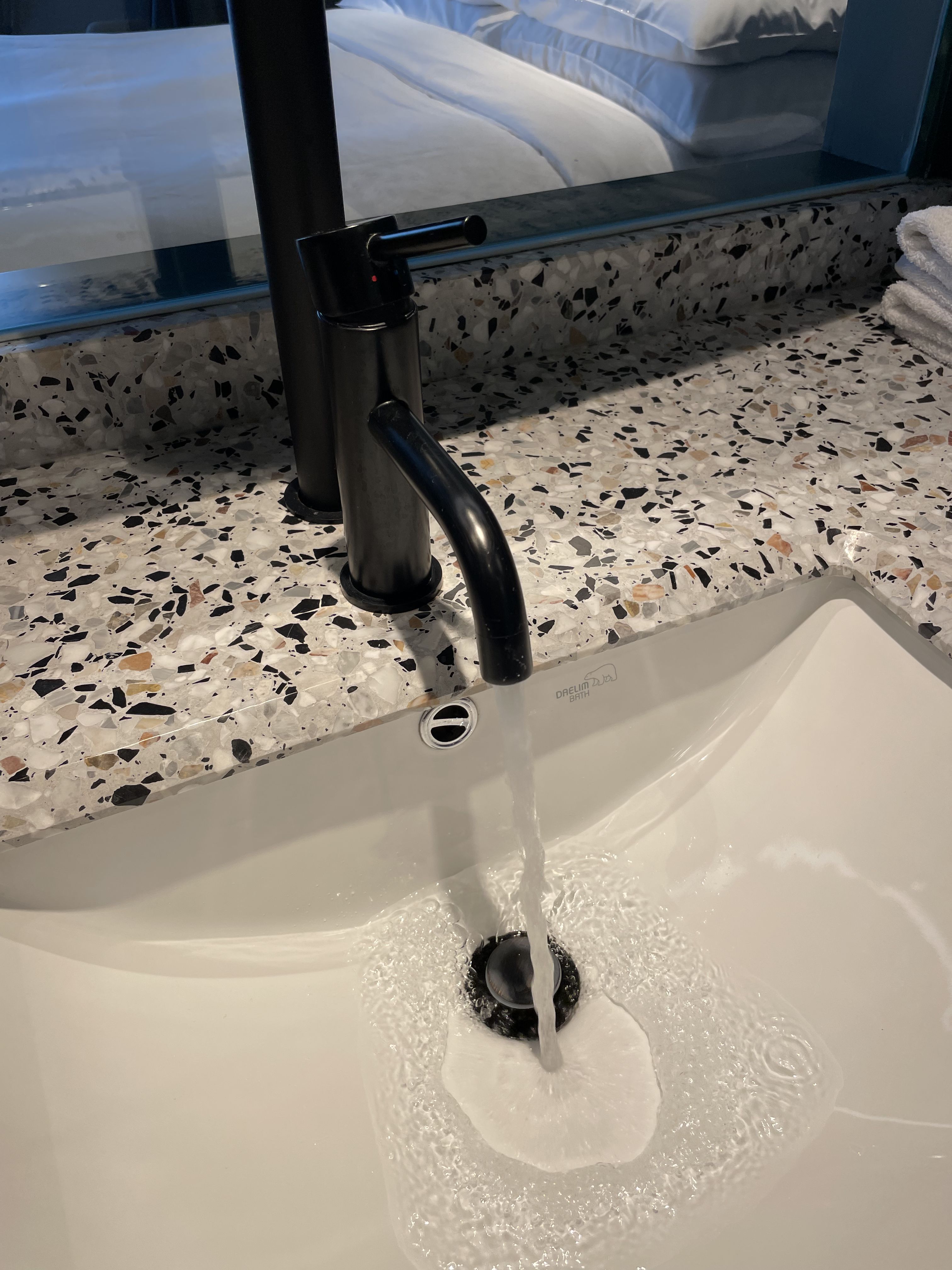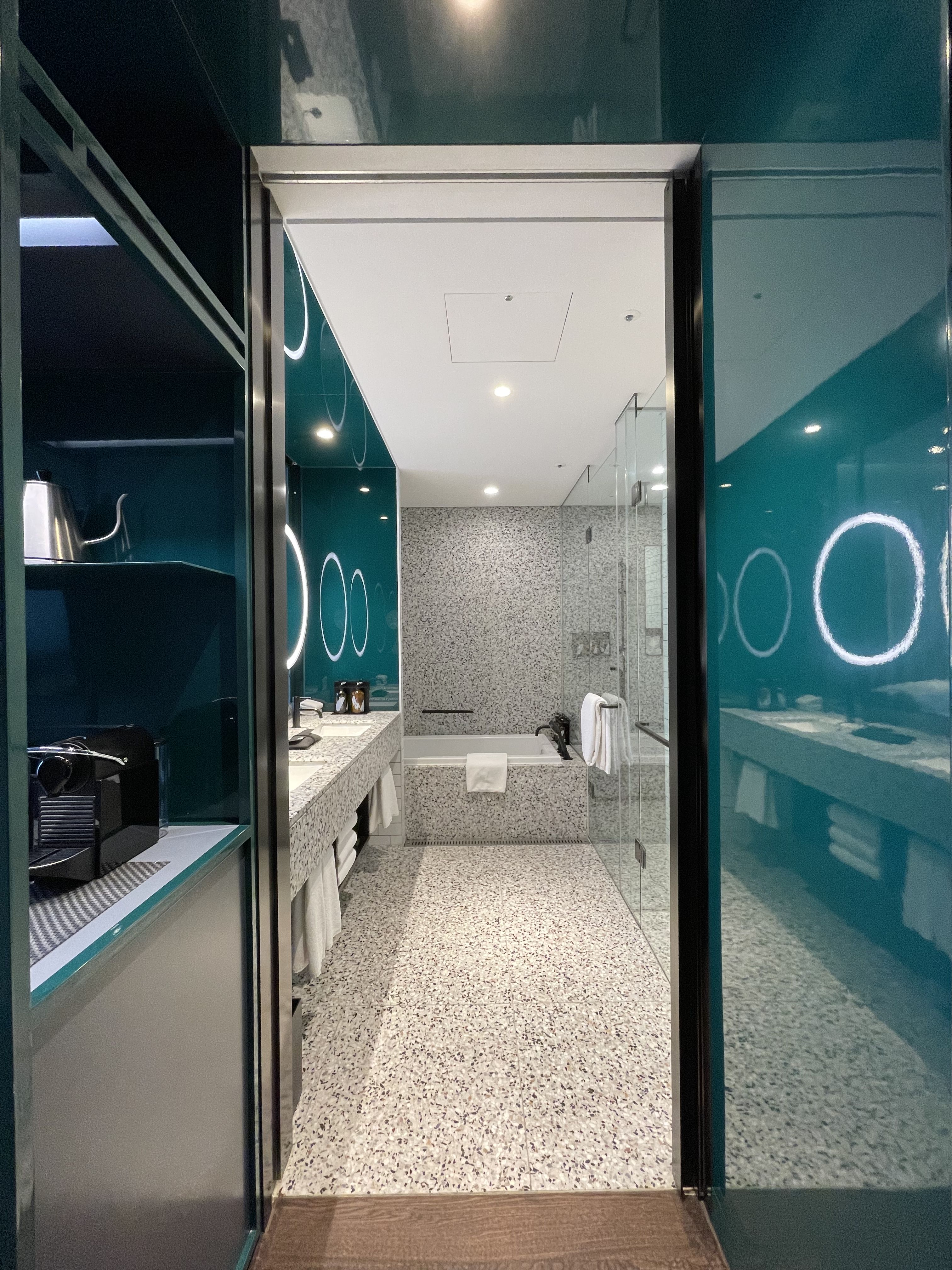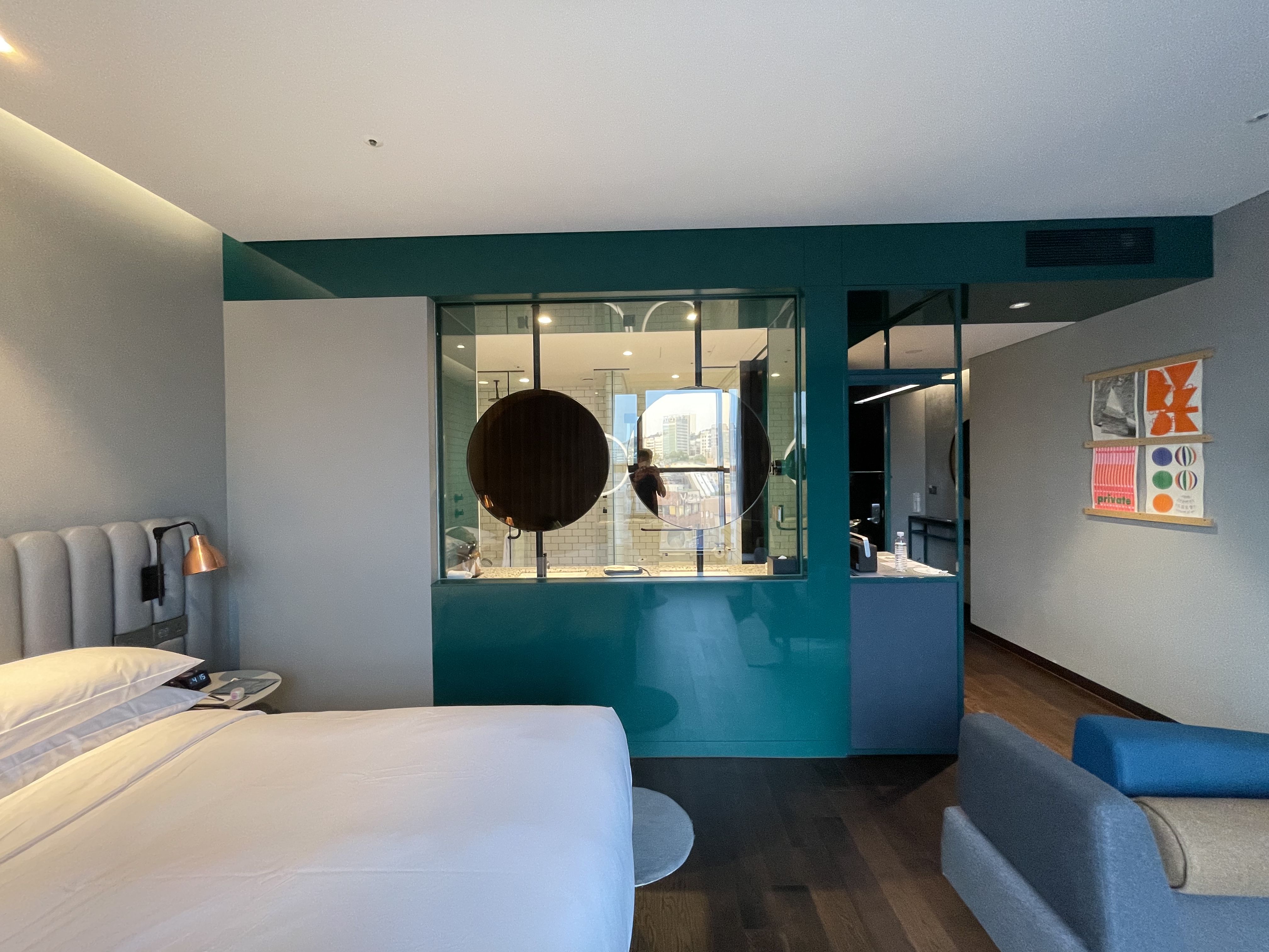 디렉터 스위트룸은 방 자체의 크기가 그렇게 크지 않은 대신 욕실의 크기가 큰 편이었어요. 성인 두 명이서 충분히 사용할 수 있는 세면대가 두 개나 있는 점이 마음에 들었는데요, 세면대 정면으로 블라인드를 열고 닫을 수 있어서 창밖의 시티뷰도 볼 수 있는 장점이 있었어요.