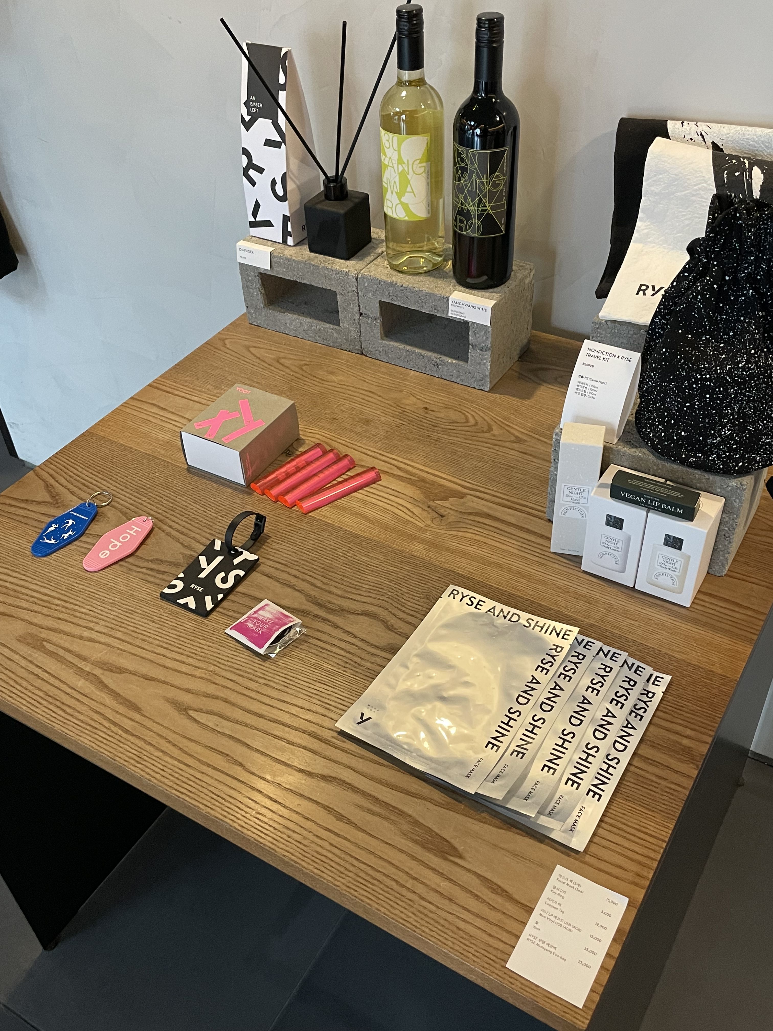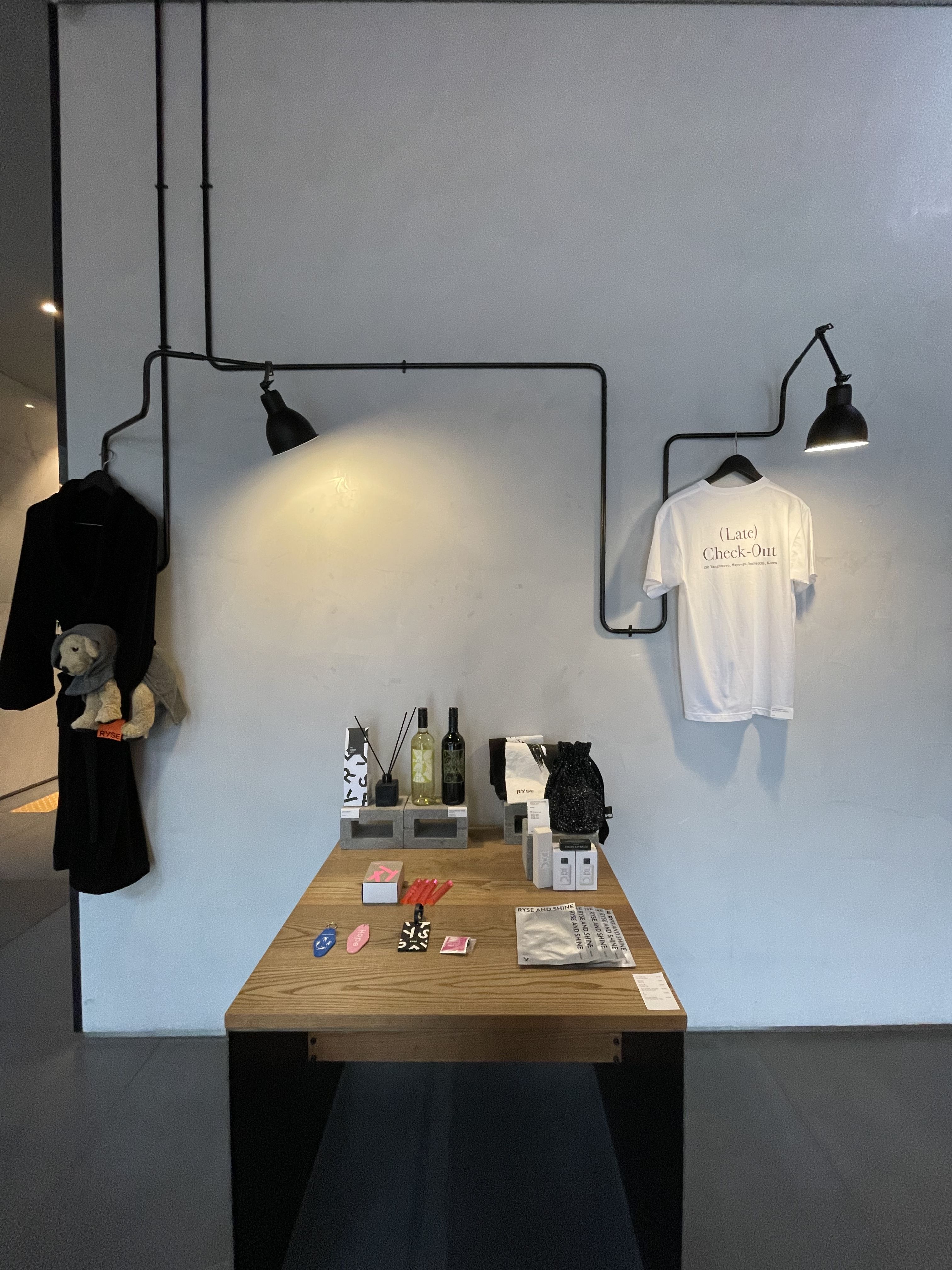 체크인을 기다리는 동안 로비 곳곳을 돌아다니면서 이것저것 구경했는데요, 소소하게 볼거리들이 있었어요. 로비 한편에는 티셔츠와 생활 잡화가 판매용으로 전시되어 있었어요. 오른쪽에 'Late Check Out'이라고 프린팅 되어 있는 흰색 티셔츠가 눈에 띄더라고요.