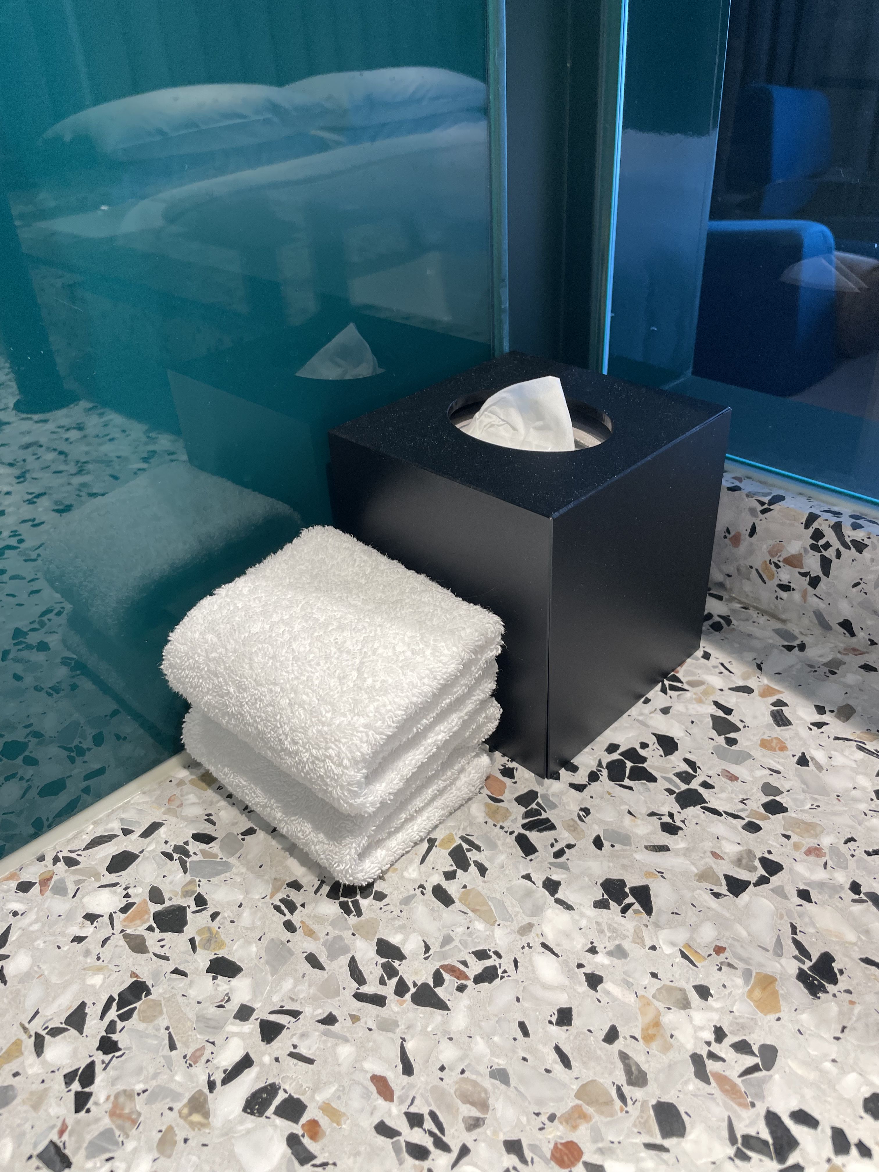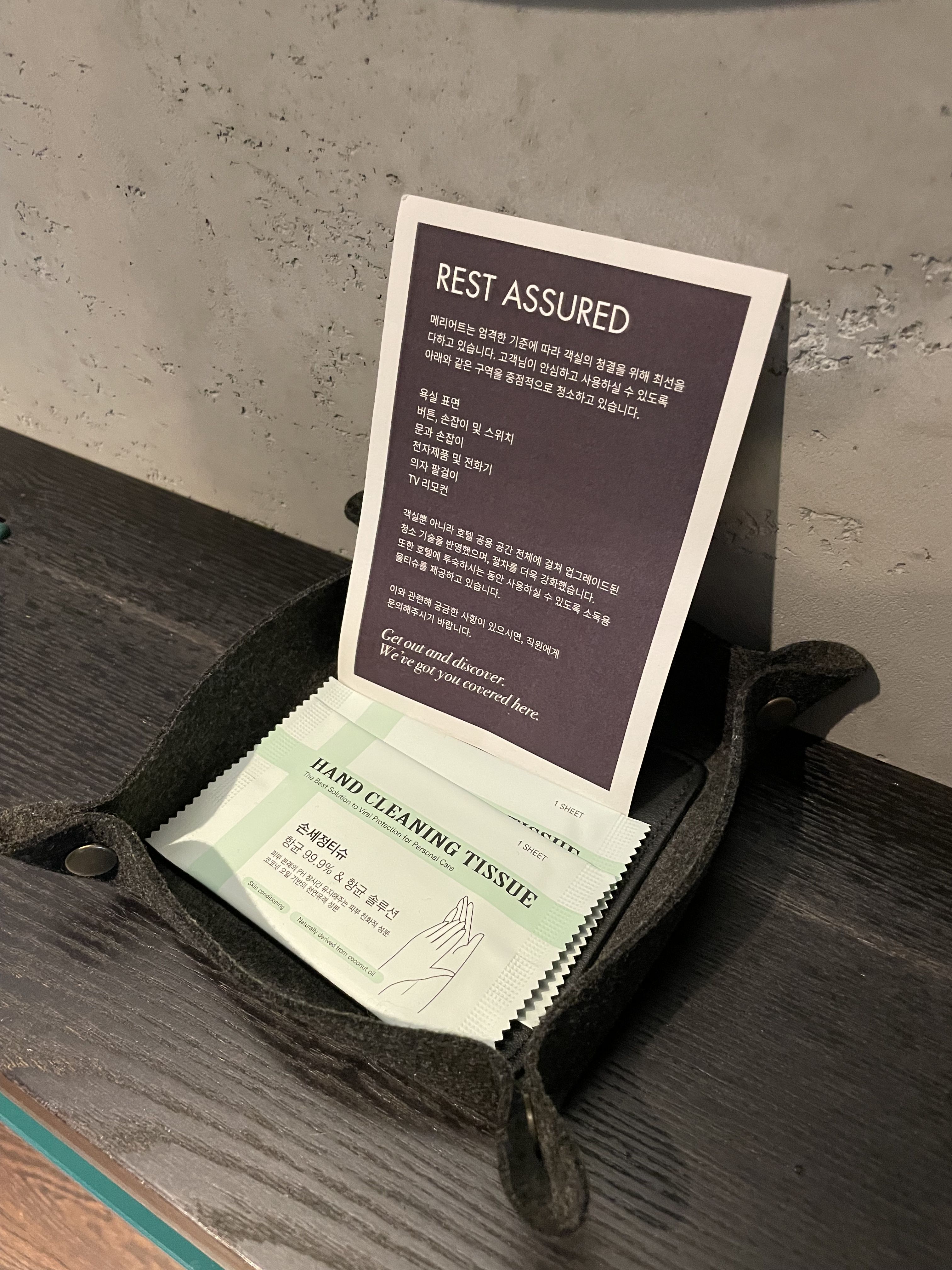그리고 왼편에는 객실의 청결을 위해 매일 청소를 하고 있다는 안내 문구와 손세정 티슈가 구비되어 있었어요. 아무래도 코로나로 인해 느낄 수 있는 숙박에 대한 불안감을 조금이나마 해소시켜줘서 안심하고 이용할 수 있었습니다.