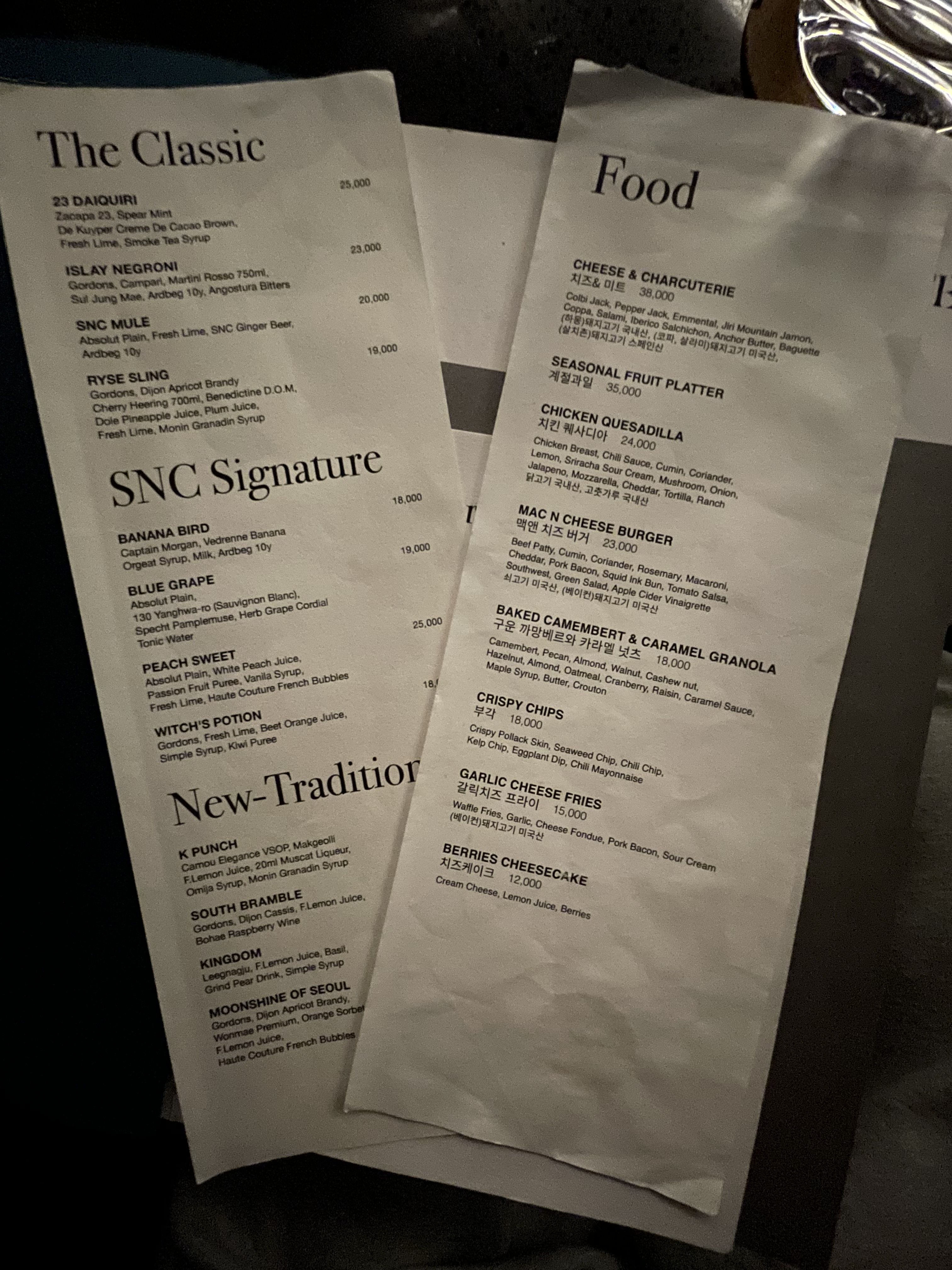 사이드 노트 클럽은 루프탑이 워낙 유명하고 인기 많은 공간이라 예약을 하지 않으면 앉기가 힘들다고 하더라고요. 하지만 당시 배가 너무 고파서 아쉬운 마음으로 실내에 자리를 잡고 음식과 칵테일을 주문했어요.