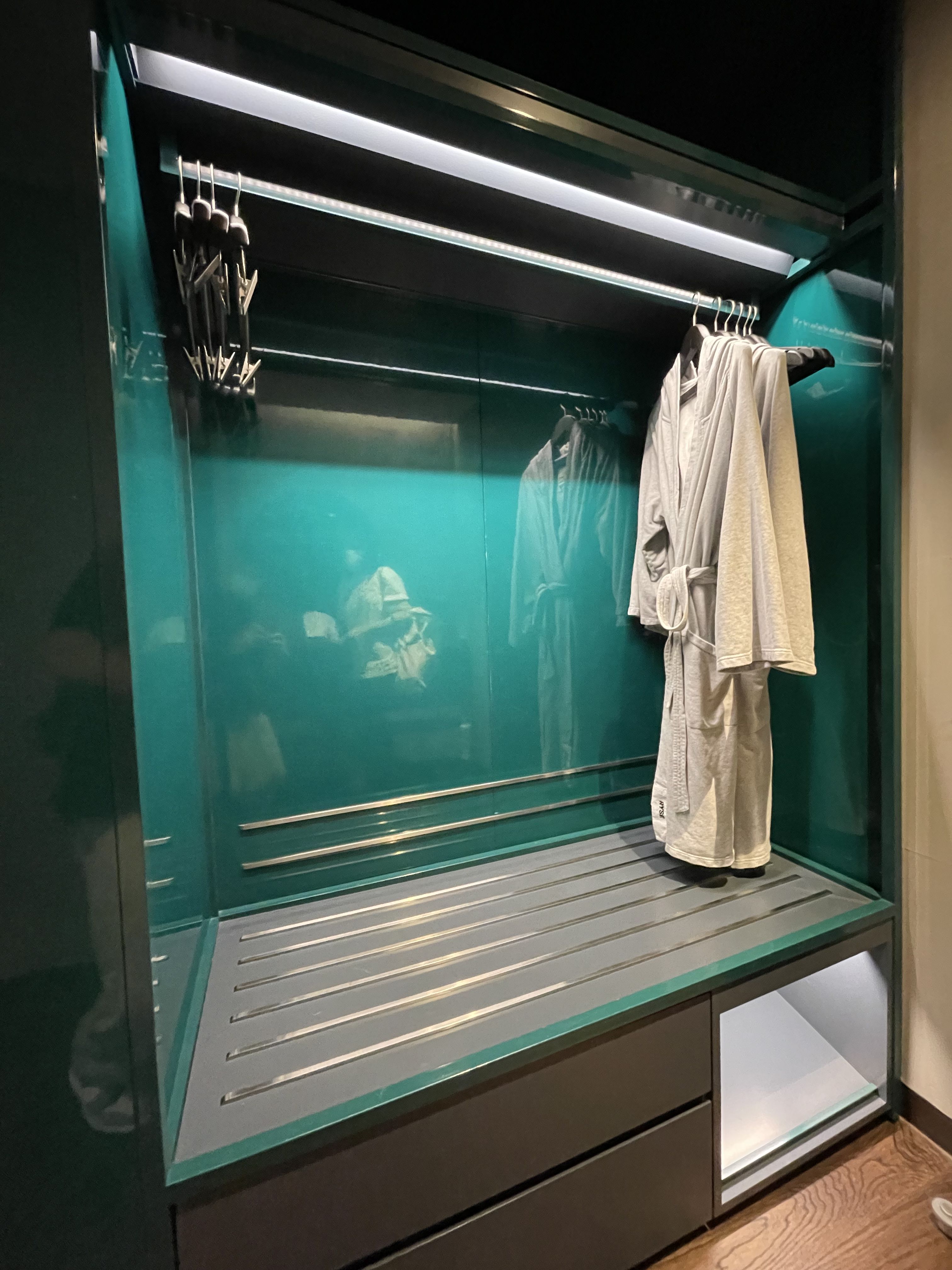 일단 방문을 열고 들어서면 오른쪽에 큰 옷장이 자리 잡고 있어요. 후드가 달린 가운 두 벌과 여분의 옷걸이도 넉넉하게 준비되어 있습니다.