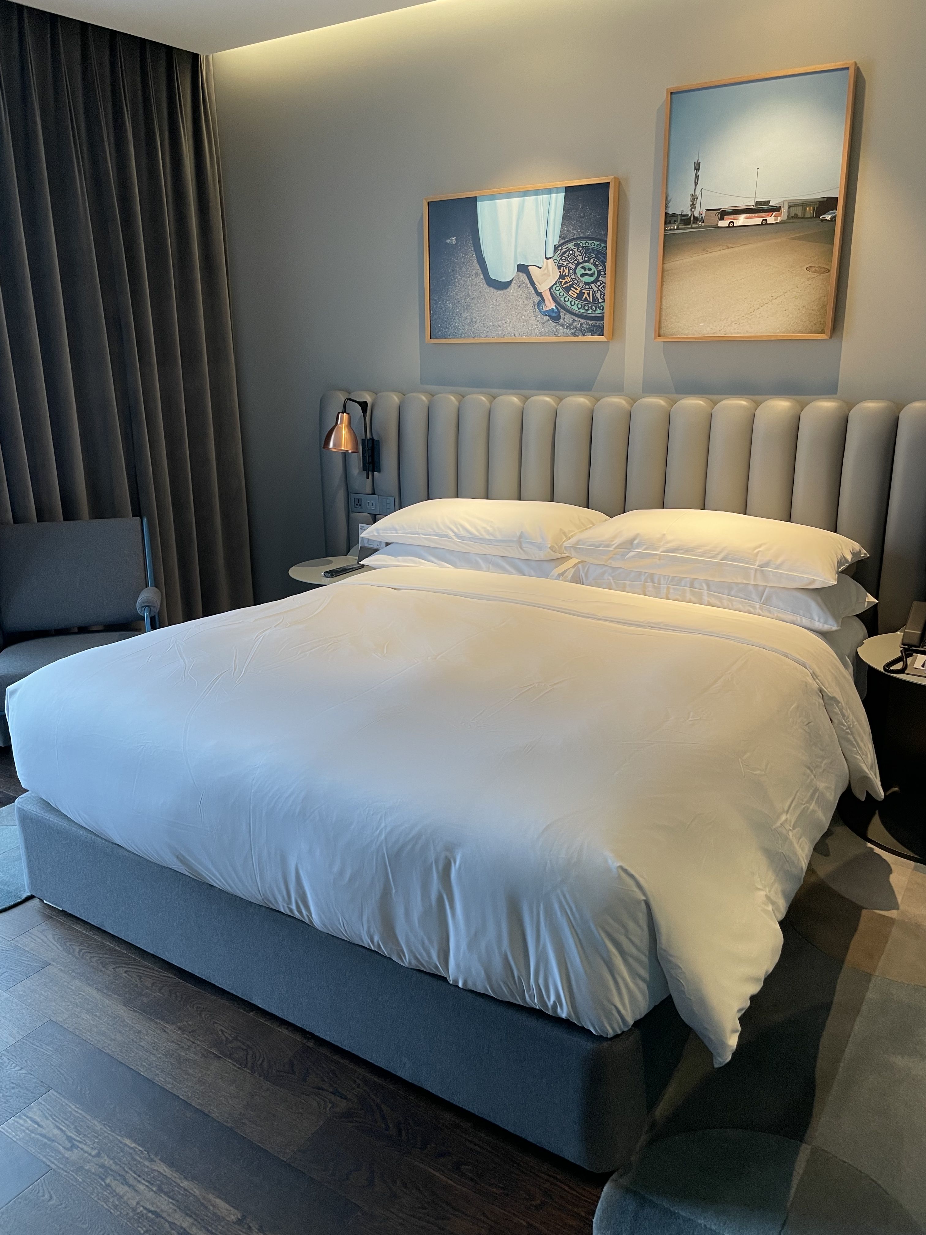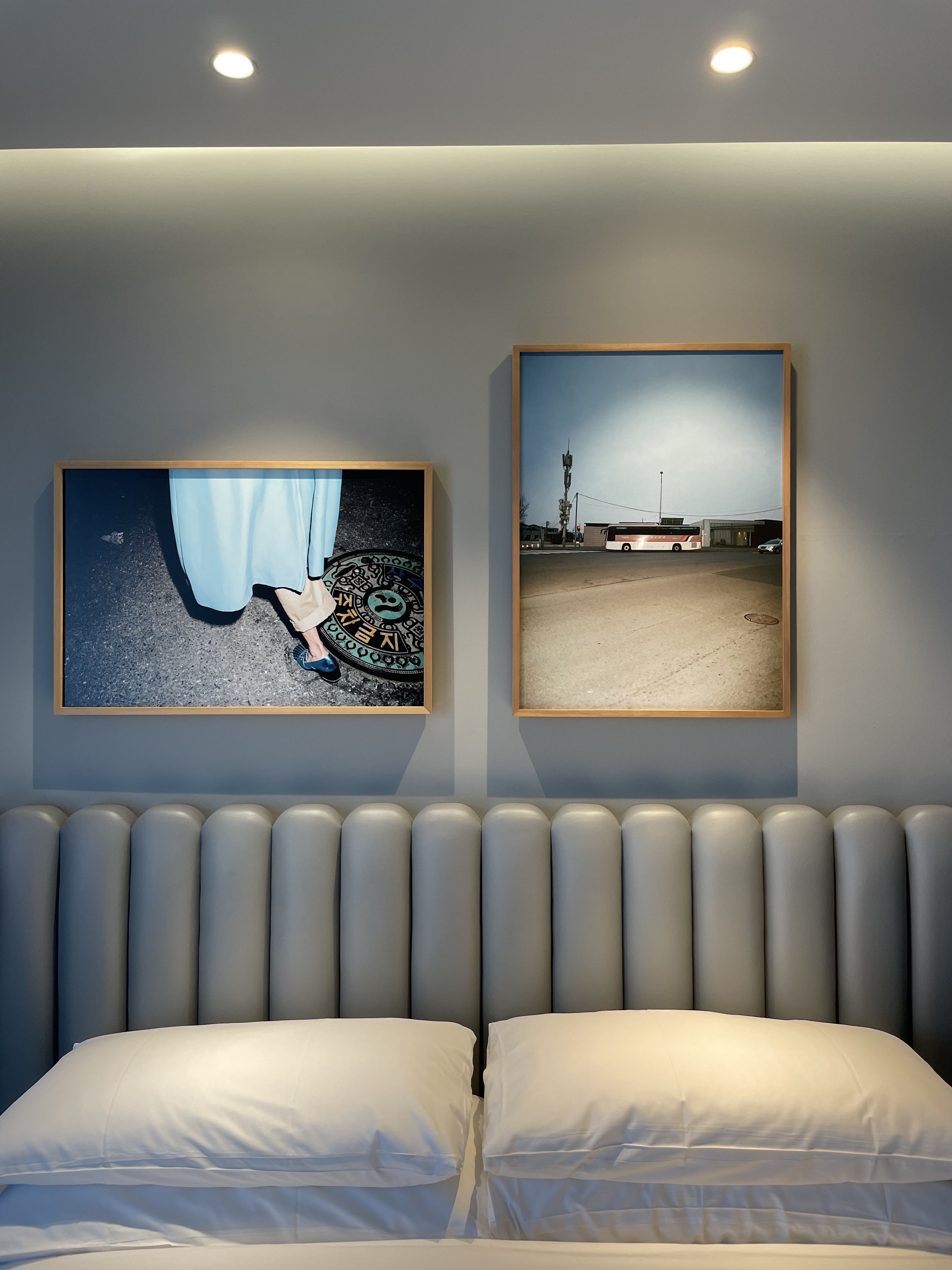 침대 위에는 액자 두 개가 걸려 있었는데요, 외국에서 찍은 사진처럼 보였지만 가까이서 보니 국내에서 찍은 듯한 사진이었어요. 호텔 자체는 모던한 느낌의 해외 인테리어지만 이런 요소에서 한국적인 느낌을 받을 수 있는 재밌는 디테일이었습니다.