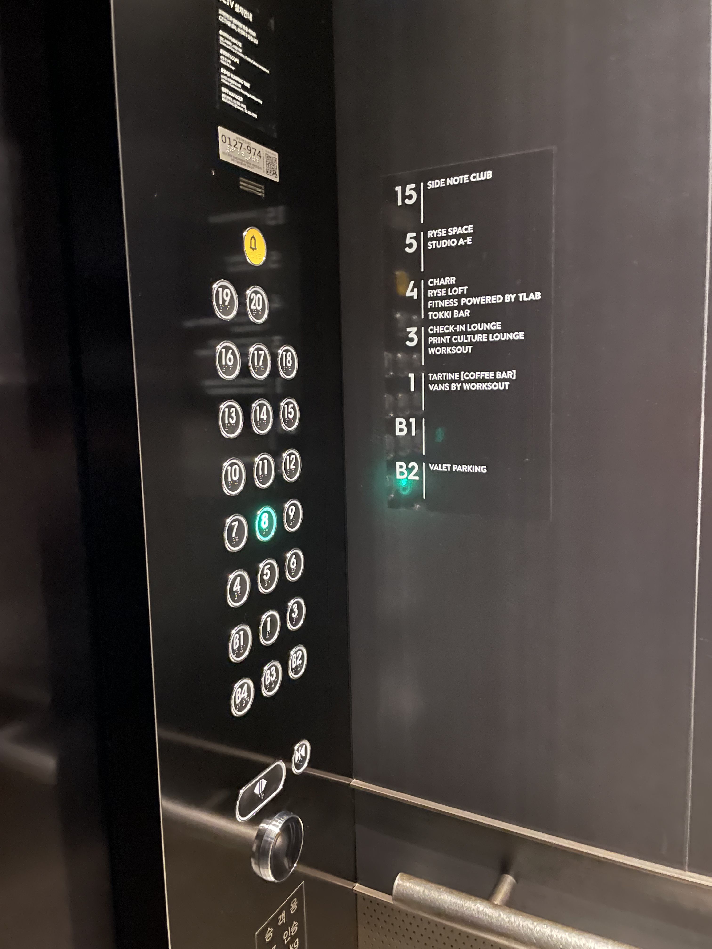 체크인 접수를 완료하고 8층 방을 배정받아 엘리베이터를 타고 올라갔어요. 참고로 라이즈 오토그래프 컬렉션 건물의 4층에는 피트니스 센터가 위치해 있고, 제일 꼭대기인 15층에는 사이드 노트 클럽이라는 루프탑 바가 있어요.