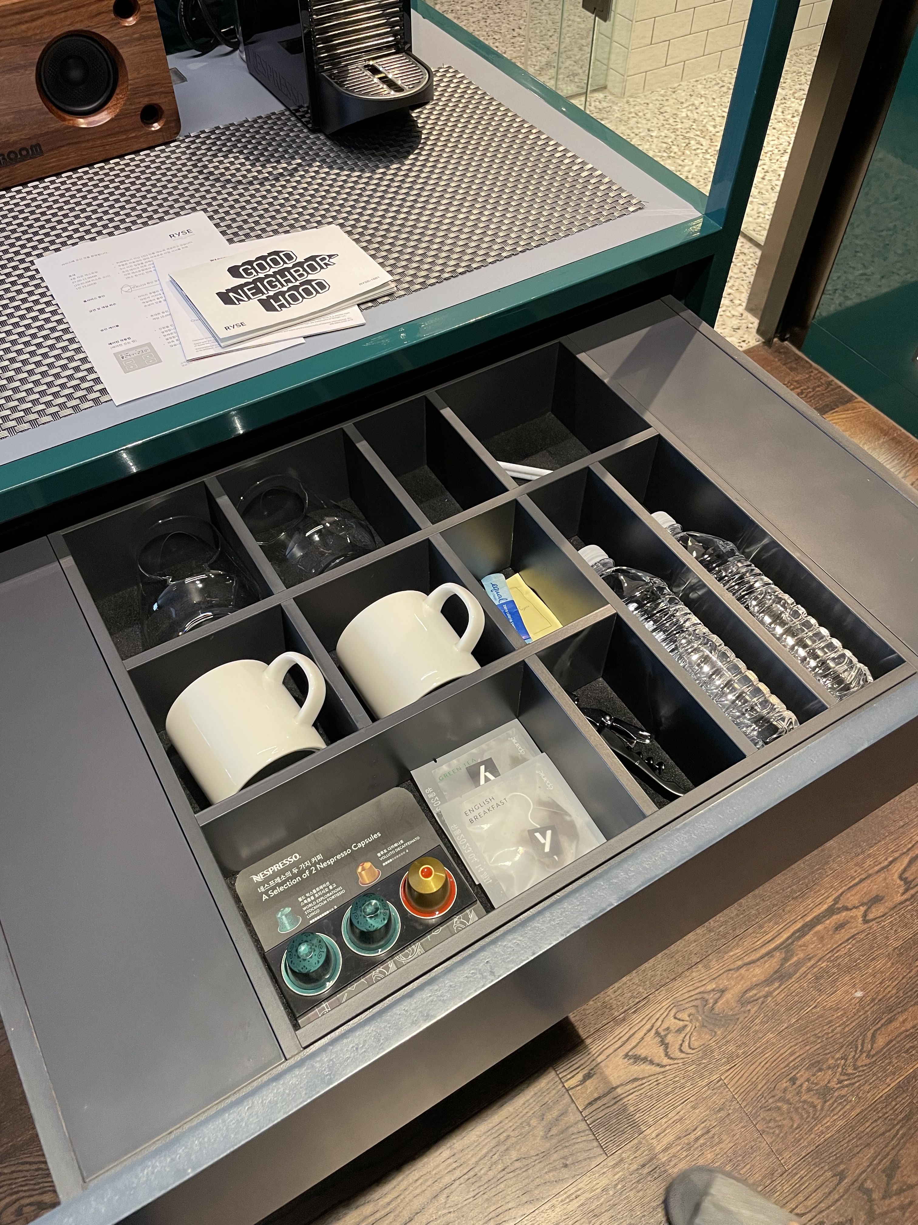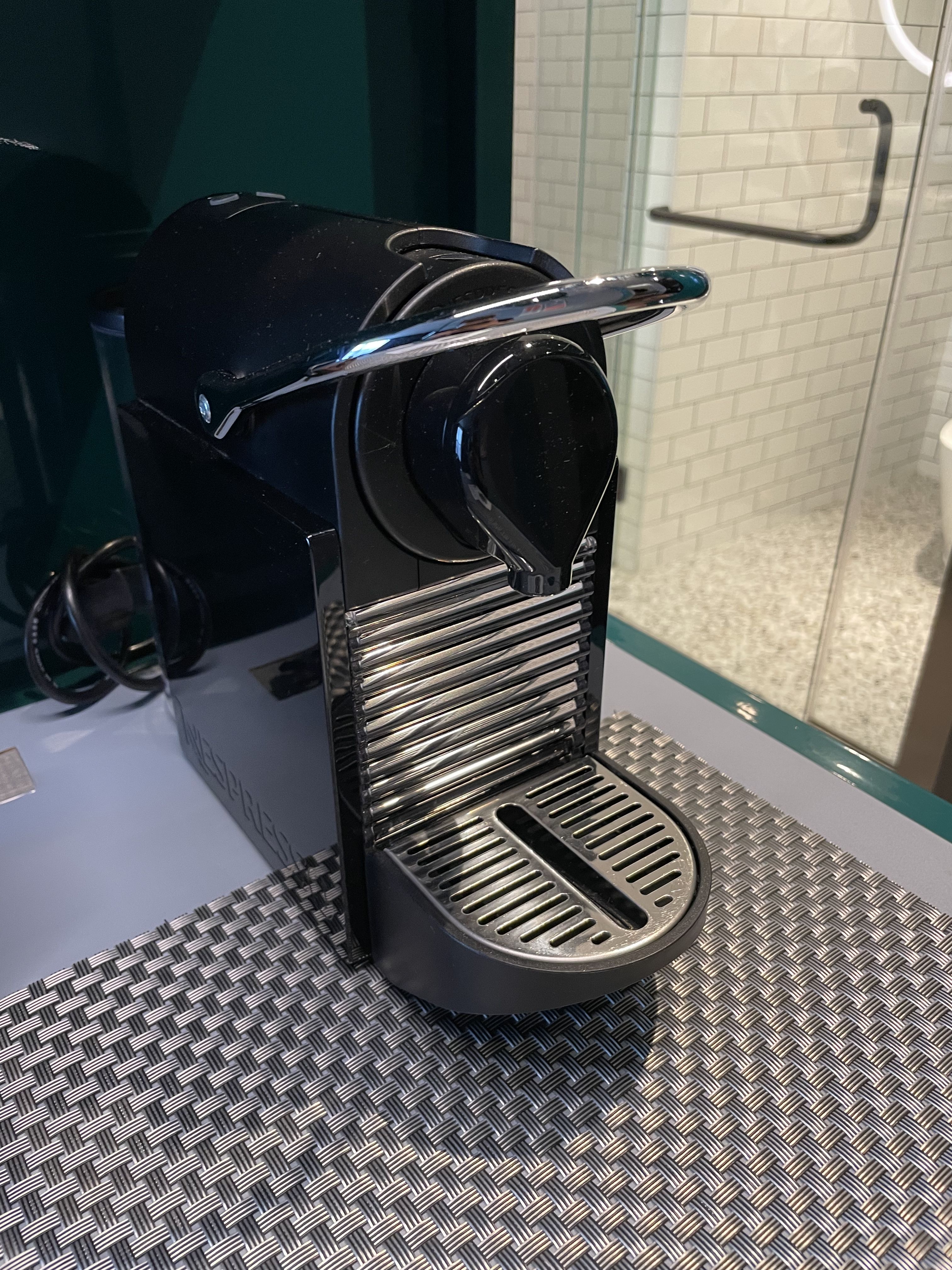 방과 화장실 사이에 위치한 미니바에는 커피 포트와 캡슐 커피 머신 그리고 음악을 들을 수 있는 블루투스 스피커가 놓여 있었어요.