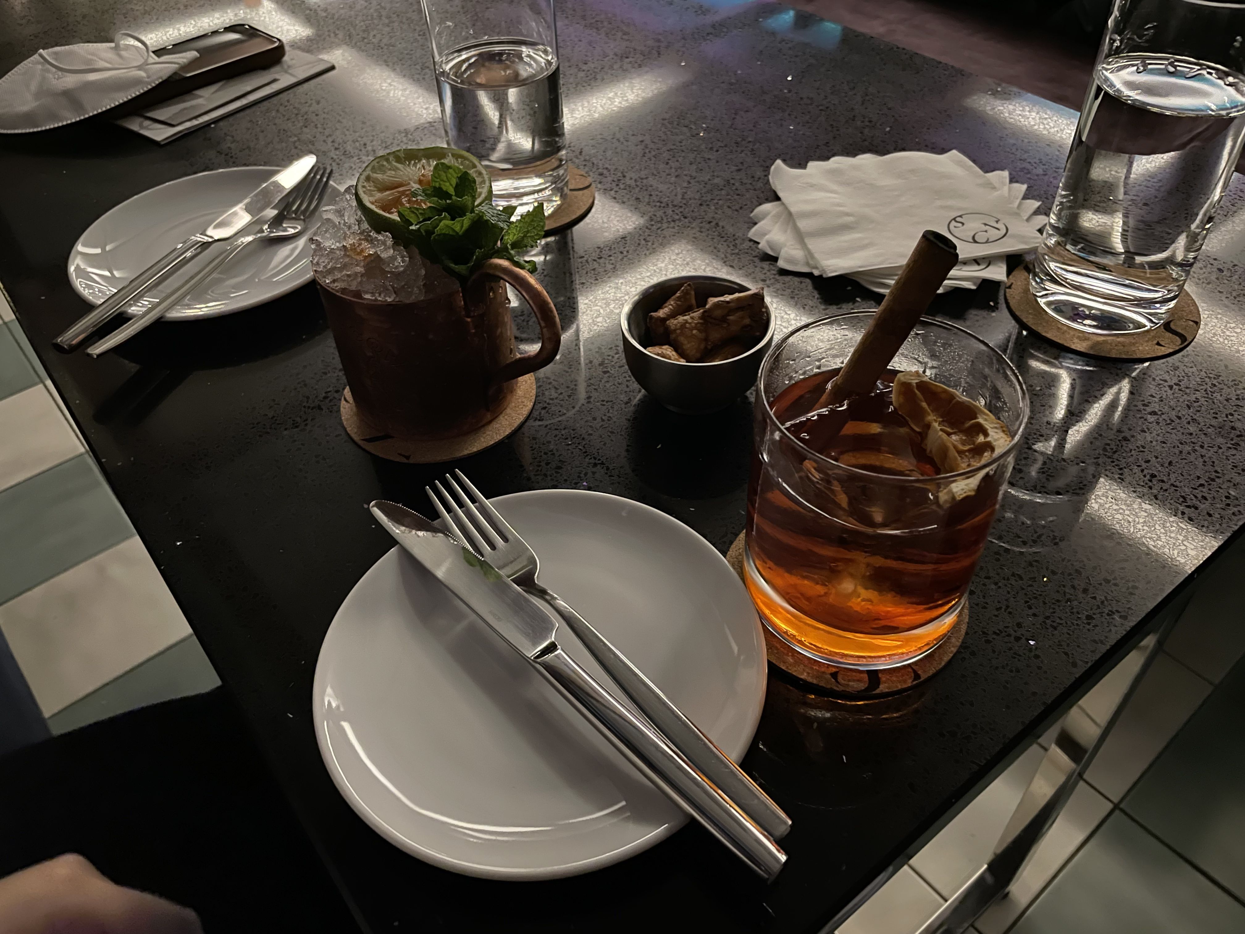 두 명이서 먹을 수 있는 음식의 종류가 많지 않아서 무난한 치킨 퀘사디아를 선택했고, 칵테일은 과일맛이 나는 달달한 맛과 한국 전통주 느낌의 도수가 센 거로 두 잔 주문했는데 바텐더가 이것저것 추천해준 거라 이름이 기억나지 않네요.