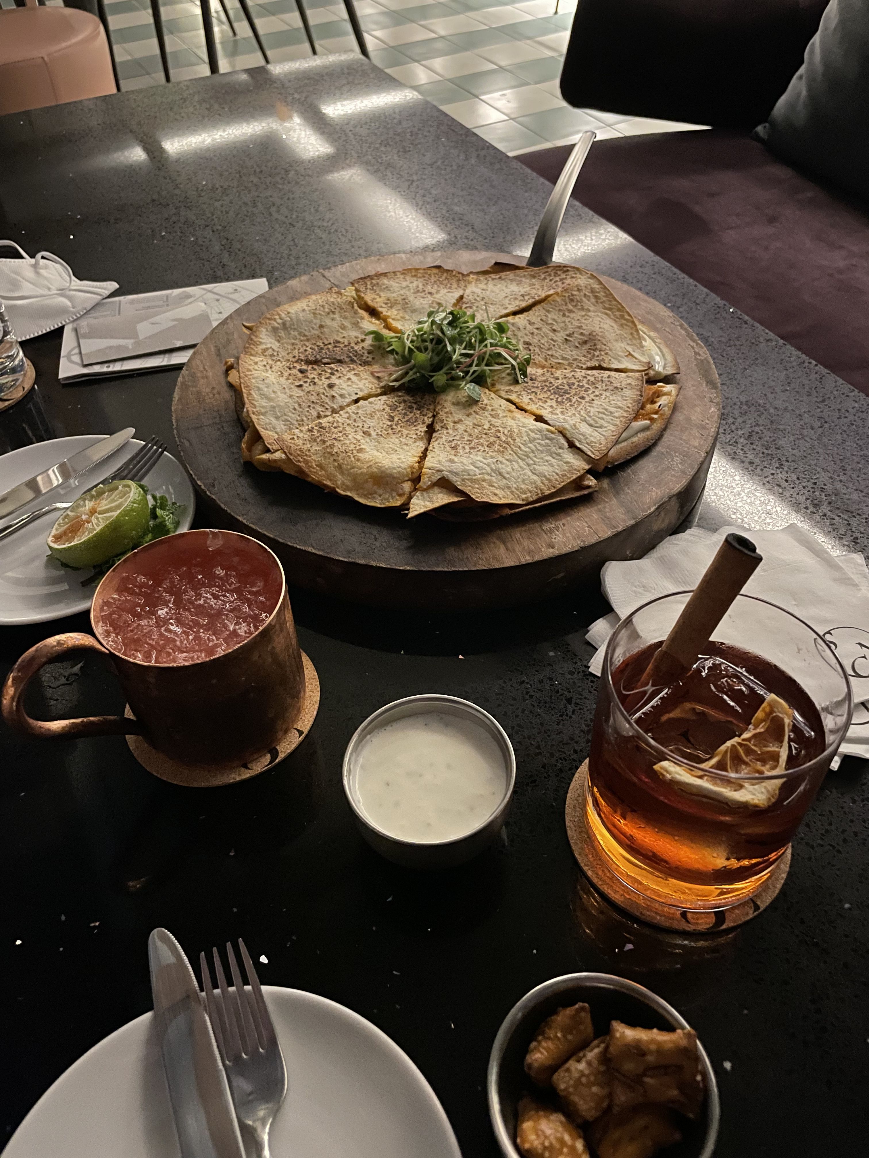 주문한 칵테일과 음식이 모두 나왔어요. 치킨 퀘사디아는 얇은 피자를 두 겹으로 겹쳐서 안에 치킨 토핑이 들어간 맛이었어요. 각종 채소와 양념도 잘 어우러져서 맛있게 먹을 수 있었어요.