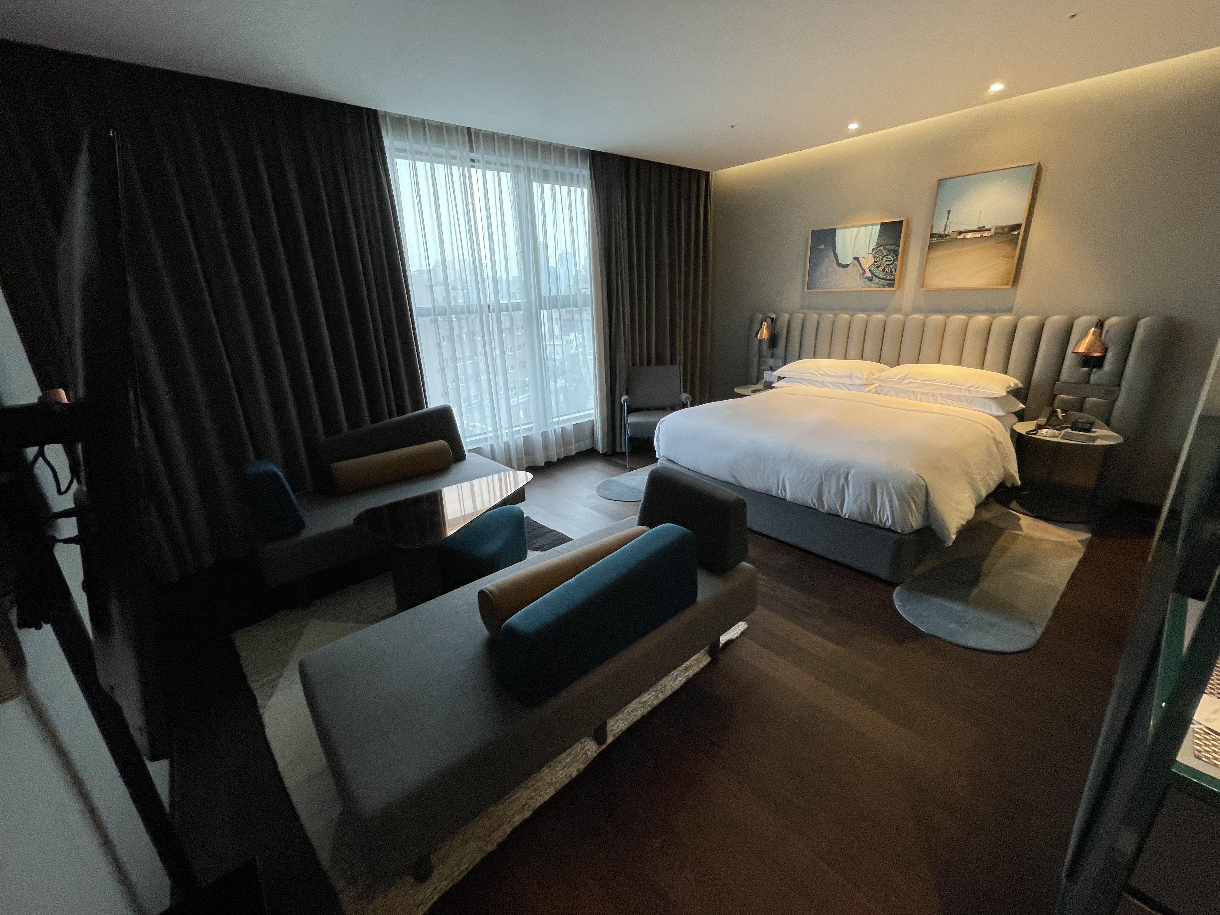 제가 배정받은 8층 디렉터 스위트룸의 모습인데요, 방 자체의 크기는 그렇게 크지 않았어요. 더블베드와 소파, TV 그리고 큰 통창이 있어 답답함을 덜어줬어요.