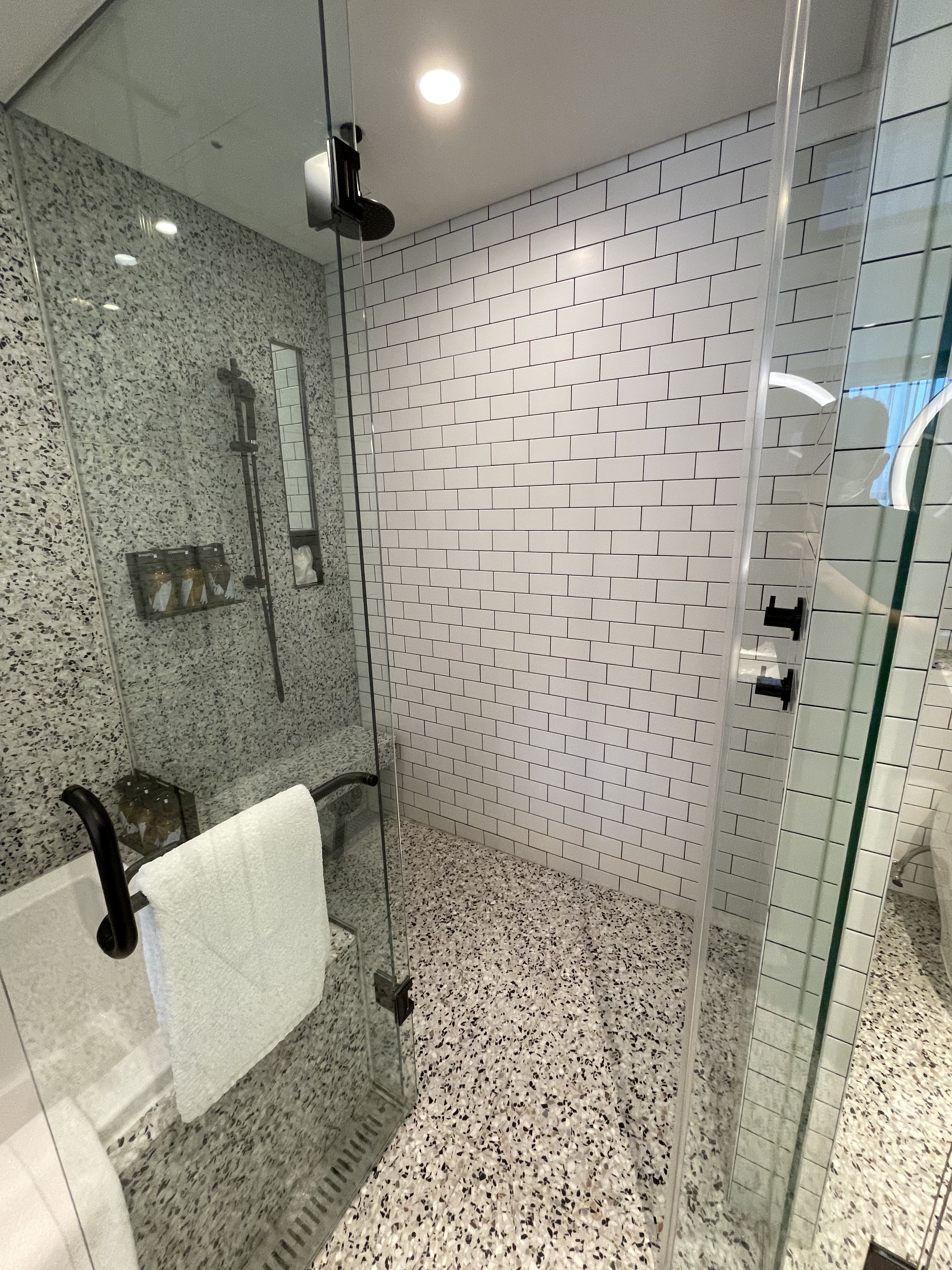 그리고 샤워 부스의 크기도 상당히 큰 편이었는데요, 샴푸와 컨디셔너, 바디워시가 구비되어 있고, 샤워볼까지 준비되어 있었던 점이 너무 좋았어요.