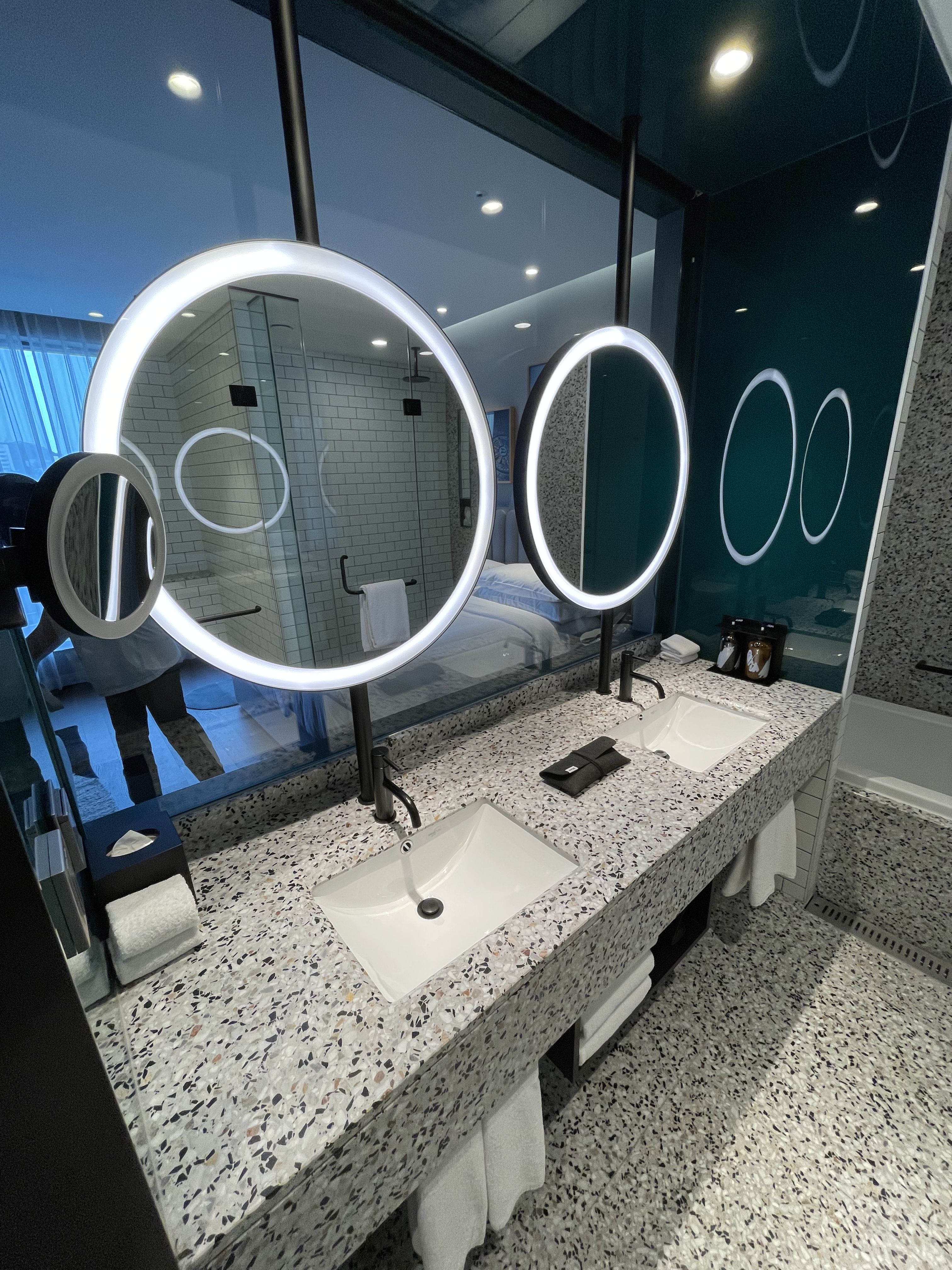 디렉터 스위트룸은 방 자체의 크기가 그렇게 크지 않은 대신 욕실의 크기가 큰 편이었어요. 성인 두 명이서 충분히 사용할 수 있는 세면대가 두 개나 있는 점이 마음에 들었는데요, 세면대 정면으로 블라인드를 열고 닫을 수 있어서 창밖의 시티뷰도 볼 수 있는 장점이 있었어요.