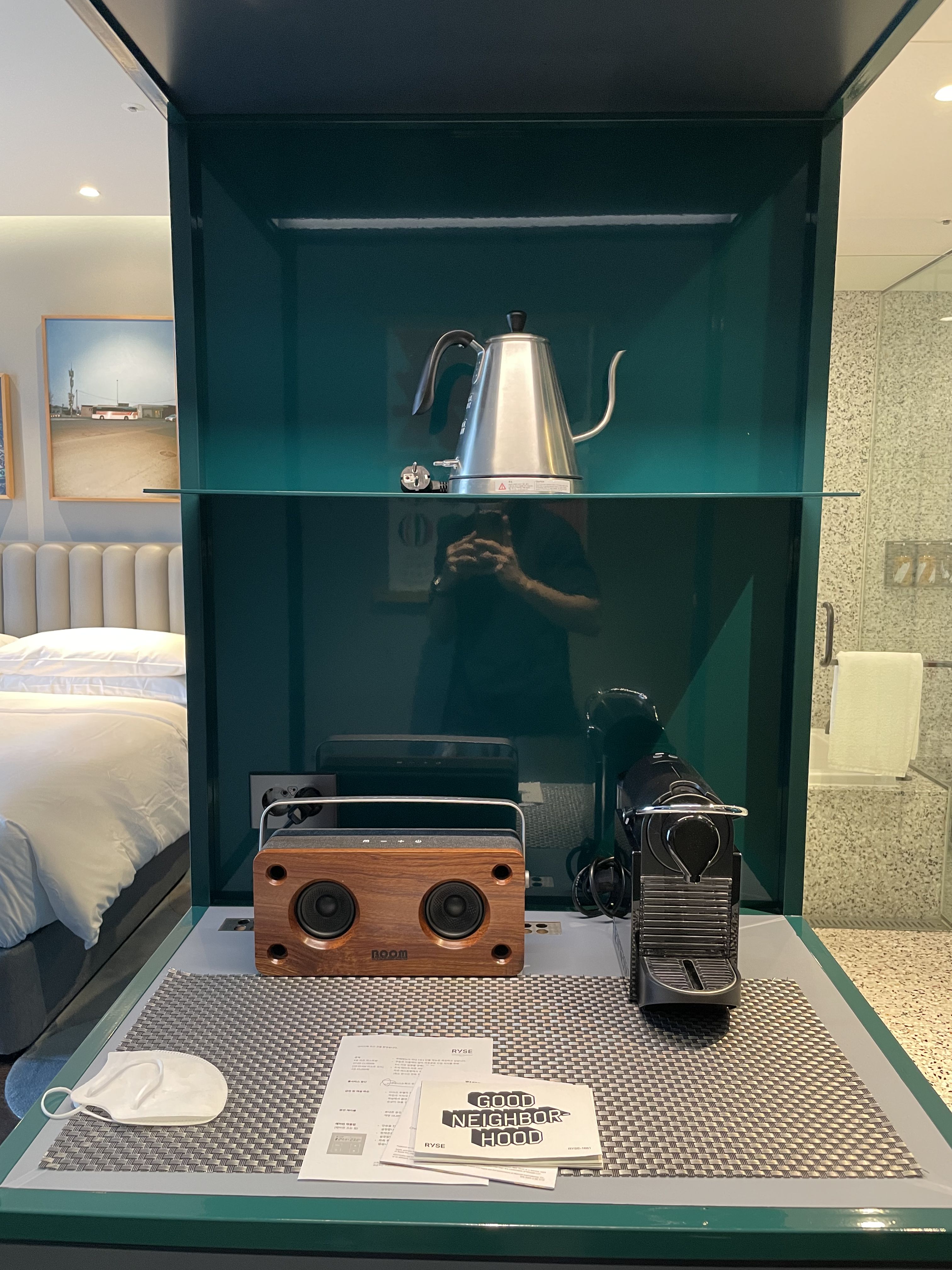 방과 화장실 사이에 위치한 미니바에는 커피 포트와 캡슐 커피 머신 그리고 음악을 들을 수 있는 블루투스 스피커가 놓여 있었어요.