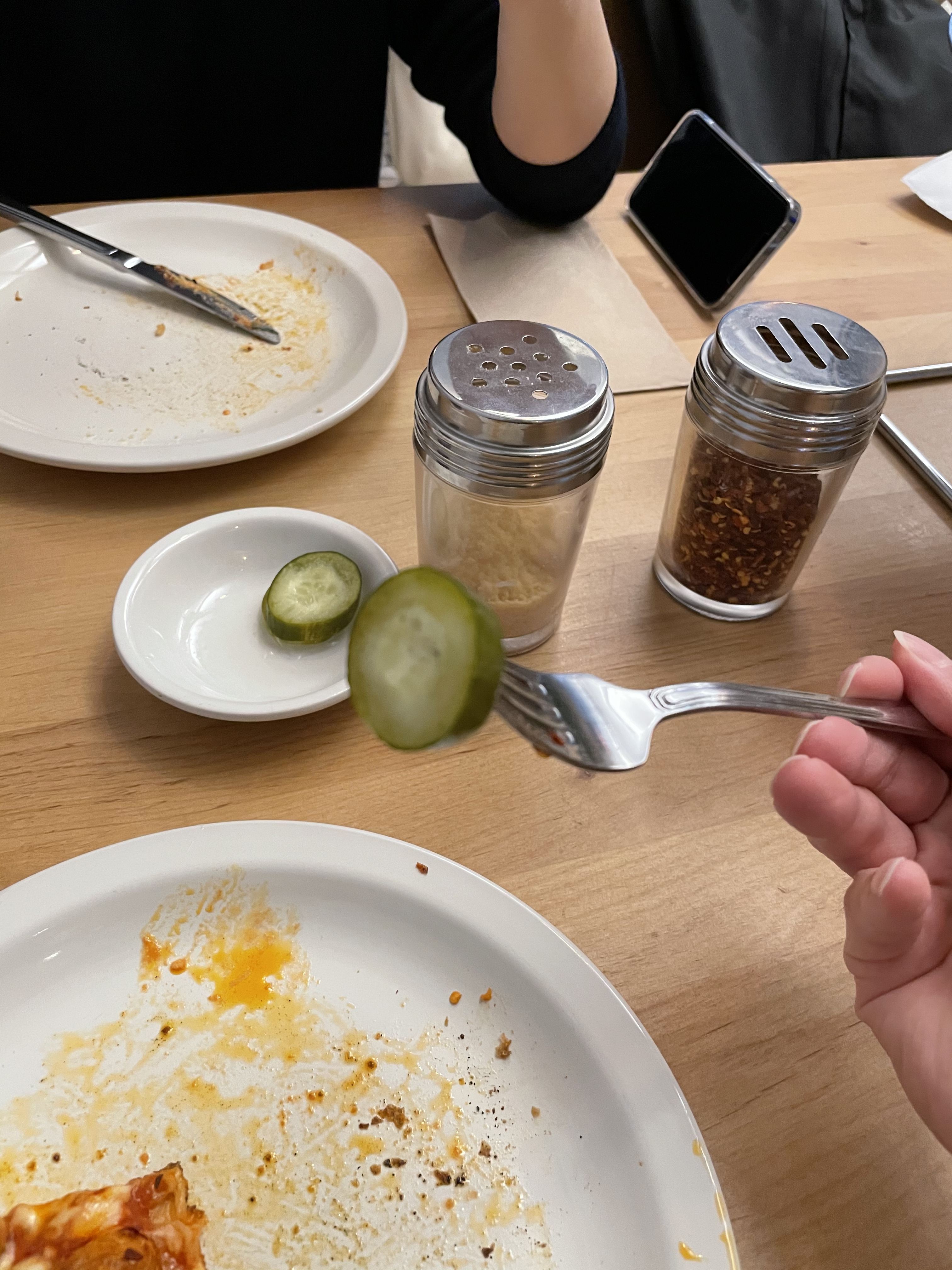 치즈가 부족하신 분들은 테이블에 구비된 파마산 치즈가루를 뿌려서 먹을 수도 있어요. 피클도 계속 리필이 되니 충분히 마음껏 먹을 수 있었습니다.
