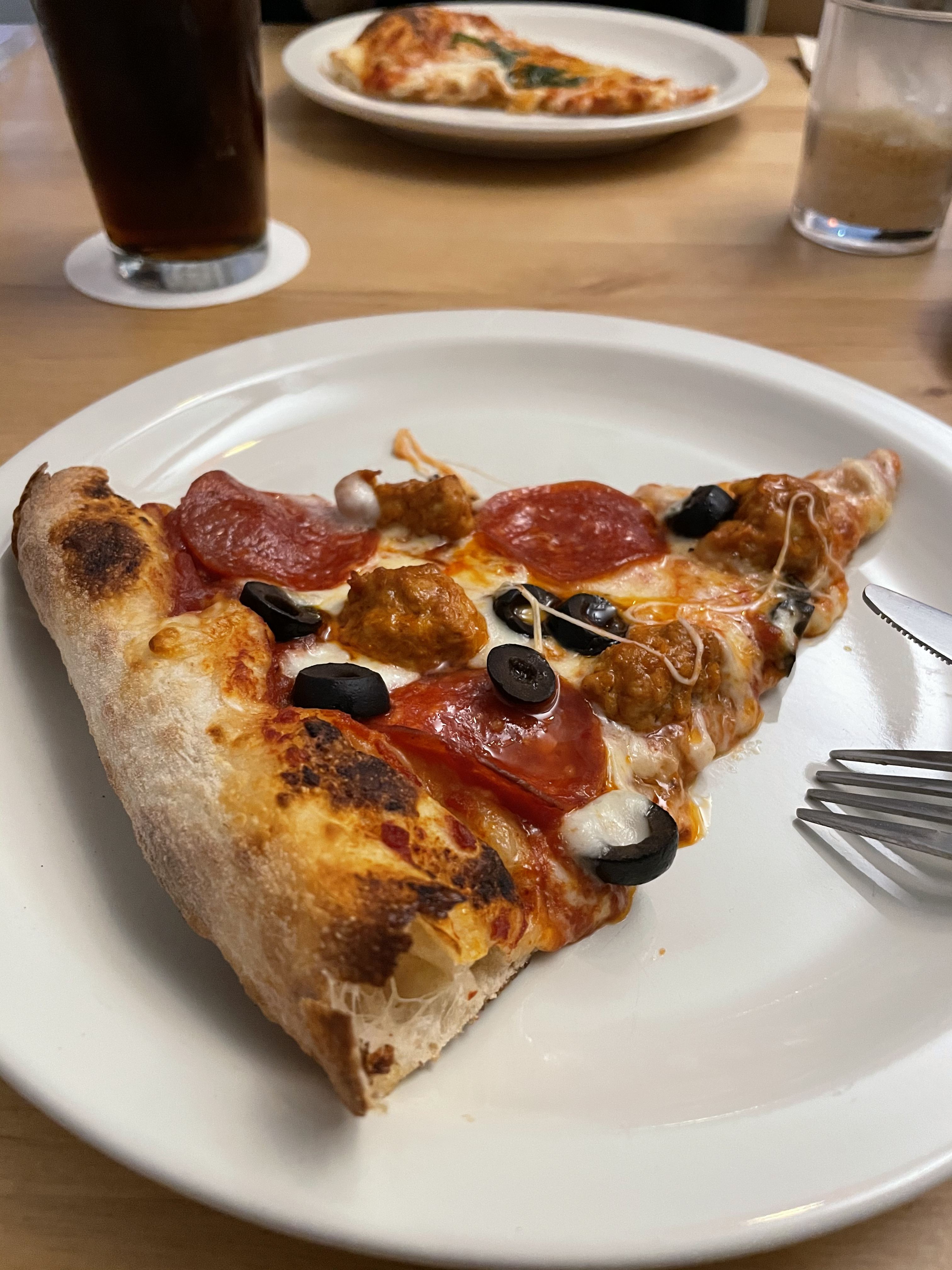 피그 앤 올리브 피자는 토마토소스를 베이스로 페코리노 로마노 치즈, 홀밀크 모짜렐라 치즈, 페퍼로니, 초리조, 블랙 올리브, 시칠리아 오레가노가 올라가 있는데요, 페퍼로니와 초리조에 블랙 올리브의 향이 더해진, 익숙하지만 다양한 맛을 즐길 수 있는 피자예요. 특히 페퍼로니의 짠맛이 극대화돼서 진정한 미국식 피자를 맛볼 수 있었어요. 피제리아 호키포키의 베스트 메뉴 중 하나입니다.