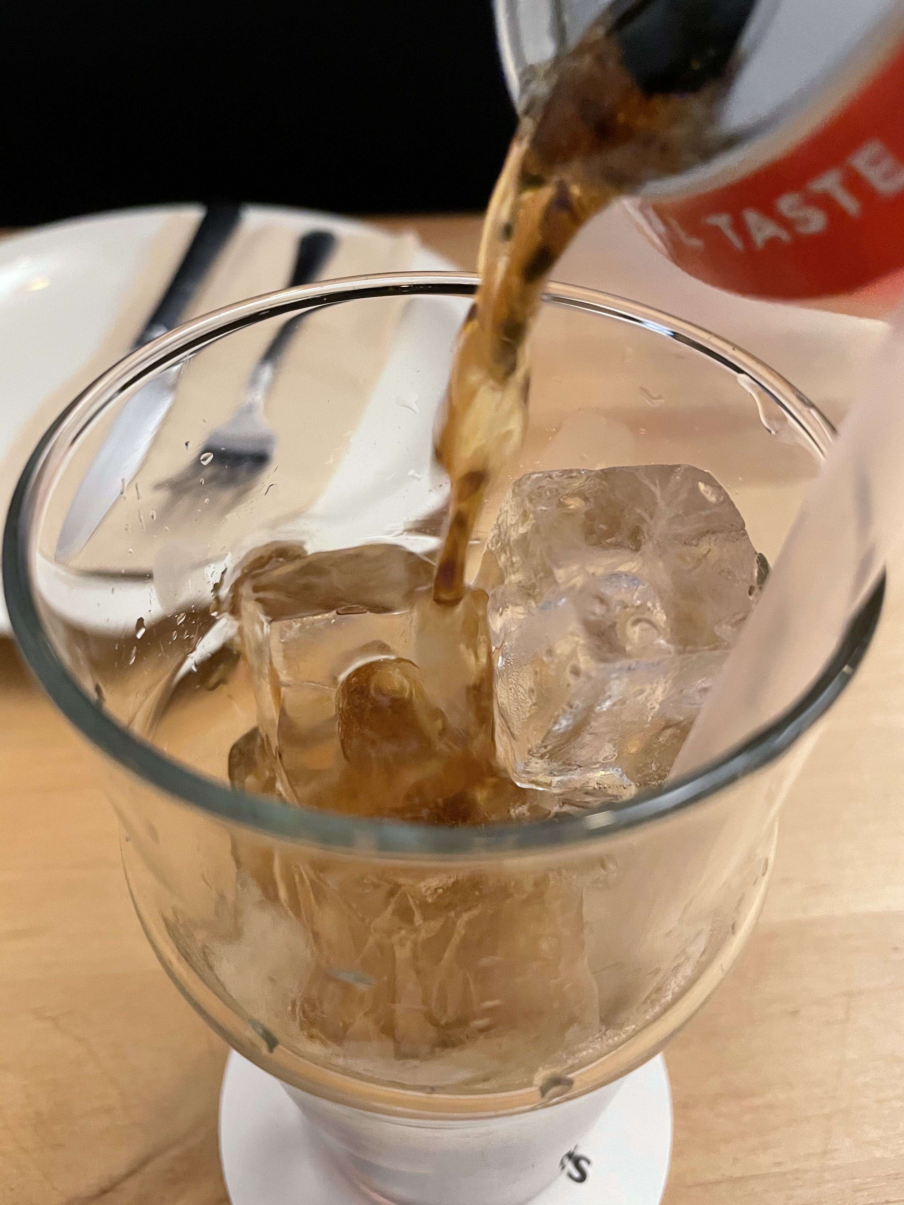 코카콜라는 업소용인 355ml 사이즈로 제공돼요. 얼음이 들어있는 유리잔에 콜라를 부으며 피자를 기다려 봅니다.