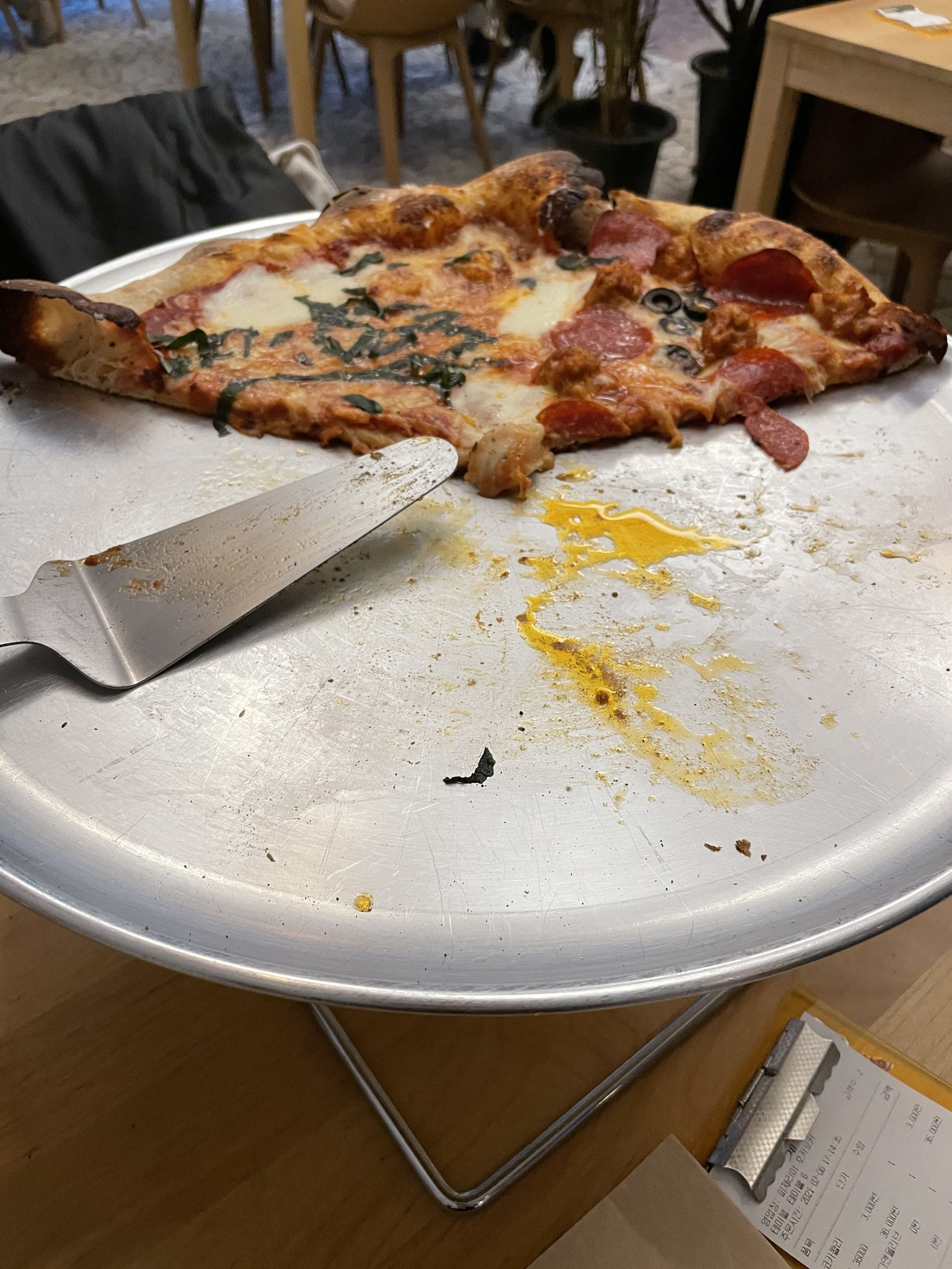 역시 우려했던 대로 피자가 세 조각 정도 남았는데요, 피제리아 호키포키에서는 남은 피자를 포장해서 가져갈 수 있도록 하고 있어요. 그래서 저희도 남은 피자를 포장하기로 결심했습니다.