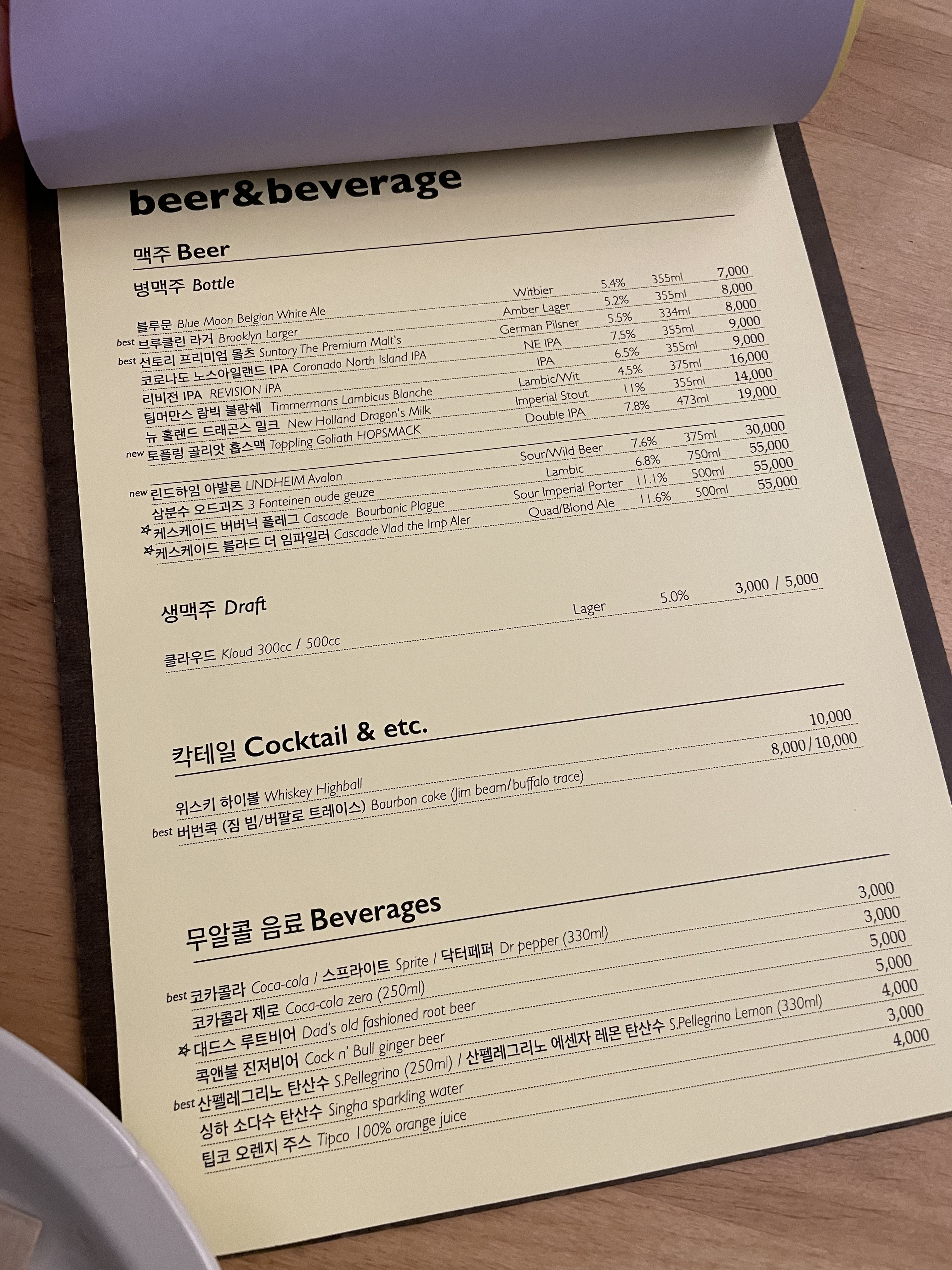 그 외의 사이드 메뉴로는 샐러드 종류가 있고, 음료는 와인과 맥주, 탄산수와 주스가 있어요. 이 날 제가 술을 먹으면 안 되는 몸 상태여서 그냥 콜라를 주문하기로 했어요.