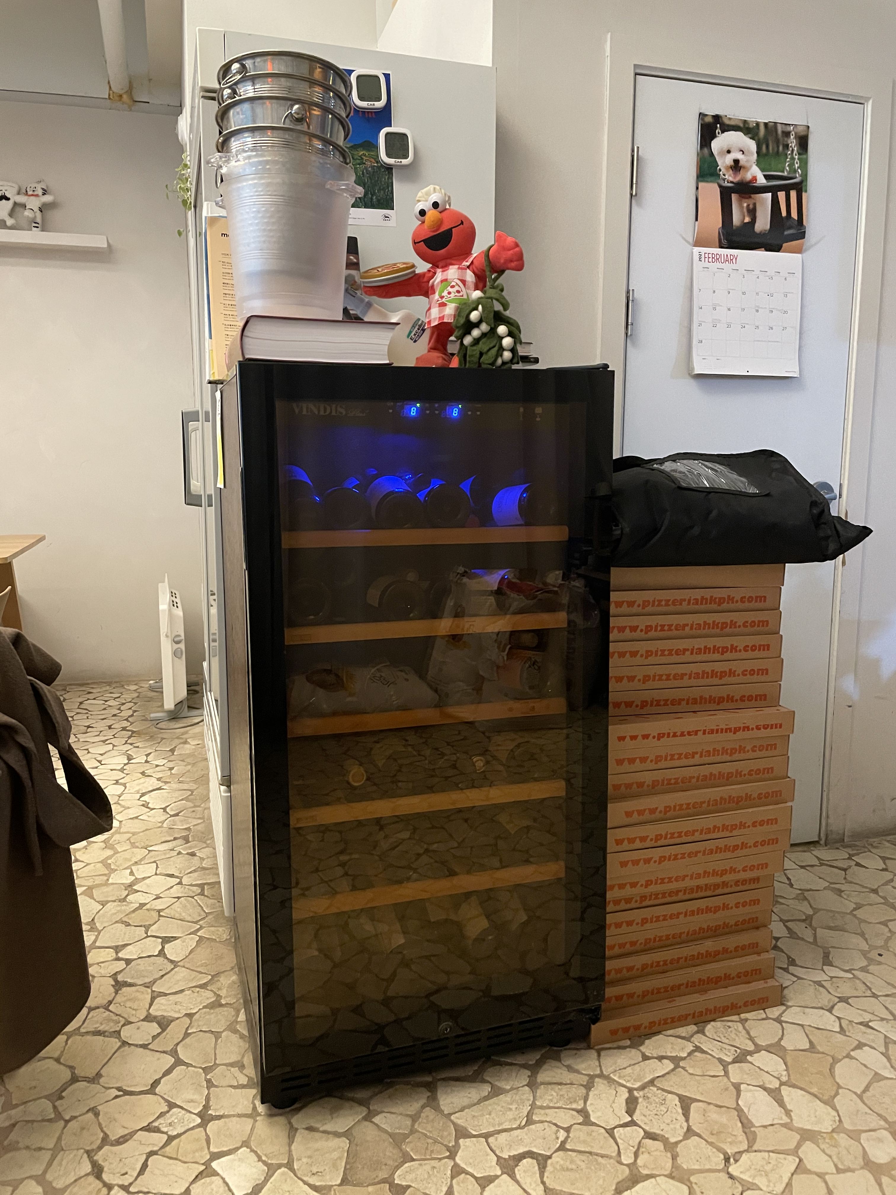 좀 전에 메뉴판에서 여러 종류의 와인을 봤듯이 매장 내부에는 이렇게 와인 냉장고가 구비되어 있어요. 와인과 즐기는 피자도 색다를 것 같은데요, 다음에는 와인과 함께 먹어봐야겠어요.