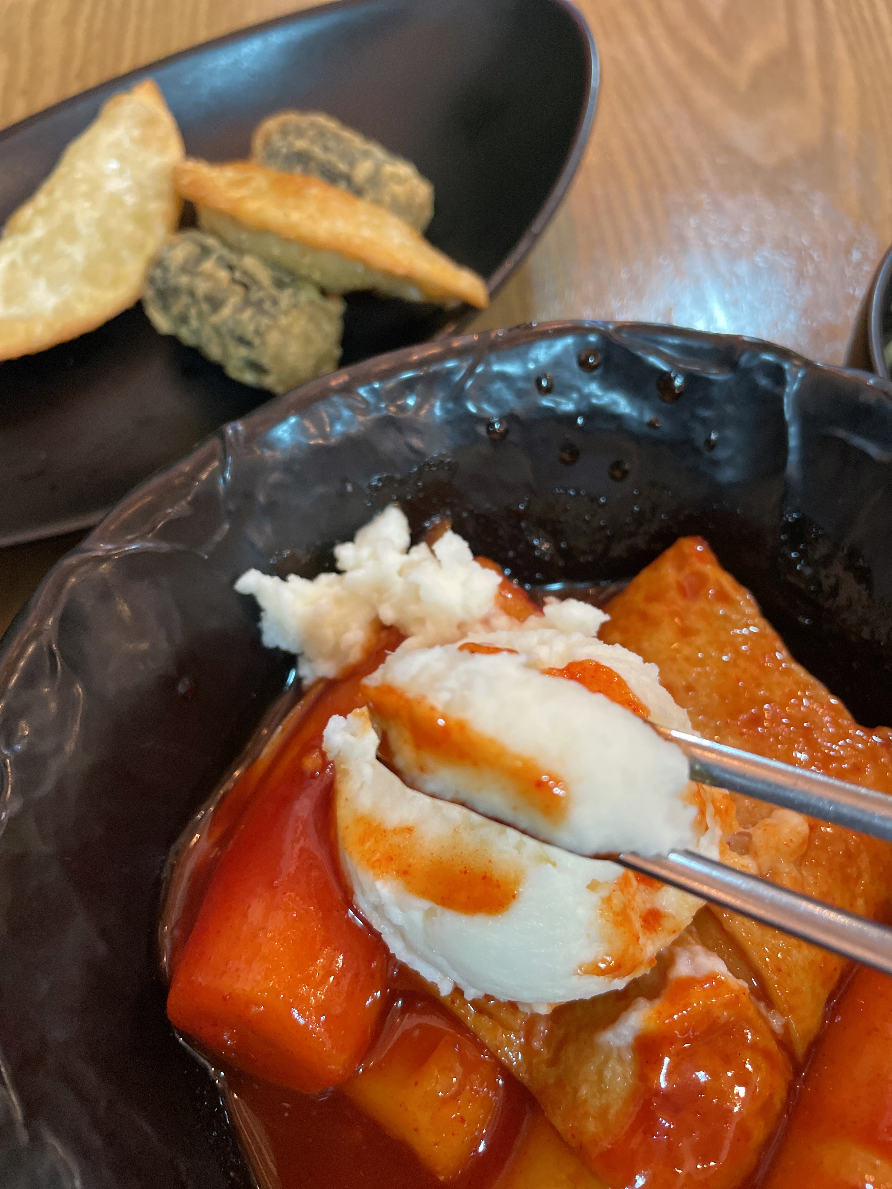주문한 메뉴들이 이렇게 나왔는데요, 김만튀김은 김말이 튀김 3개, 만두 튀김 2개 이렇게 해서 총 5개가 나왔네요. 그리고 떡볶이는 굉장히 굵은 가래떡과 어묵 그리고 감재 샐러드가 곁들여서 나와요. 단, 포장이나 배달 주문을 했을 땐 감자 샐러드가 제공되지 않아요. 아마 장시간 이동시 떡볶이 위에 올려진 감자 샐러드가 녹아버려서 그러지 않을까 추측이 되네요.