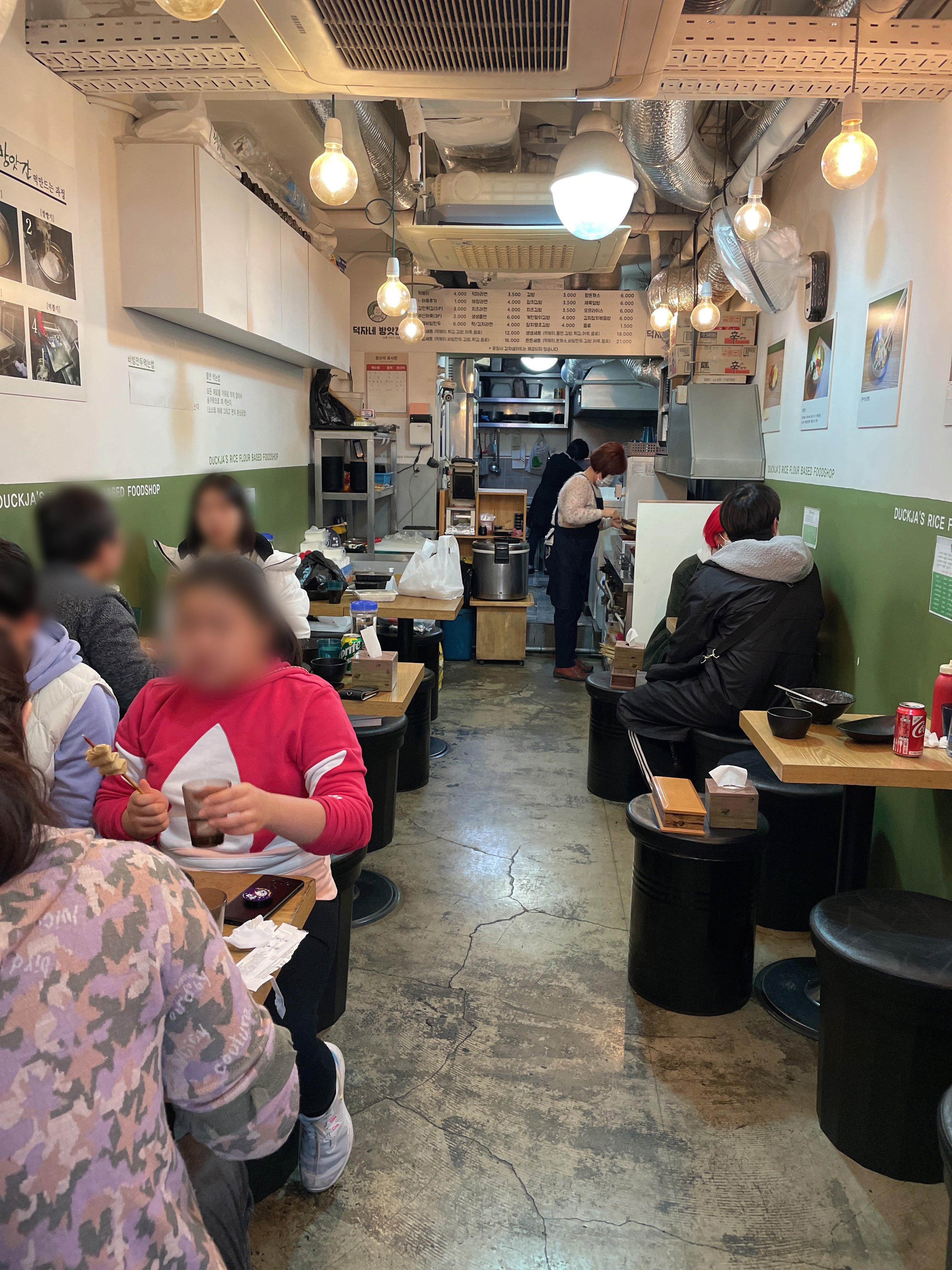 덕자네방앗간 강남본점의 내부 모습입니다. 식당 내부의 공간은 그렇게 크지 않아요. 홀은 약 4~5평 남짓한 크기입니다. 테이블은 총 두 줄로 세팅되어 있는데 한 줄은 3~4인이 먹을 수 있는 크기이고, 한 줄은 1~2명이서 먹을 수 있는 크기로 되어 있어요. 저는 이날 혼자 방문했기 때문에 테이블 하나만 세팅되어 있는 자리에 착석했어요.