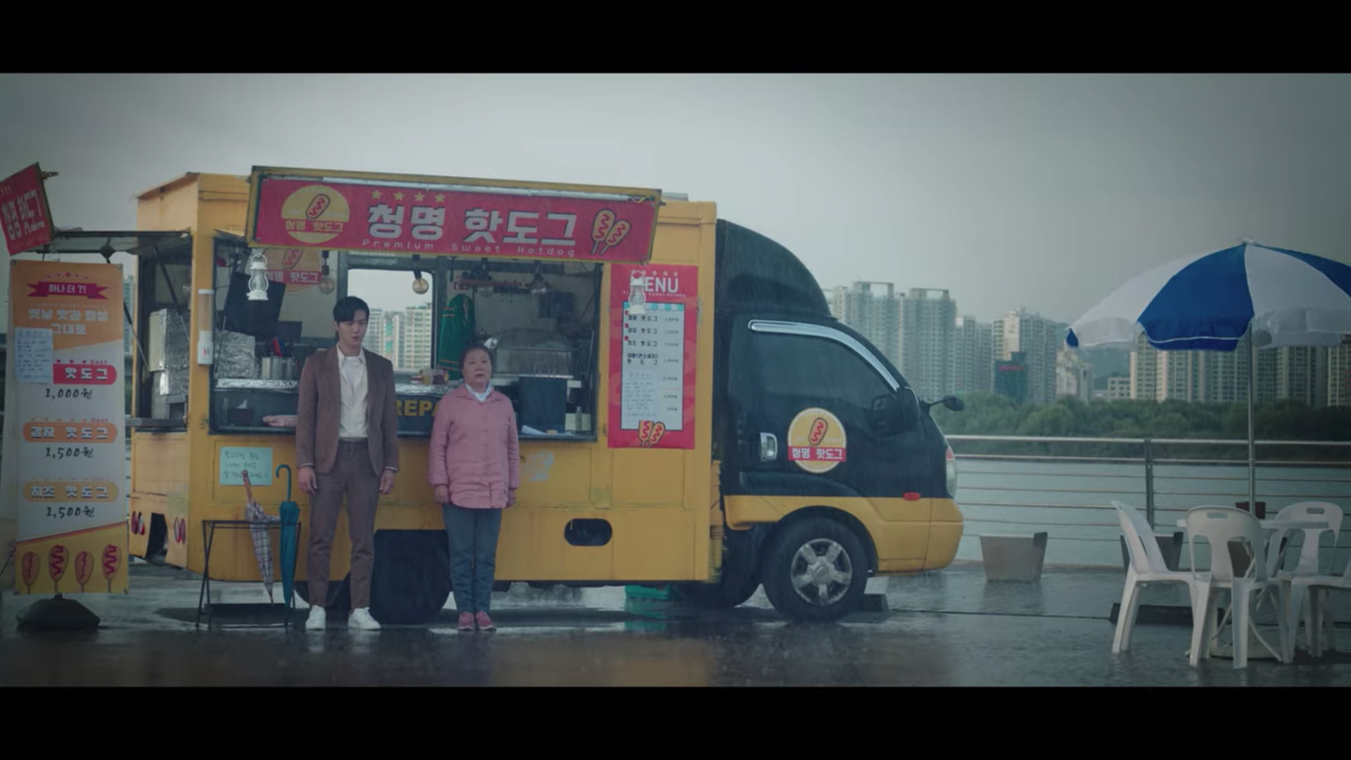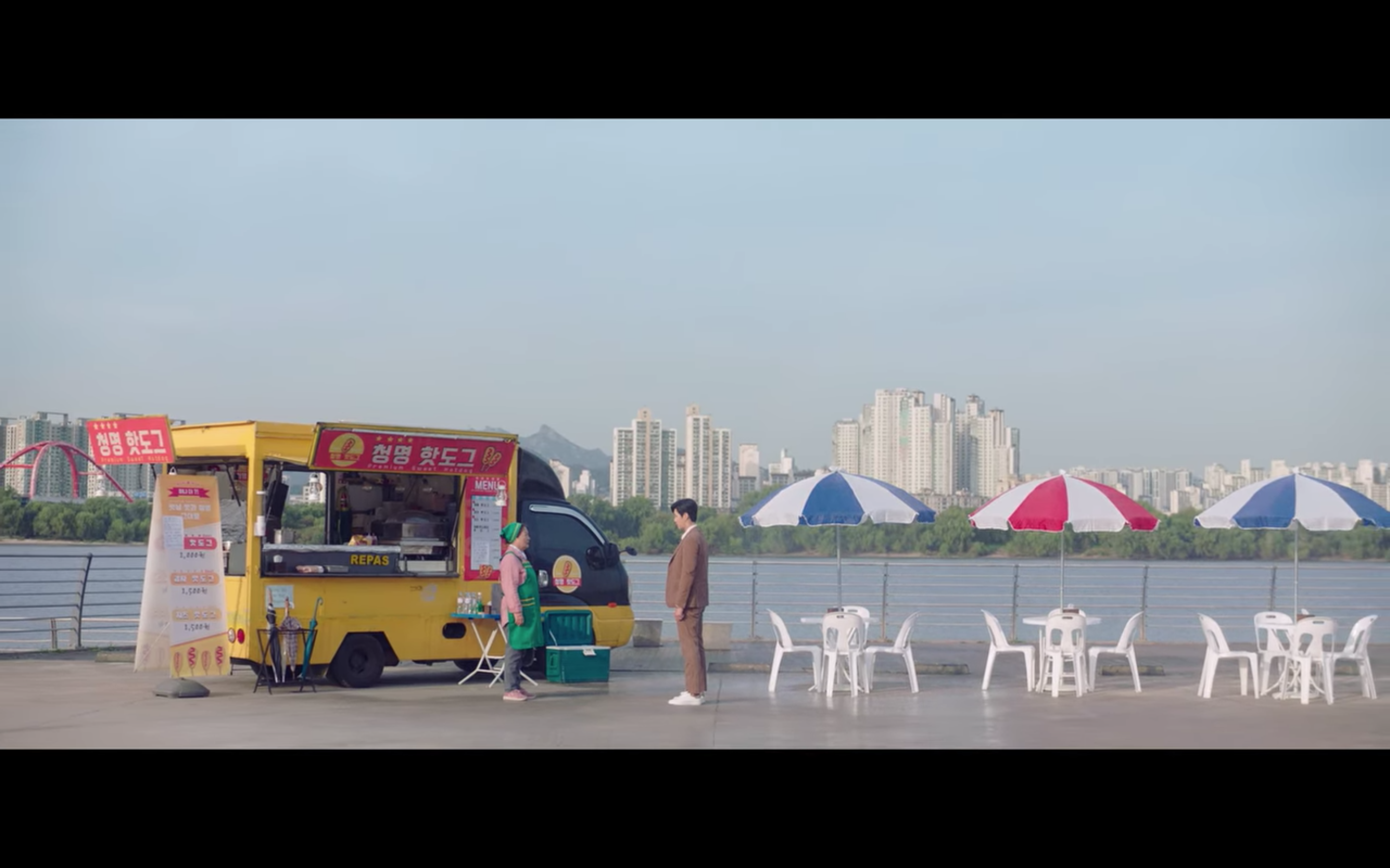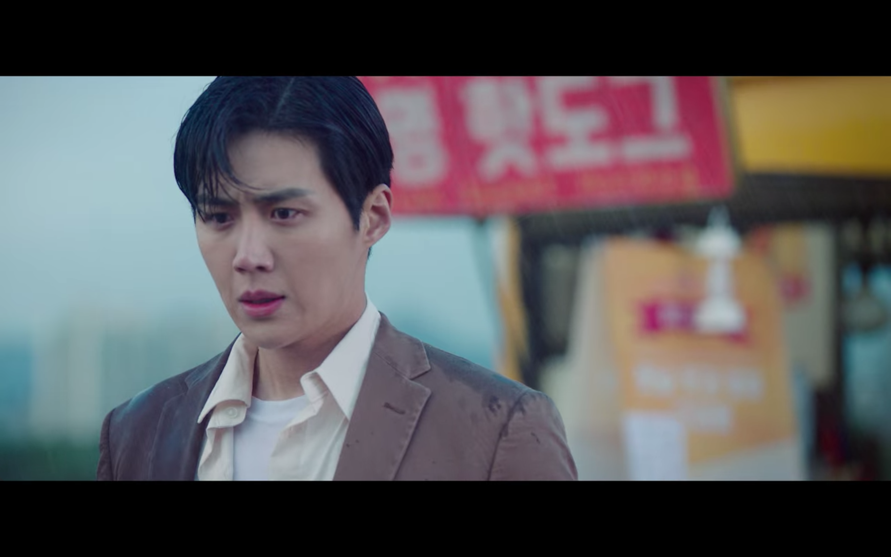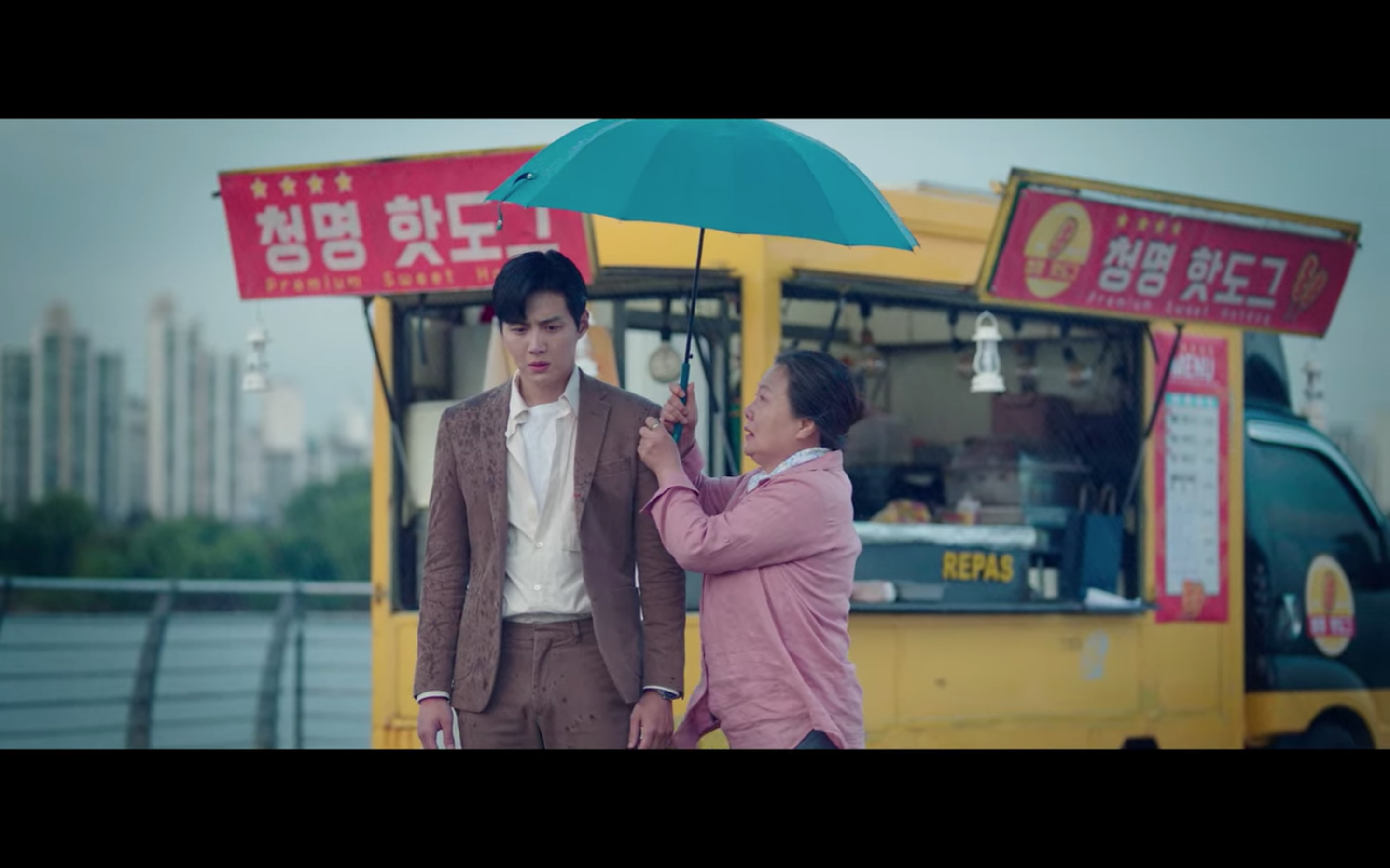 한지평 팀장 역할을 맡은 배우 김선호 님은 극 중에서 주로 포멀한 스타일을 선보이는데요, 스타트업 9화에서 달미 할머니가 운영하는 핫도그 트럭을 찾아가 자신이 달미를 좋아한다고 고백하는 씬입니다.
