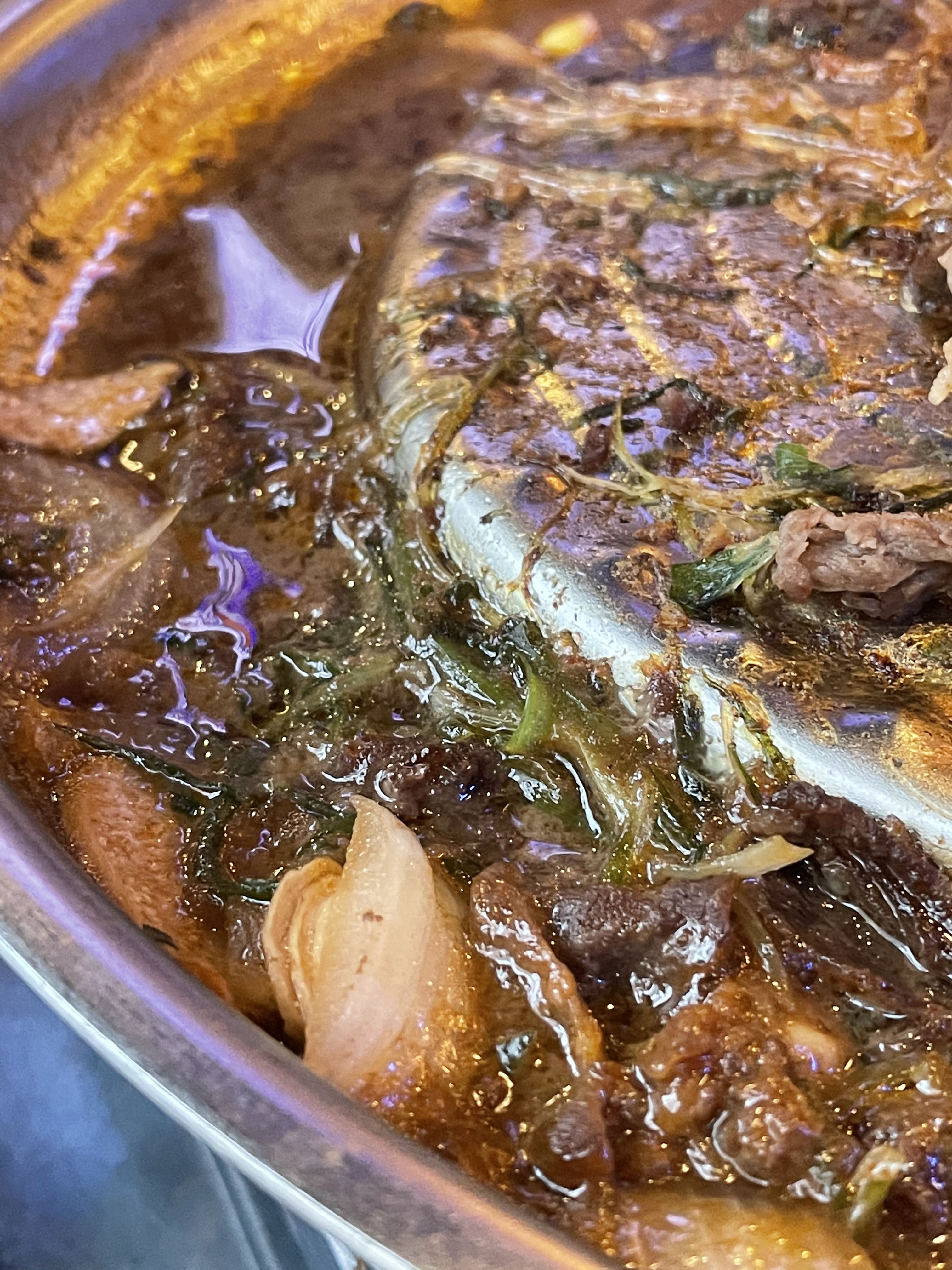 사장님이 정성스럽게 구워주시면서 냄비 테두리 국물에 있는 당면은 먹어도 된다고 해서 맥주와 함께 먹었어요. 짭조름한 국물이 베인 당면이 꼬들꼬들하게 맛났어요.