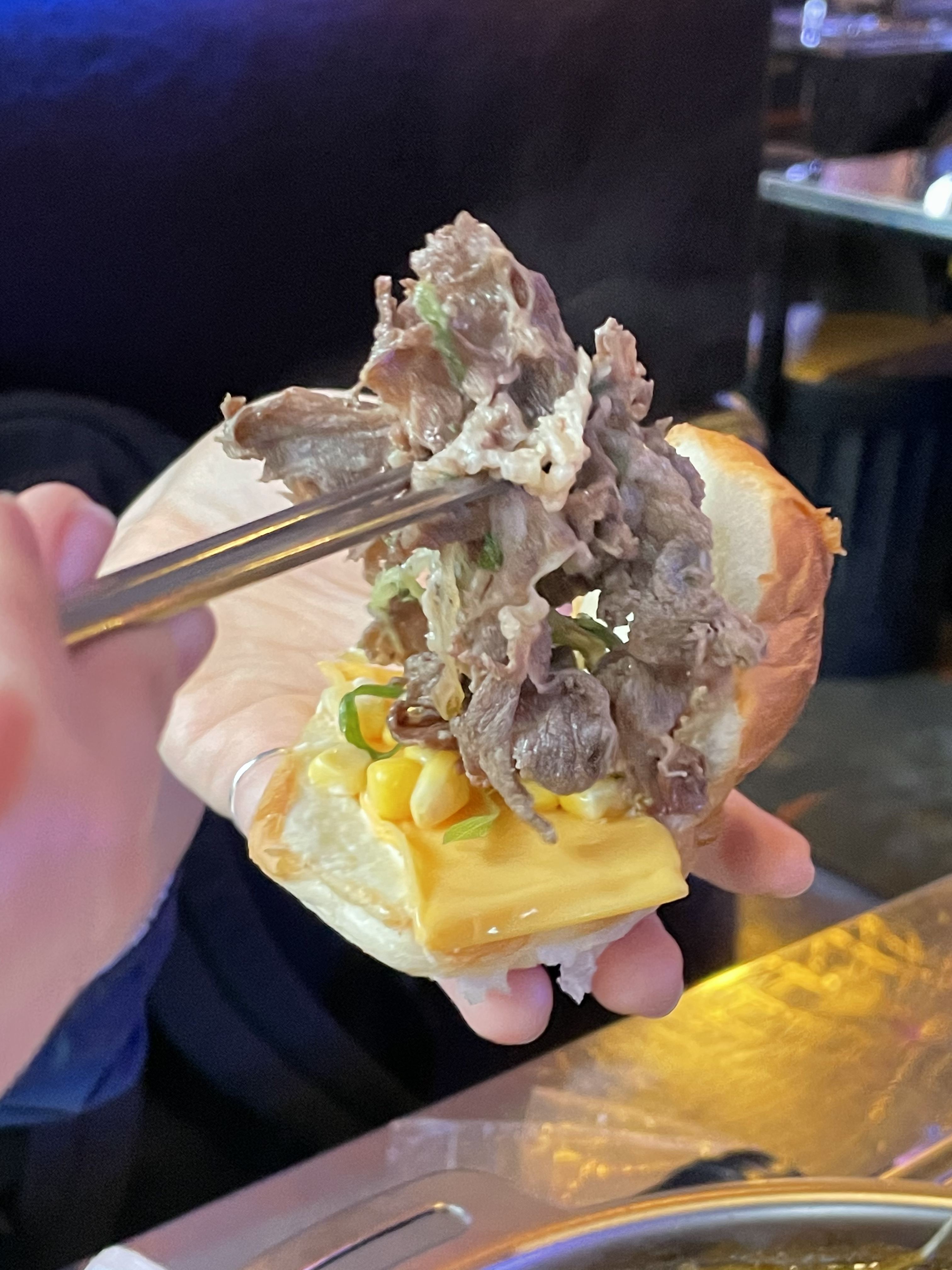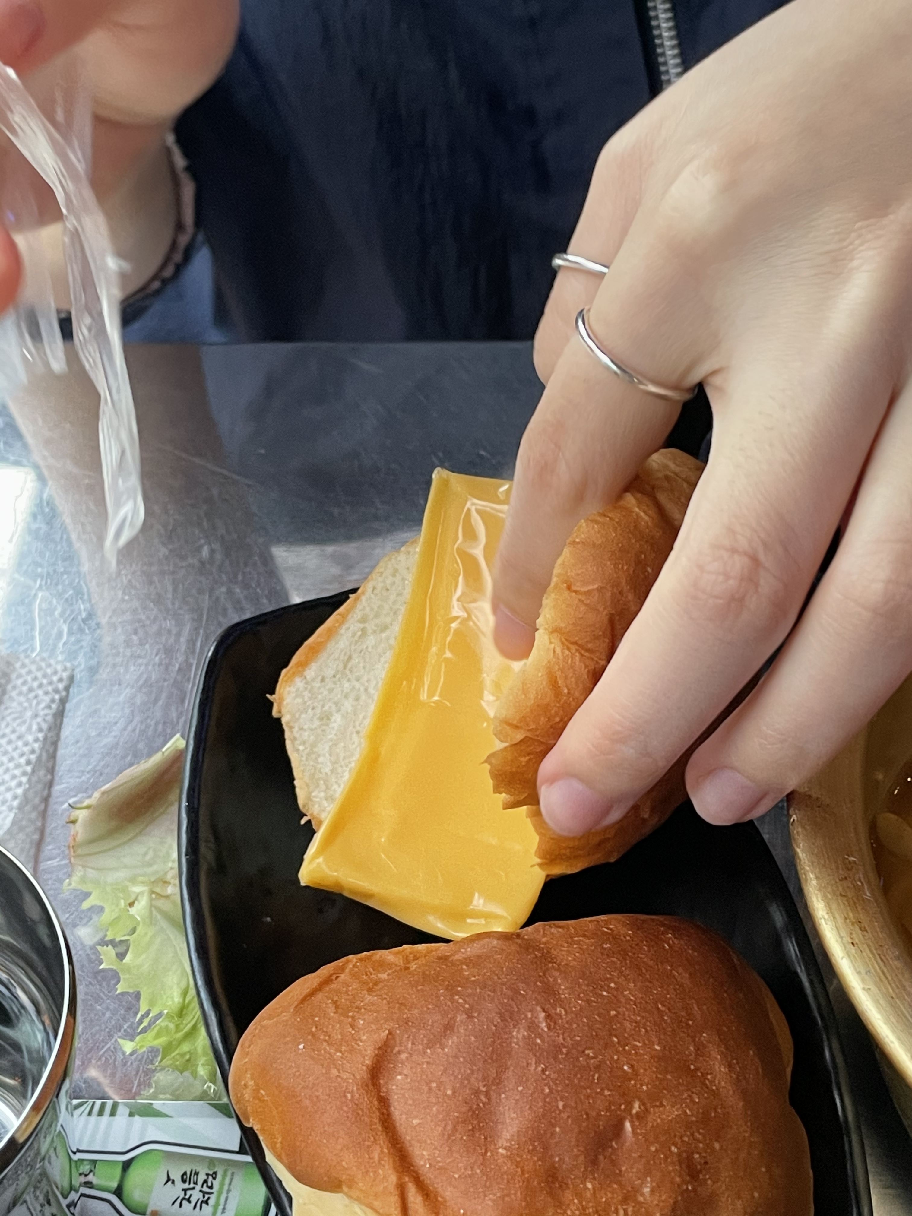 그리고 마스터 산더미파불고기에는 또 한 가지의 특별한 레시피가 있는데요, 바로 빵에 넣어서 먹는 파불고기 레시피입니다. 우선 기본적으로 제공되는 빵에 치즈와 마요네즈를 발라줘요. 그리고 기호에 따라 마요네즈를 찍은 고추를 넣어줍니다. 마지막으로 파불고기를 양껏 집어서 빵 사이에 넣어주면 완성!