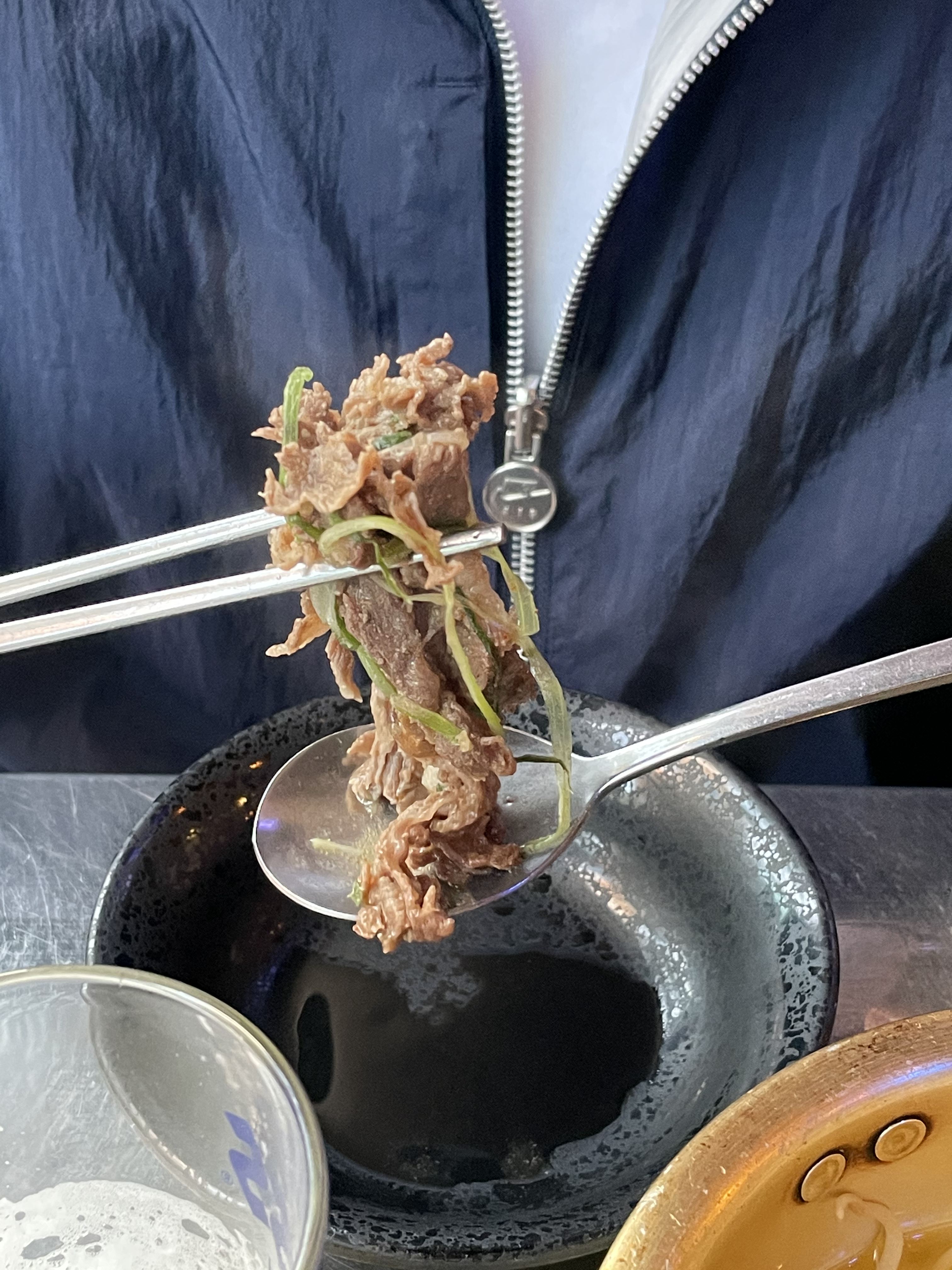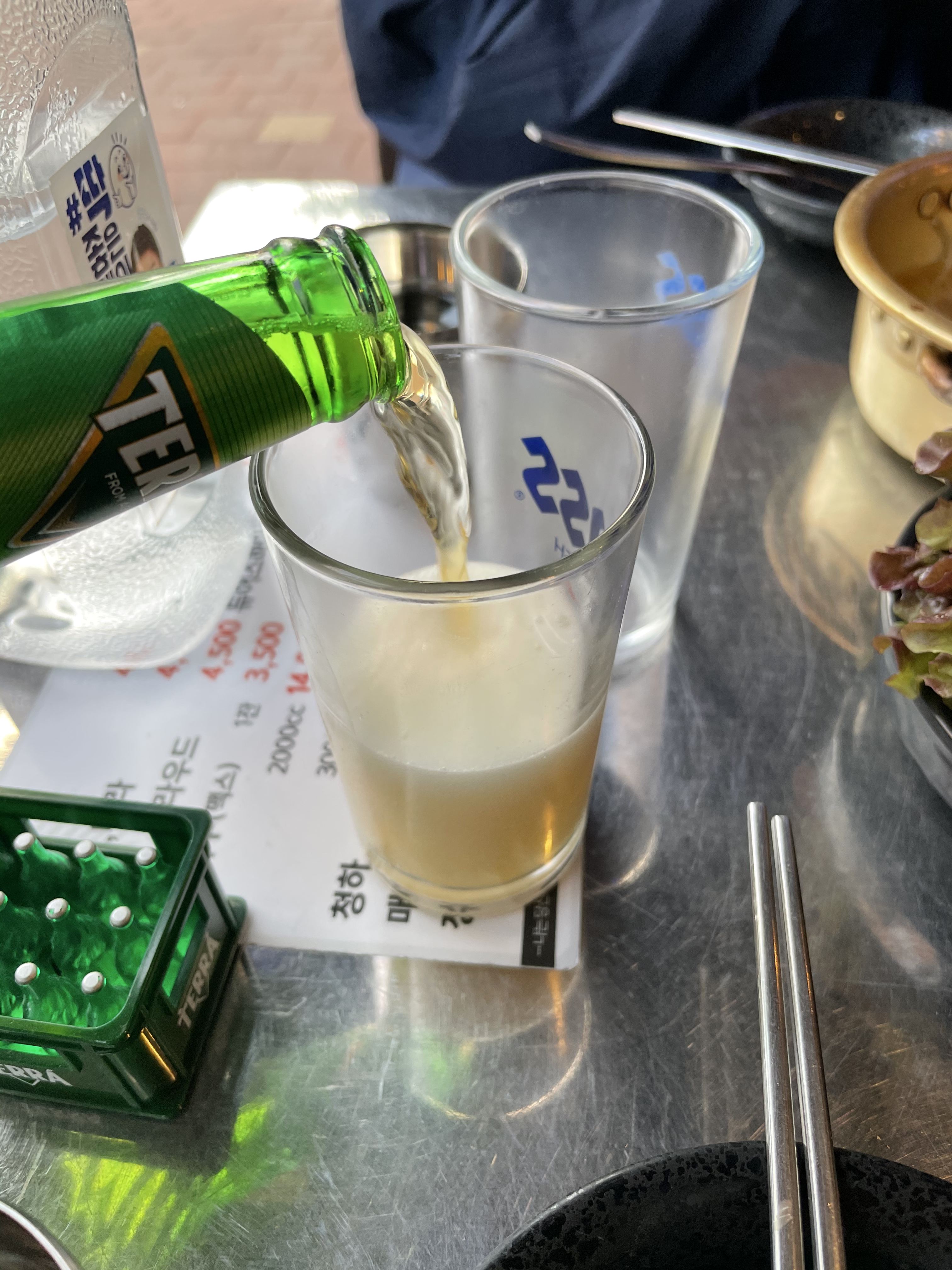 사장님이 정성스럽게 구워주시면서 냄비 테두리 국물에 있는 당면은 먹어도 된다고 해서 맥주와 함께 먹었어요. 짭조름한 국물이 베인 당면이 꼬들꼬들하게 맛났어요.