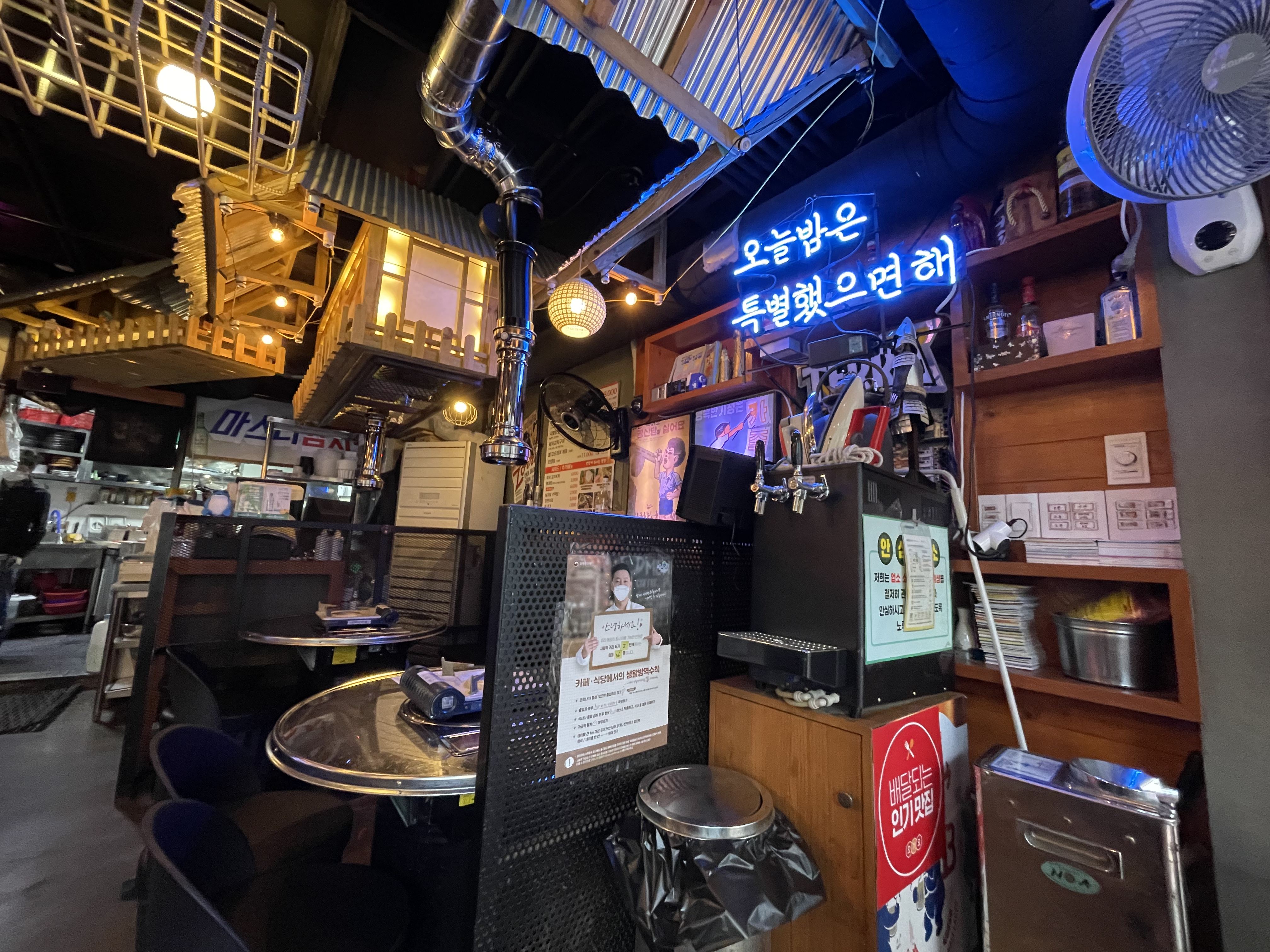 마스터 산더미파불고기 신림점의 내부 모습인데요, 마치 근현대에 온듯한 분위기의 인테리어로 꾸며져 있어요. 여기저기 재밌는 포스터와 소품들이 진열되어 있습니다.