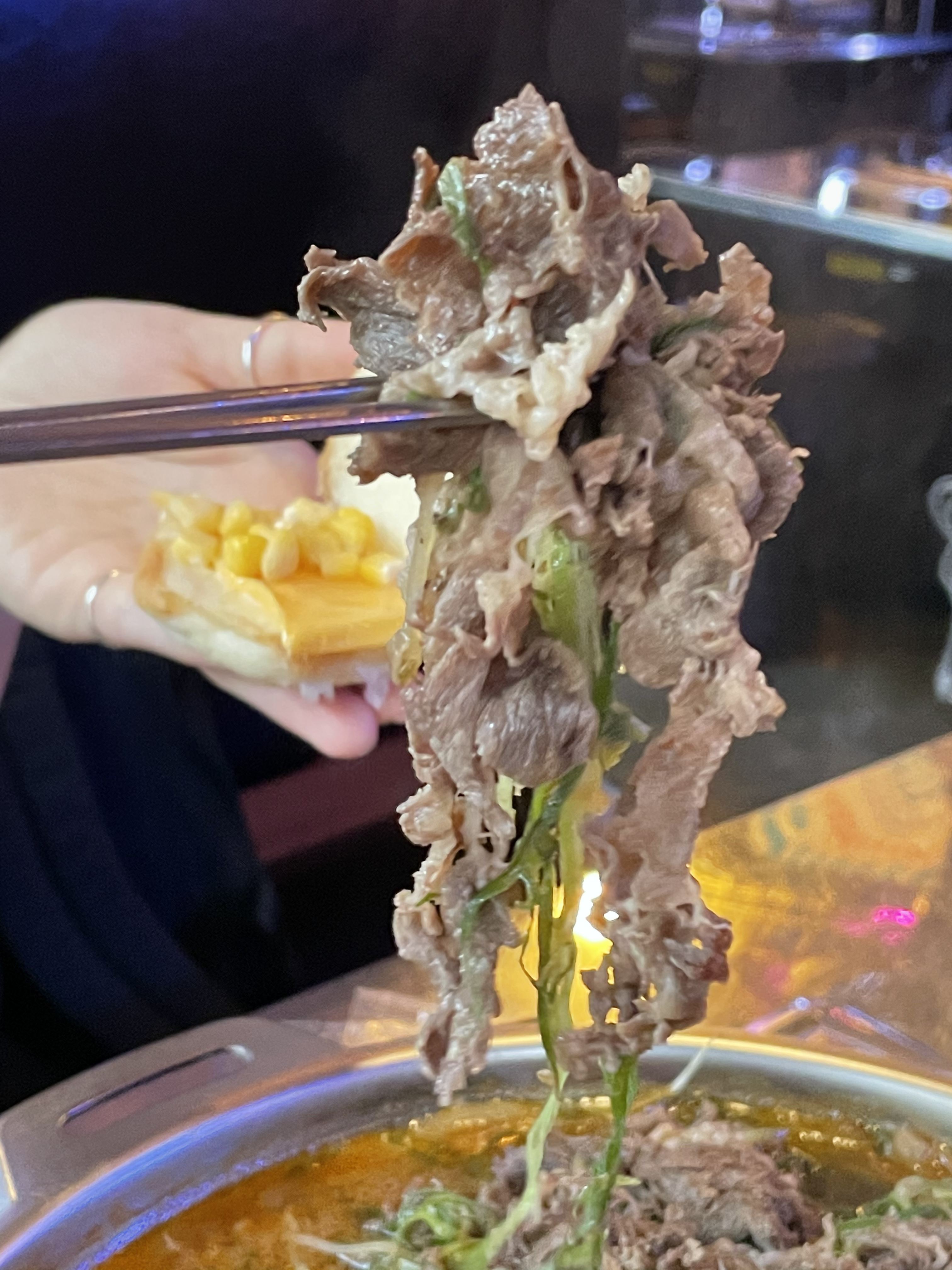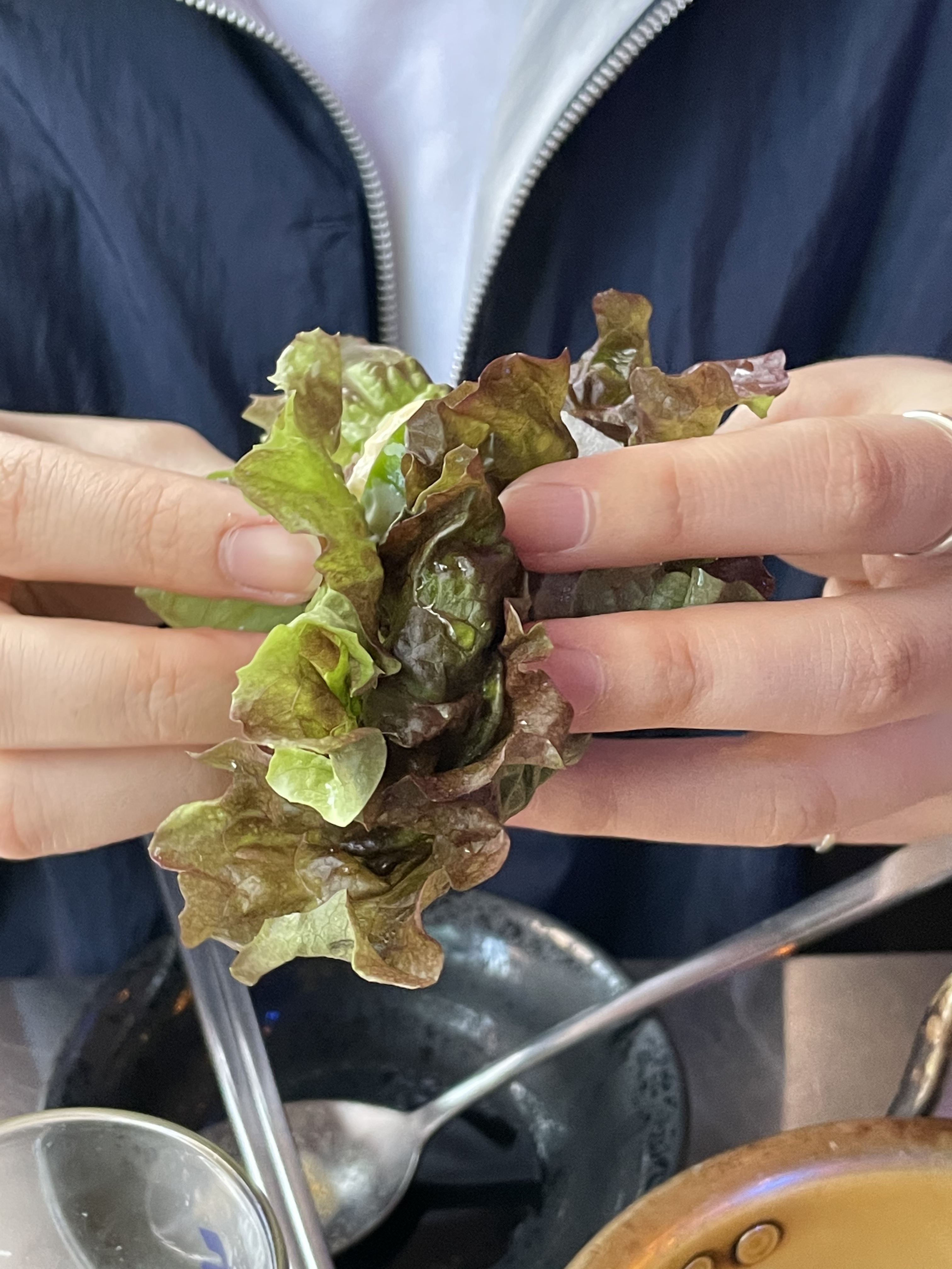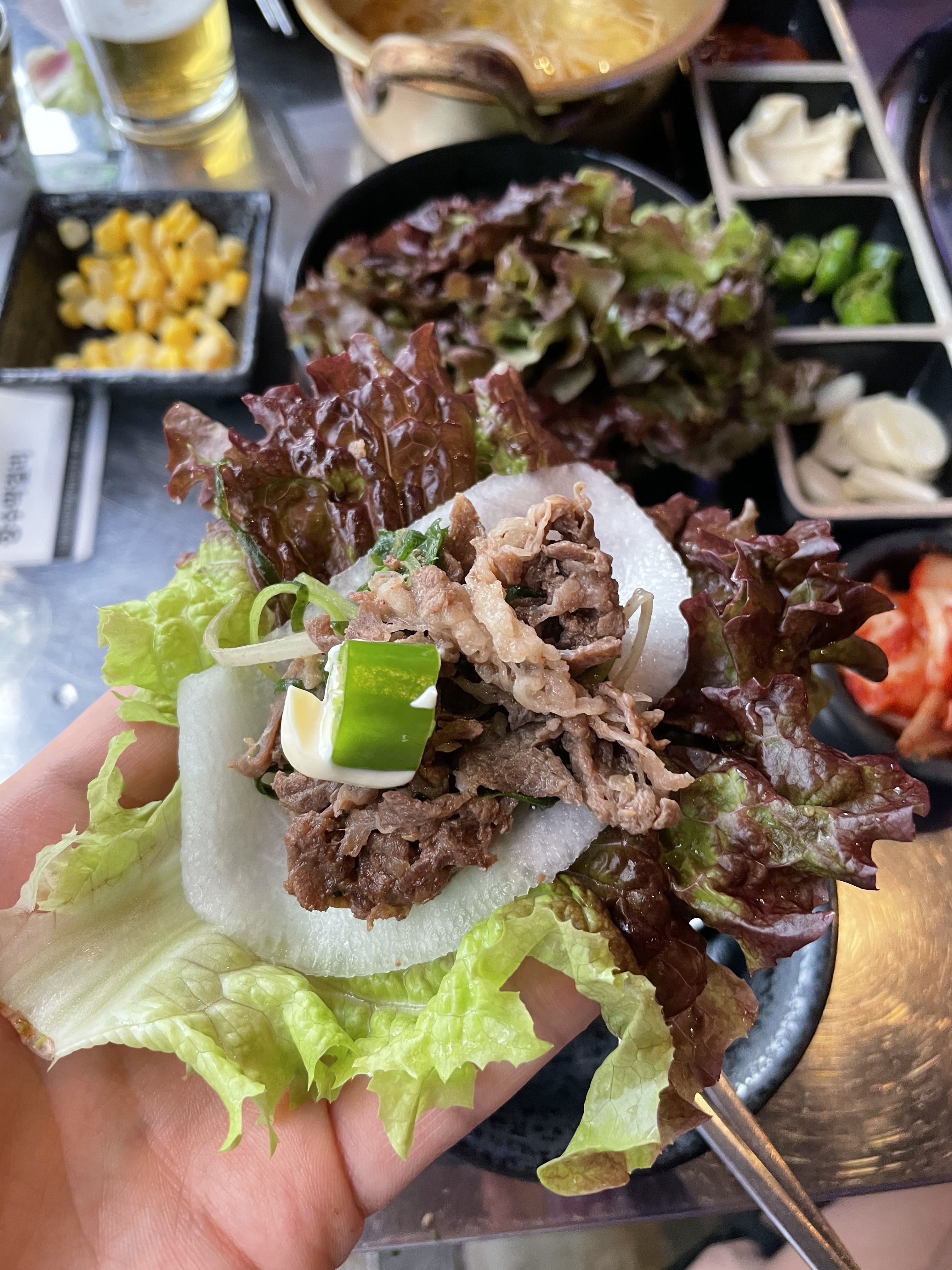 밑반찬으로는 콩나물국, 상추와 깻잎, 무쌈, 콘샐러드, 김치 그리고 각종 소스들이 나와요. 개인적으로 밑반찬 리필은 셀프였으면 좋았겠다는 생각이 들었어요. 저희가 리필을 자주 하다 보니 눈치도 보이고 사장님도 지쳐 보이는 게 눈에 보여서 조금은 불편했거든요.