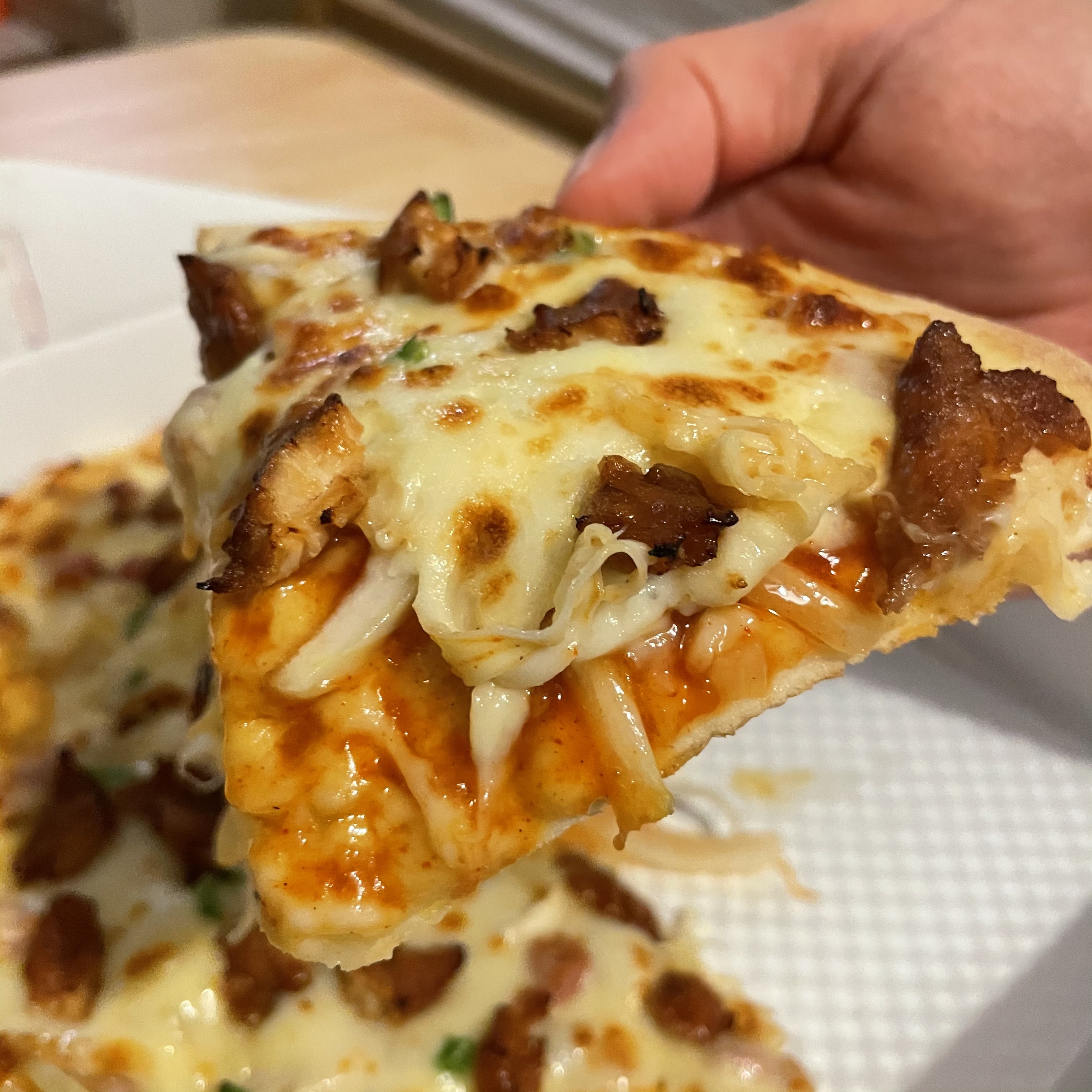첫 조각을 집어 드니 치즈가 쭉 늘어나요. 피자의 두께는 그렇게 두꺼운 편이 아니었어요. 하지만 혼자서 먹기에는 충분한 양과 크기였어요.