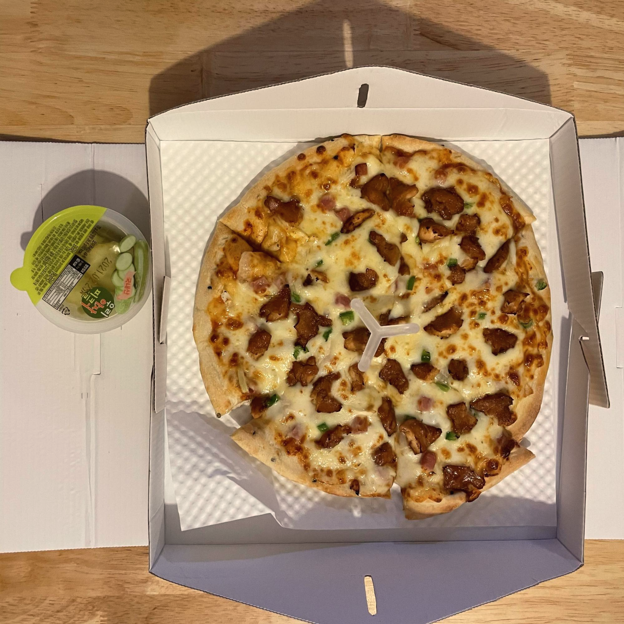 박스를 열면 이렇게 핫스파이스피자 M과 피클이 하나 들어있어요. 피자는 총 여섯 조각이고요, 숯불에 구워진 치킨을 베이스로 치즈와 바베큐 소스 그리고 야채가 토핑 되어 있어요. 보기만 해도 정말 군침이 도는 비주얼이에요.