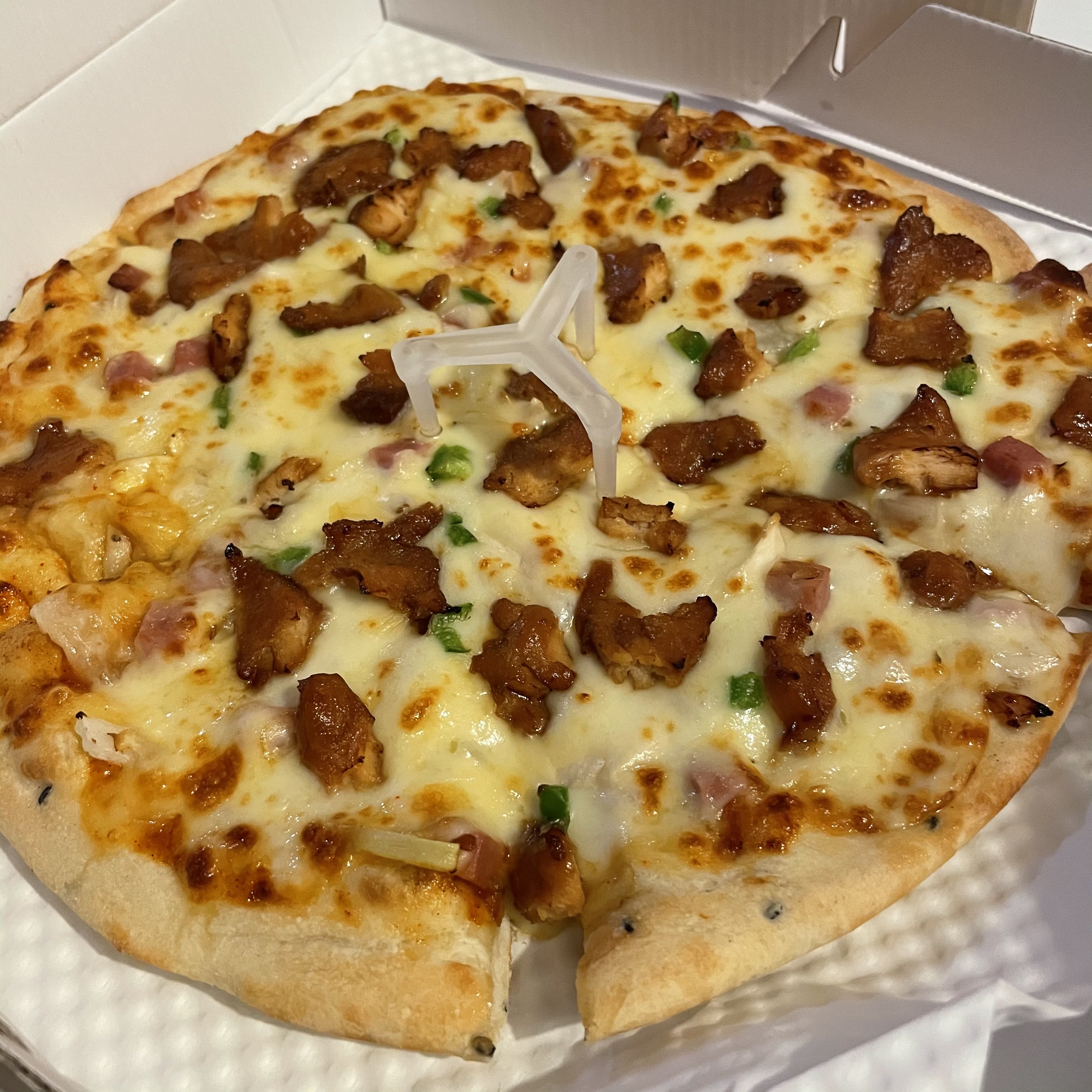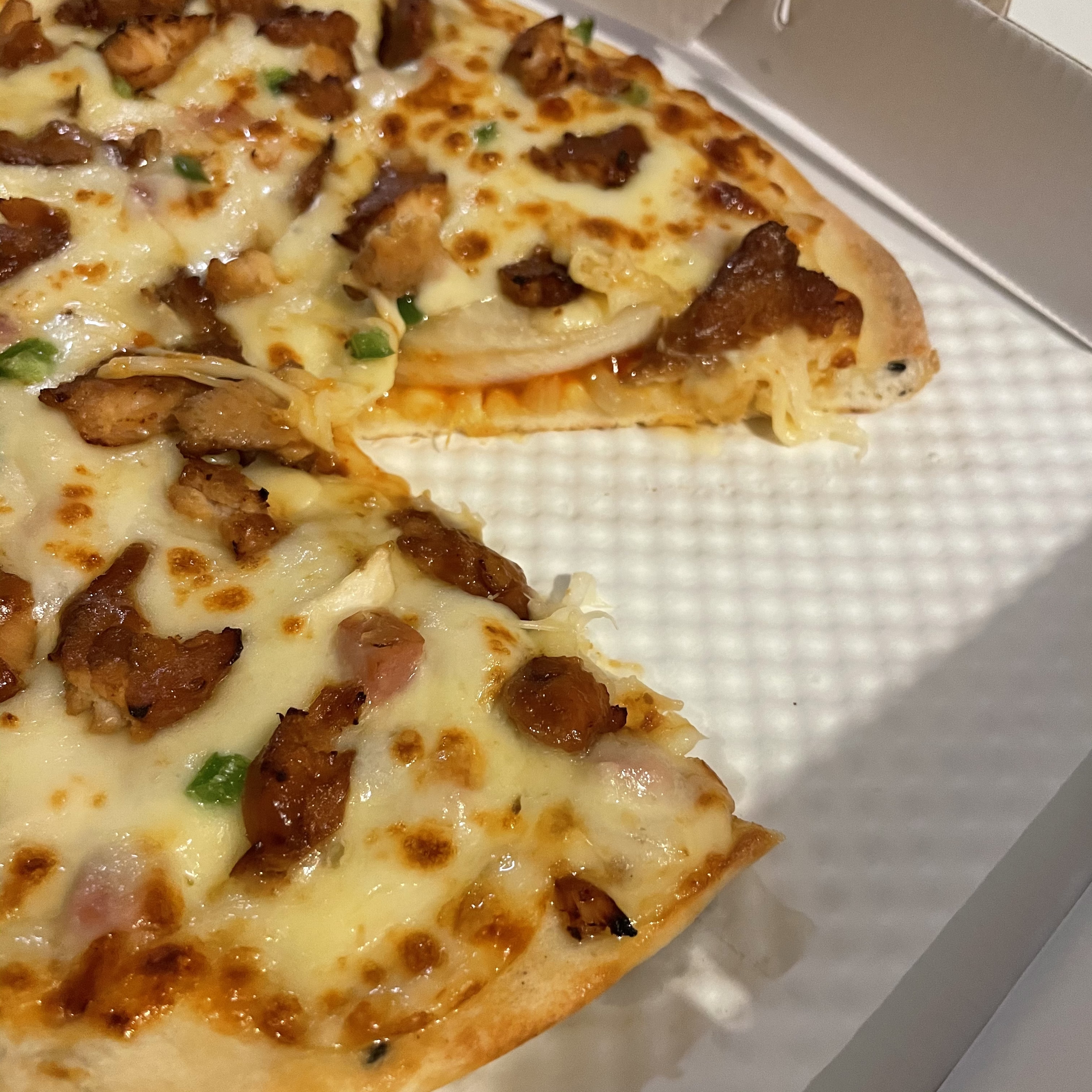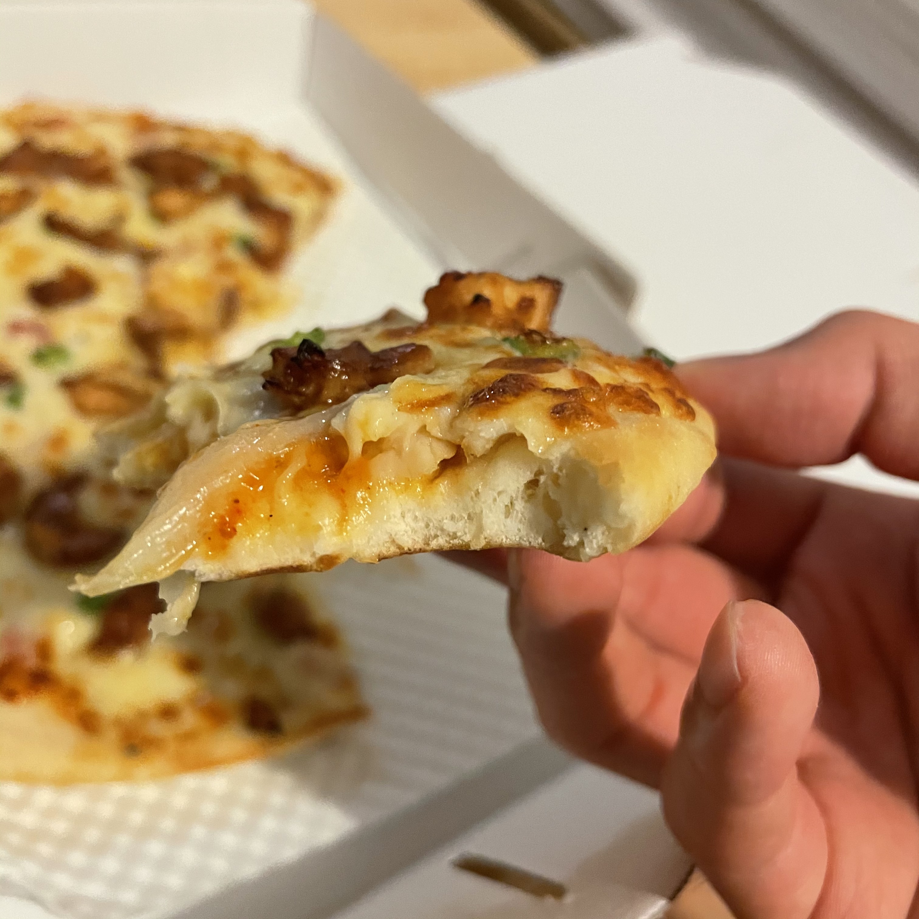 핫스파이스피자 한 조각당 숯불 치킨이 6~7조각 정도 올라가 있더라고요. 피자를 먹으면서도 치킨 맛을 느낄 수 있어서 아주 만족스러웠어요. 그리고 엣지는 아무것도 추가하지 않아서 좀 퍽퍽한 느낌을 받았어요.