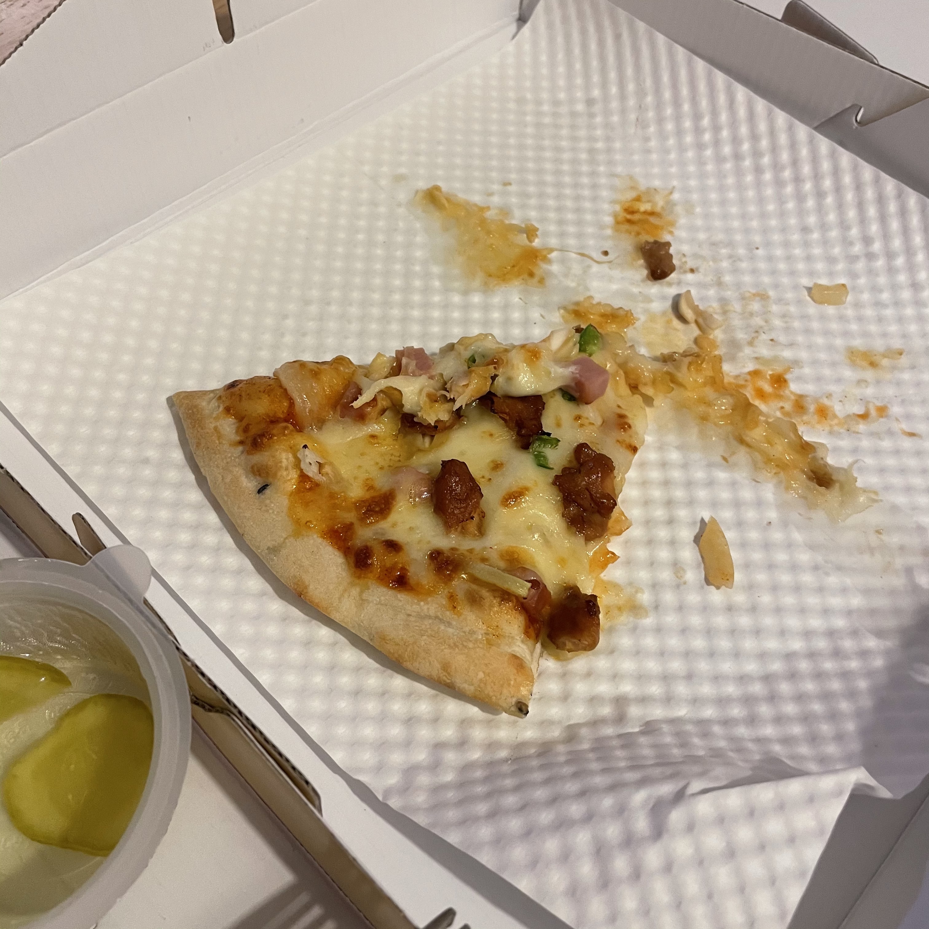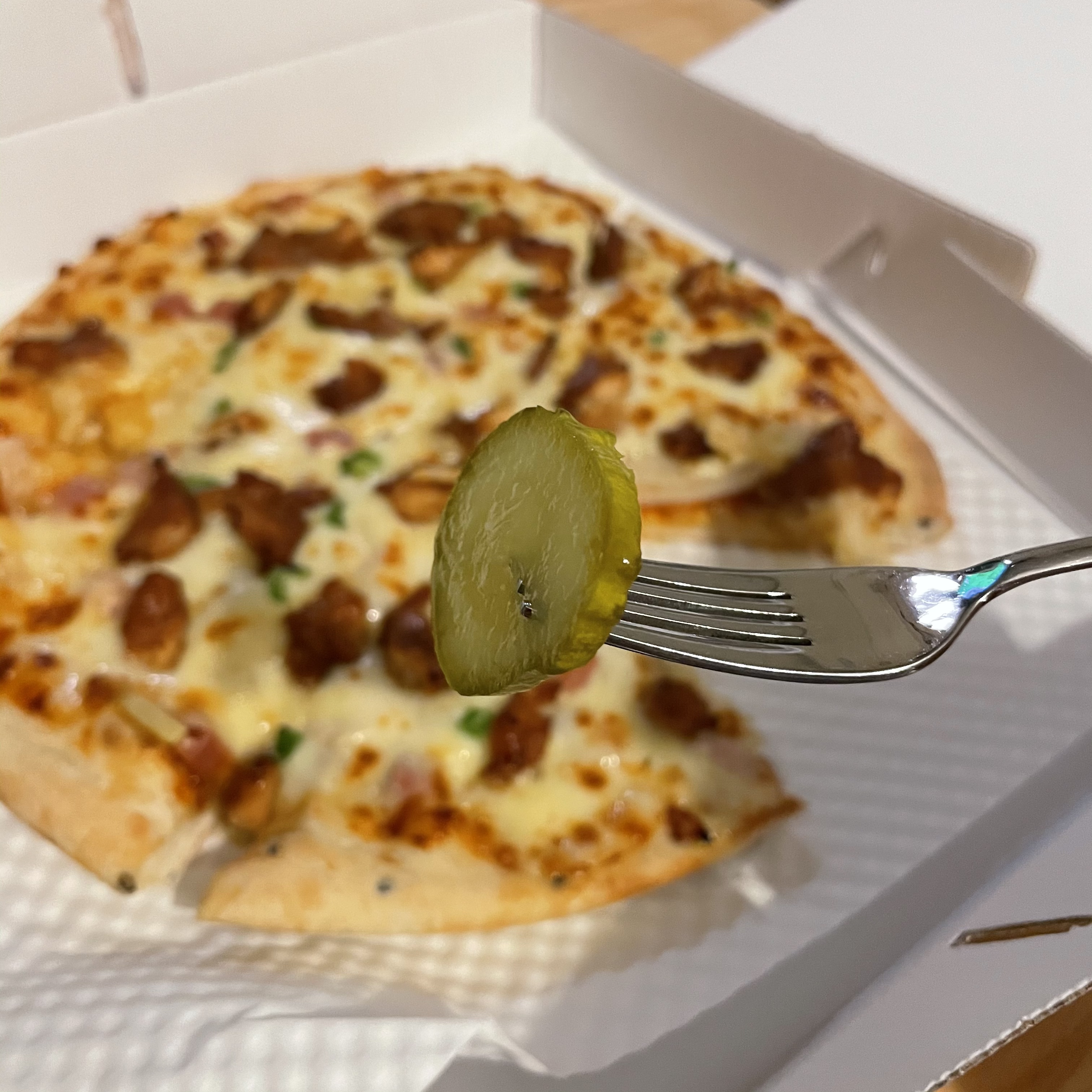 저는 사실 피자를 먹을 때 피클을 선호하지 않는 타입인데 이 핫스파이스피자의 맵기를 고려해서 이 날은 피클과 함께 먹었어요.