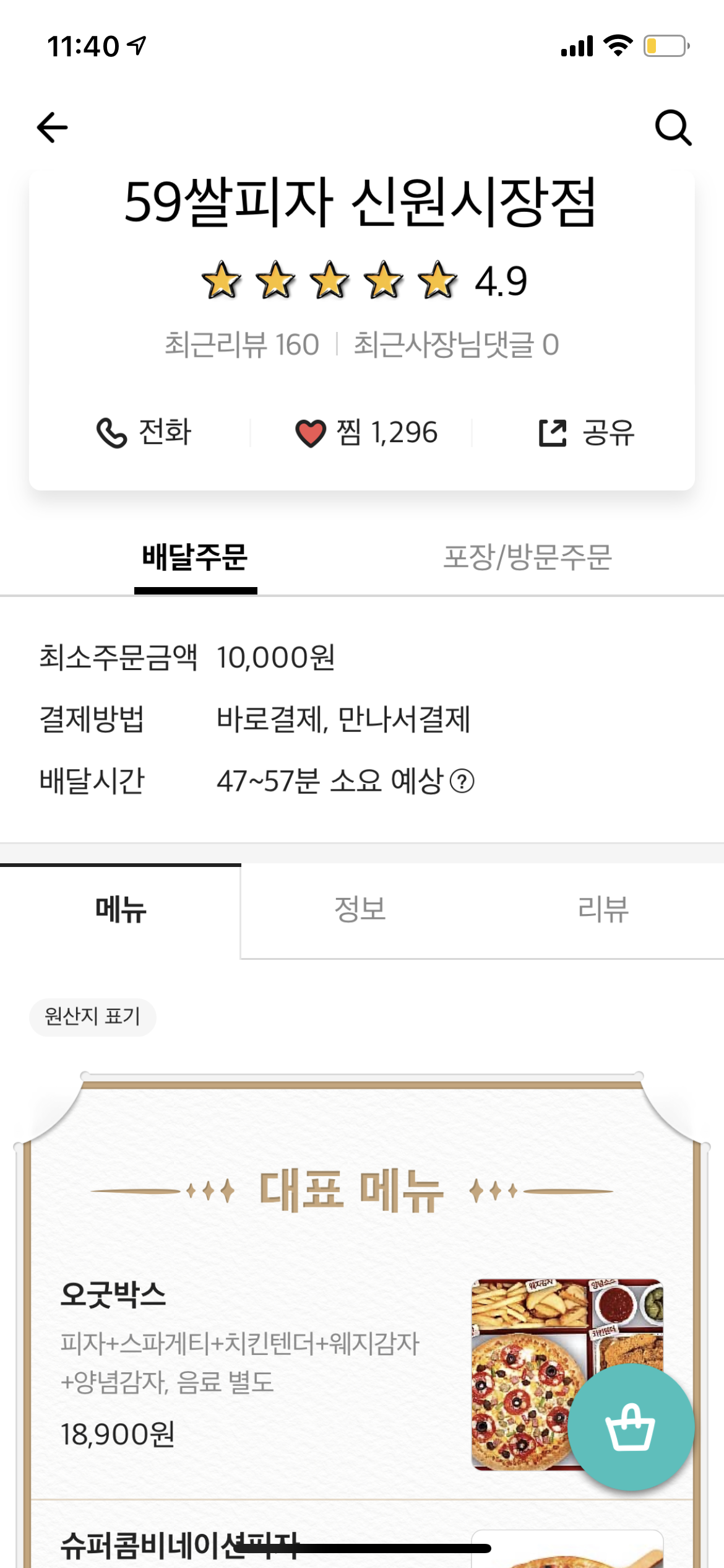 우리는 배달의 민족이기에 저 역시도 배달의 민족 어플을 통해 주문했는데요, 4,9점의 평점과 찜 숫자만 봐도 피자 맛집이라는 건 누구나 알 수 있겠죠? 오구쌀피자의 최소 주문 금액은 10,000원이고 배달 시간은 약 4~50분 정도가 소요돼요. 다른 피자 체인점들과 비교해도 최소 주문 금액이 저렴한 편이에요.