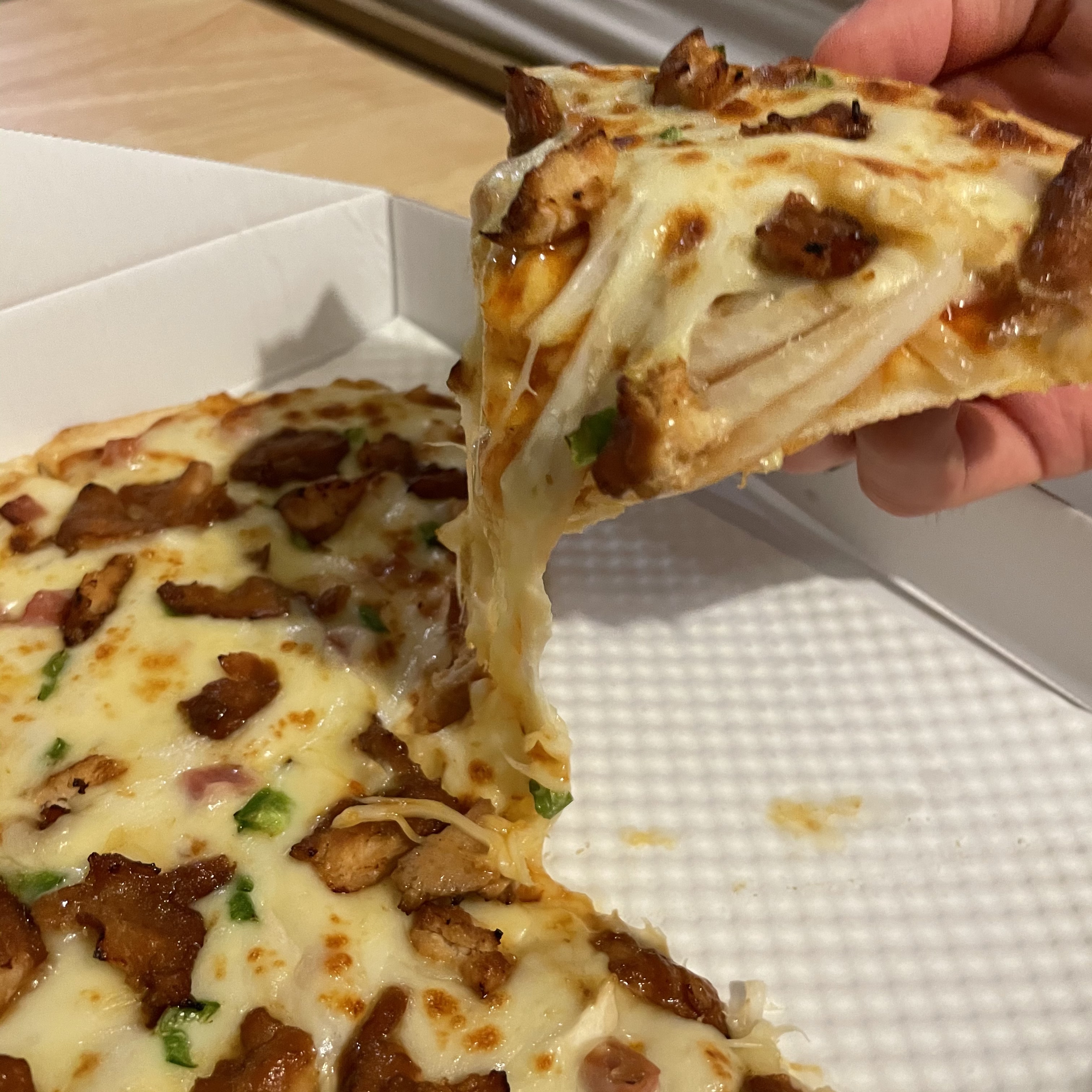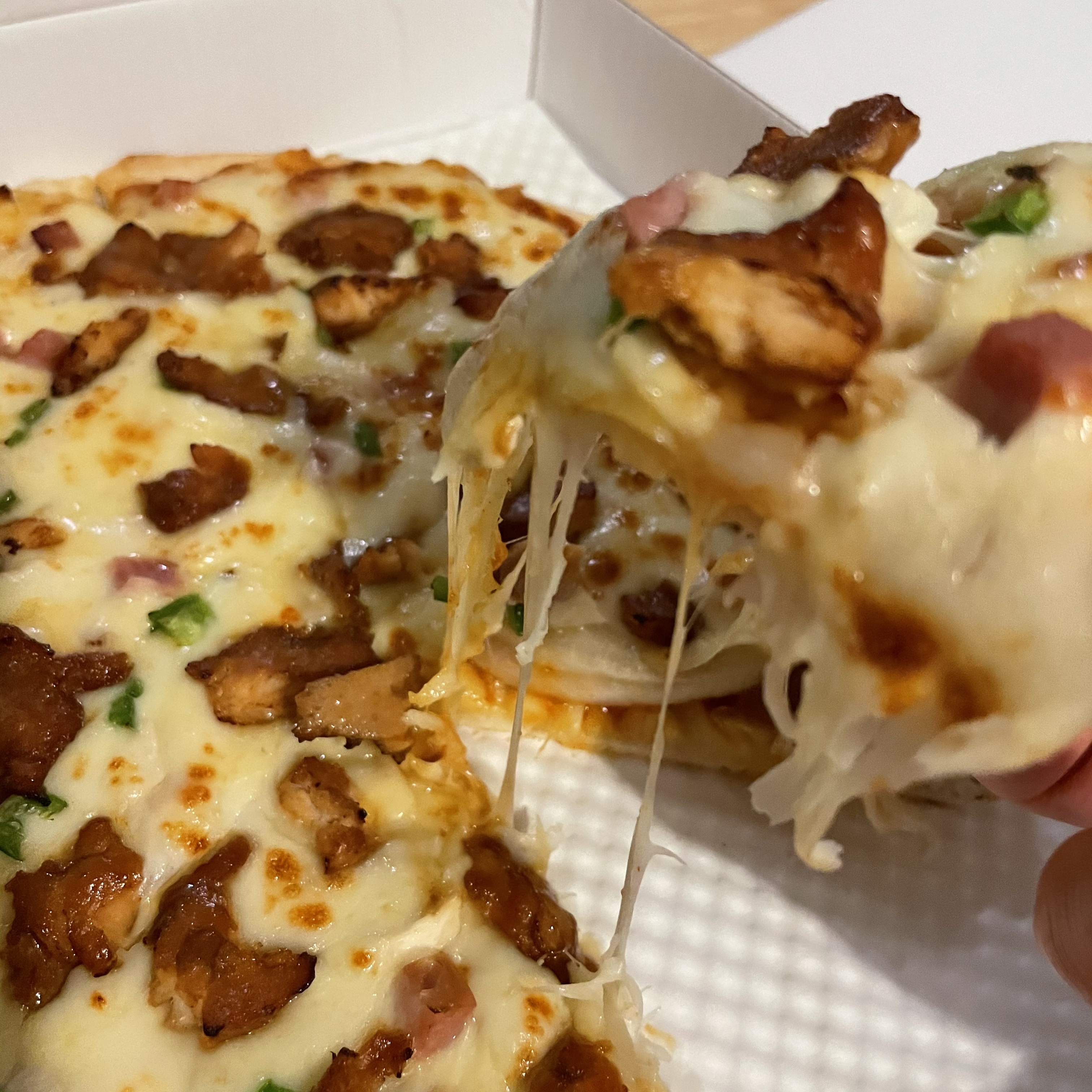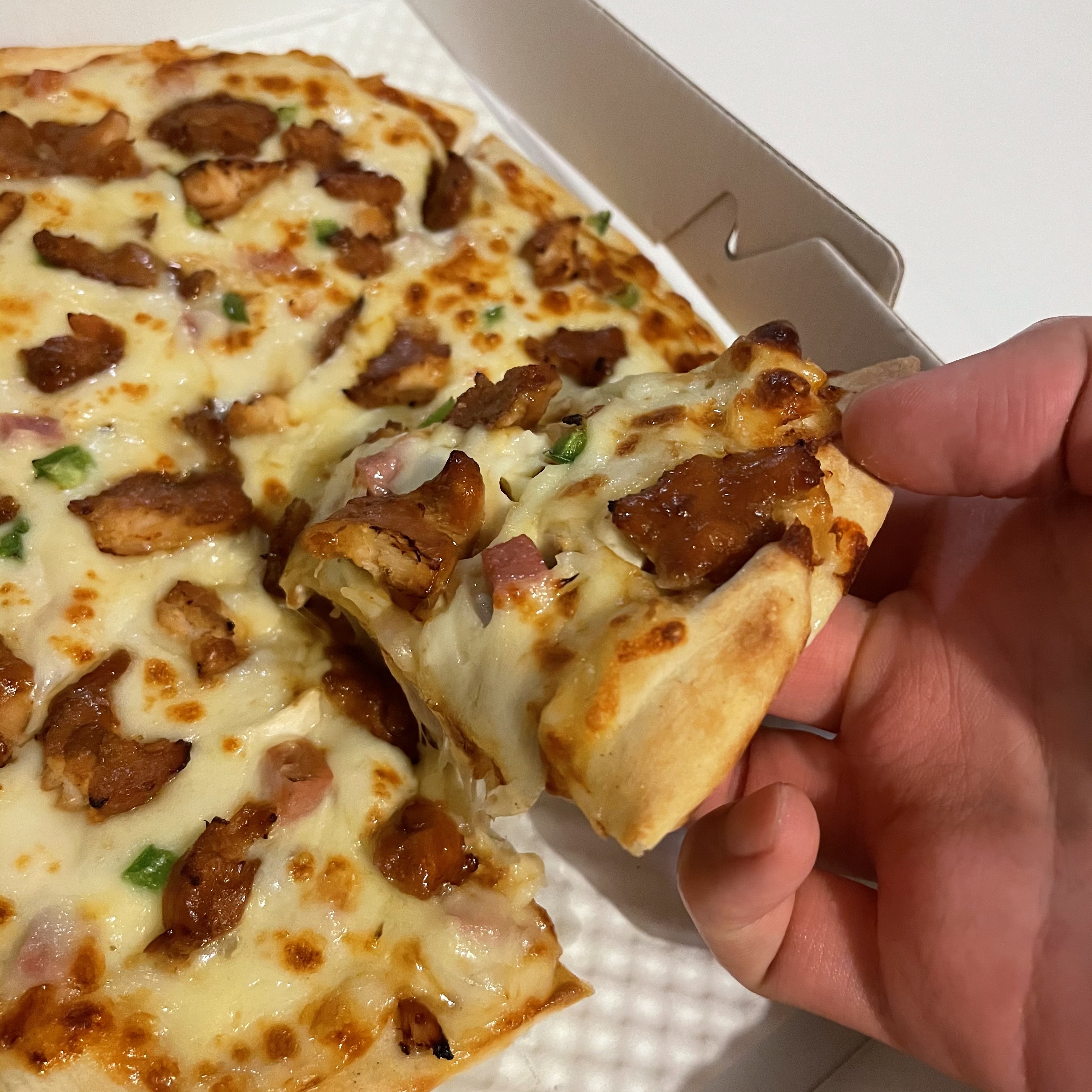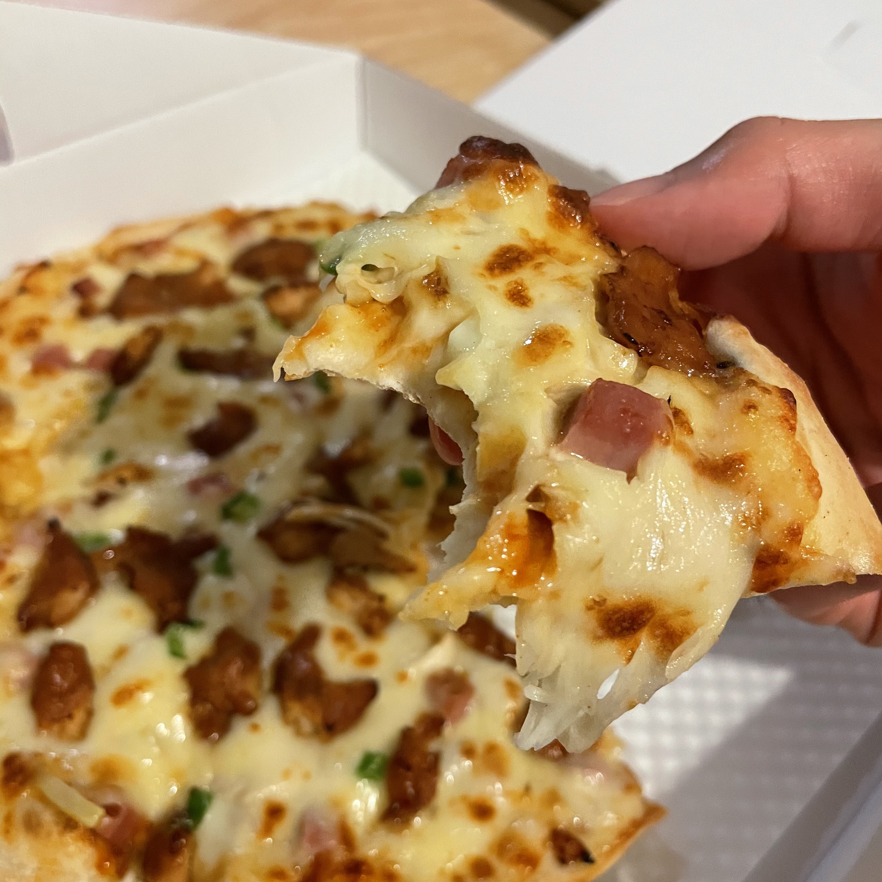 첫 조각을 집어 드니 치즈가 쭉 늘어나요. 피자의 두께는 그렇게 두꺼운 편이 아니었어요. 하지만 혼자서 먹기에는 충분한 양과 크기였어요.