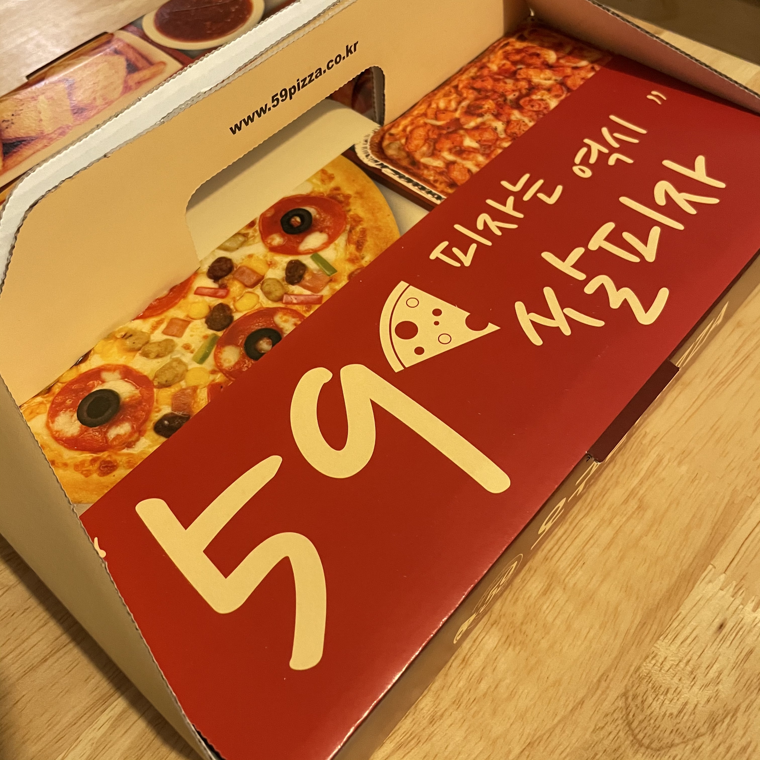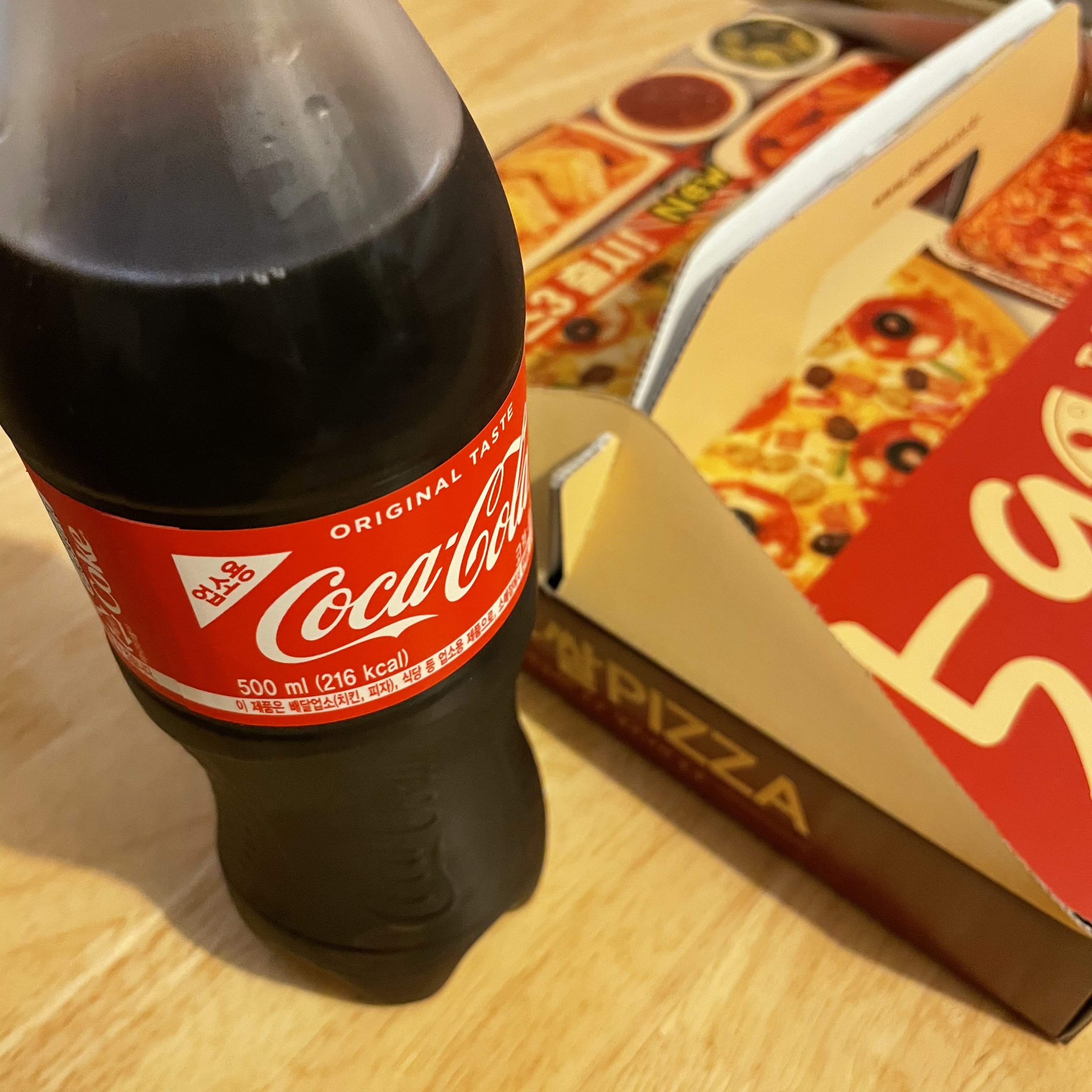 약 40분이 지나서 드디어 피자가 도착했어요! 피자 박스는 뜨끈 뜨근했고, 콜라는 굉장히 시원했어요. 박스를 열기 전부터 냄새가 올라오더라고요.