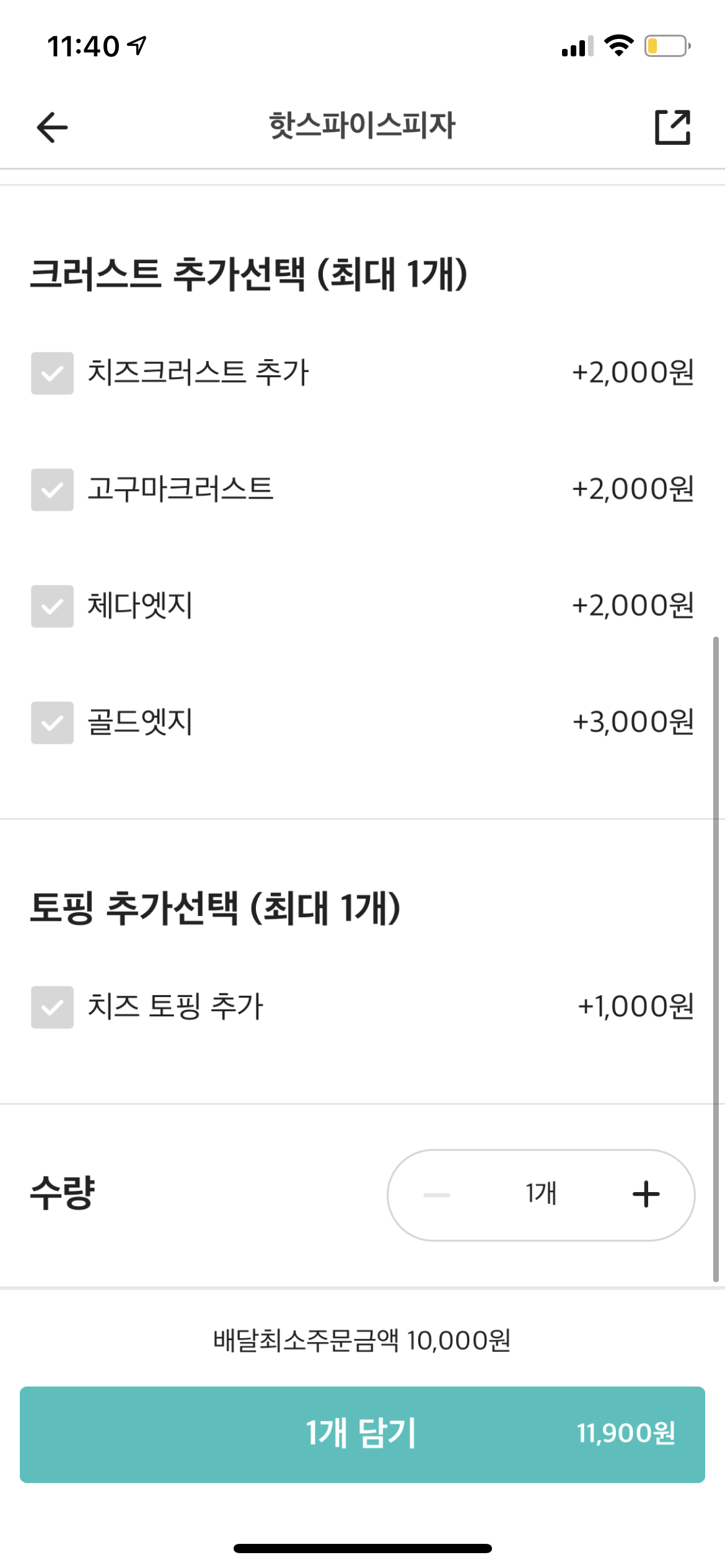 총 가격 : 핫스파이스피자 M 11,900원 + 콜라 500ml 1,500원 = 13,400원