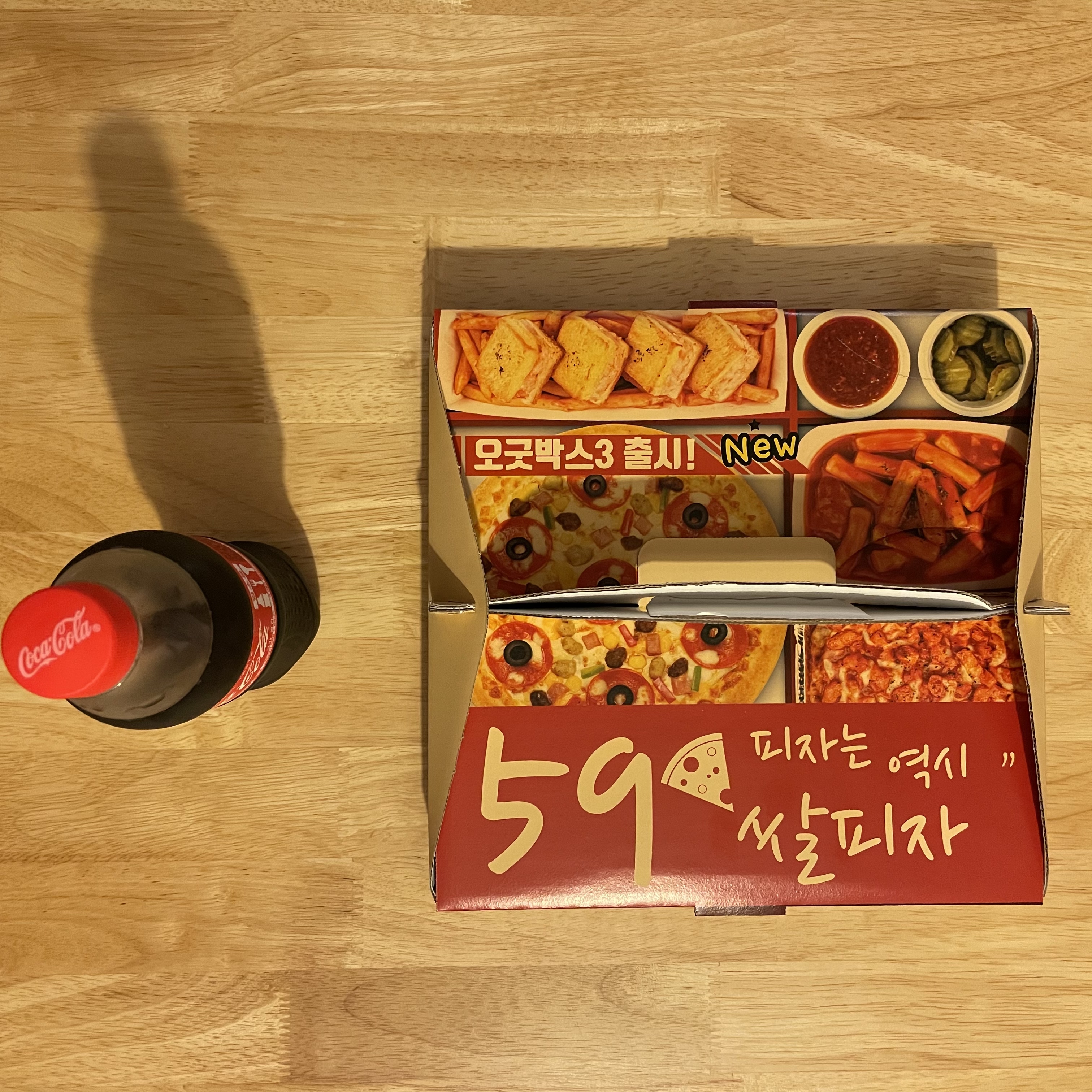 단, 음료와 소스는 별도 구매이기 때문에 콜라 500ml를 하나 추가했어요. (피자 한 판당 피클 1개 제공해줍니다.)