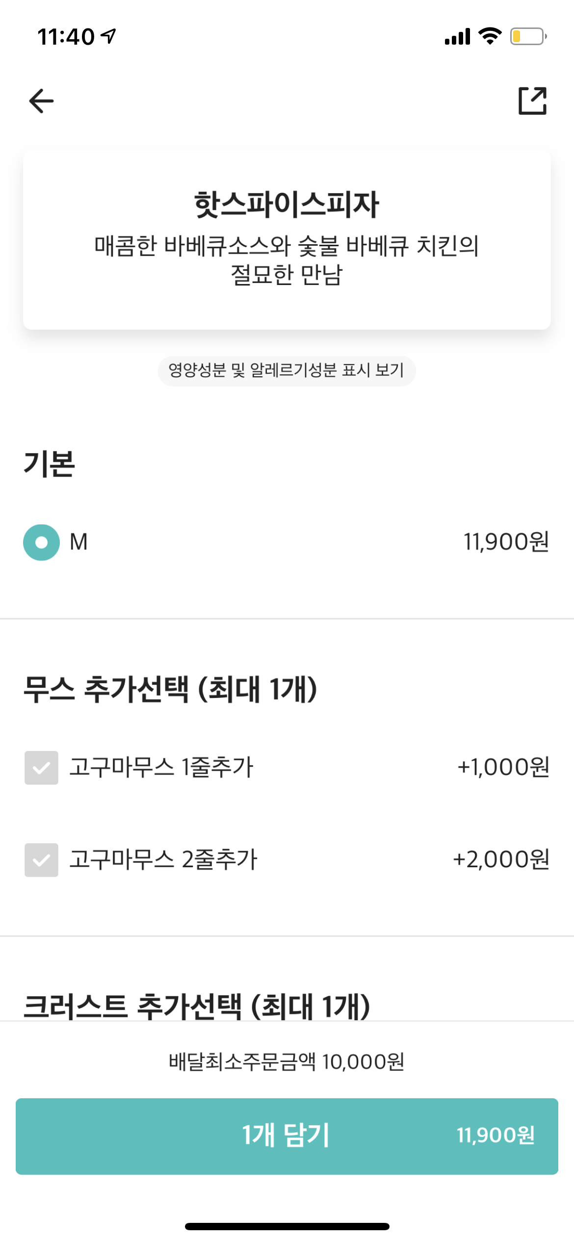 오구쌀피자는 무스, 크러스트, 토핑을 추가할 수 있는데요, 슈퍼콤비네이션피자를 먹을 땐 고구마무스와 체다엣지를 추가해서 먹곤 했었는데 이번에는 본연의 맛을 즐기고 싶어서 아무것도 추가하지 않았어요.