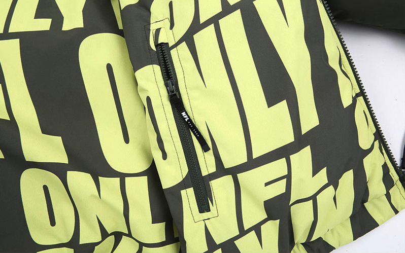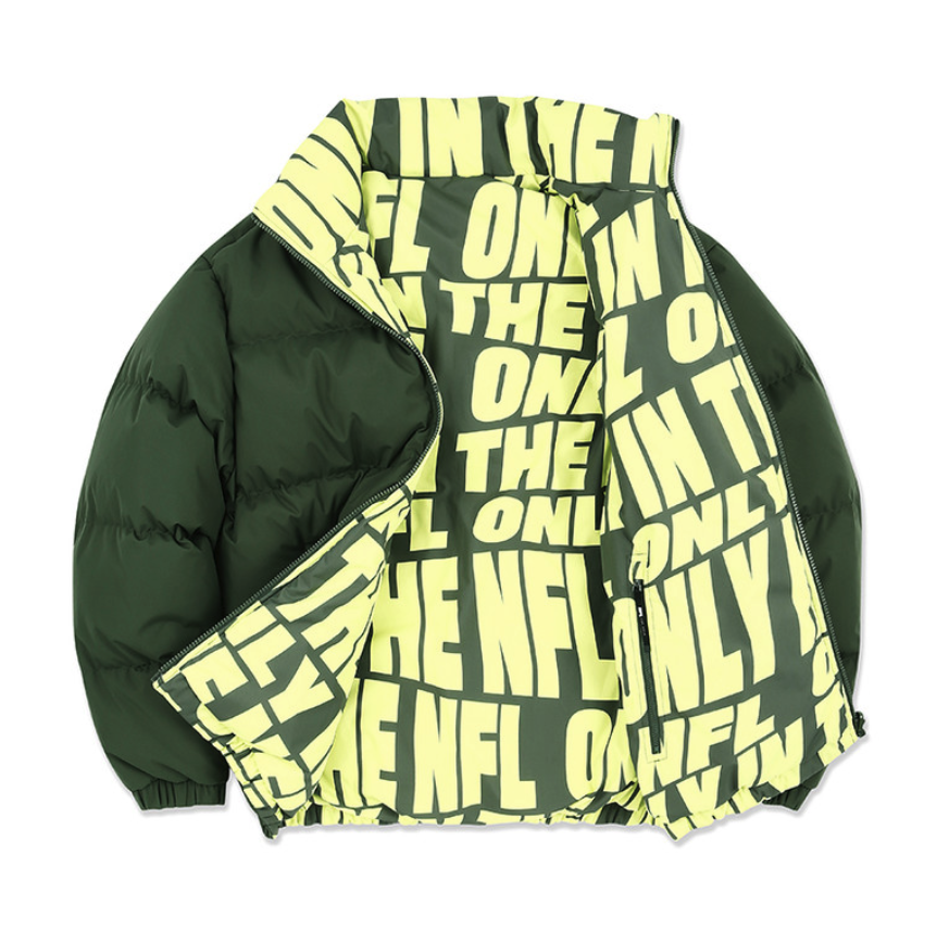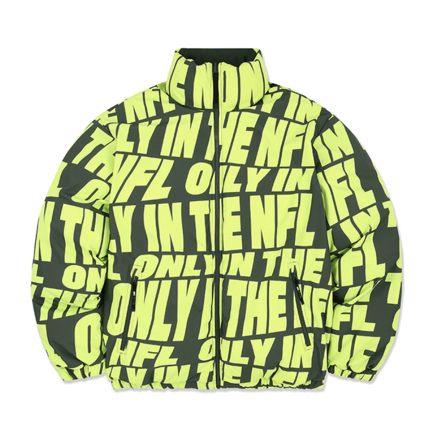 NFL (엔에프엘) 클럽 리버시블 다운 패딩의 한쪽면은 NFL의 슬로건인 'ONLY IN THE NFL'로 웨이비한 패턴의 힙한 디자인으로 연출되었는데요, NFL의 스포츠 정신과 트렌디한 요소를 함께 보여주는 스트릿 스타일의 패딩인 것 같습니다.
