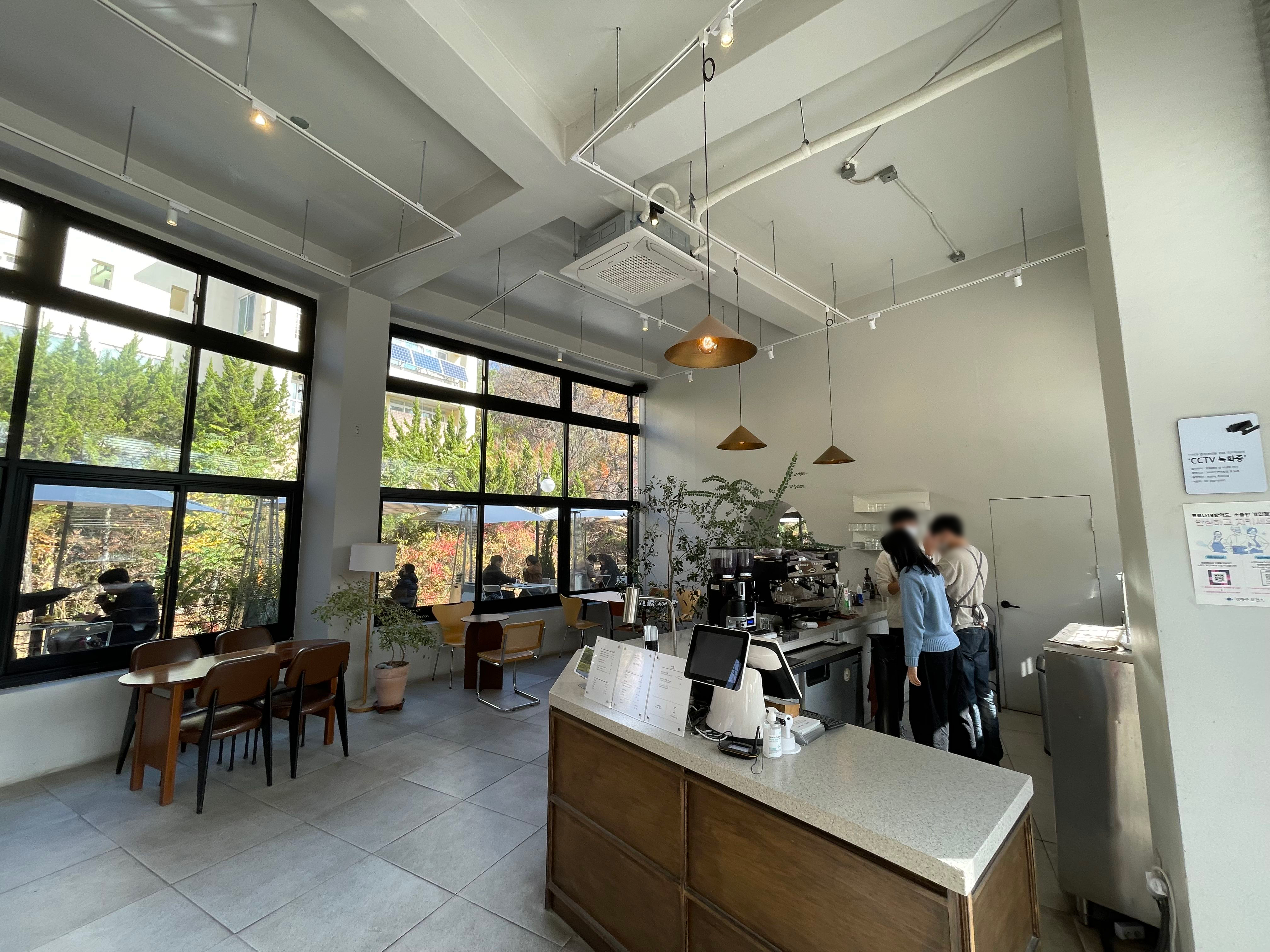 그리고 카페 천장과 벽에 큰 통창이 나 있었는데요, 천장으로는 햇빛이 내리쬐어서 따뜻한 분위기를 느낄 수 있었고, 벽 쪽 통창으로는 단풍이 물든 숲과 계곡물이 졸졸 흐르는 모습을 볼 수 있었어요.