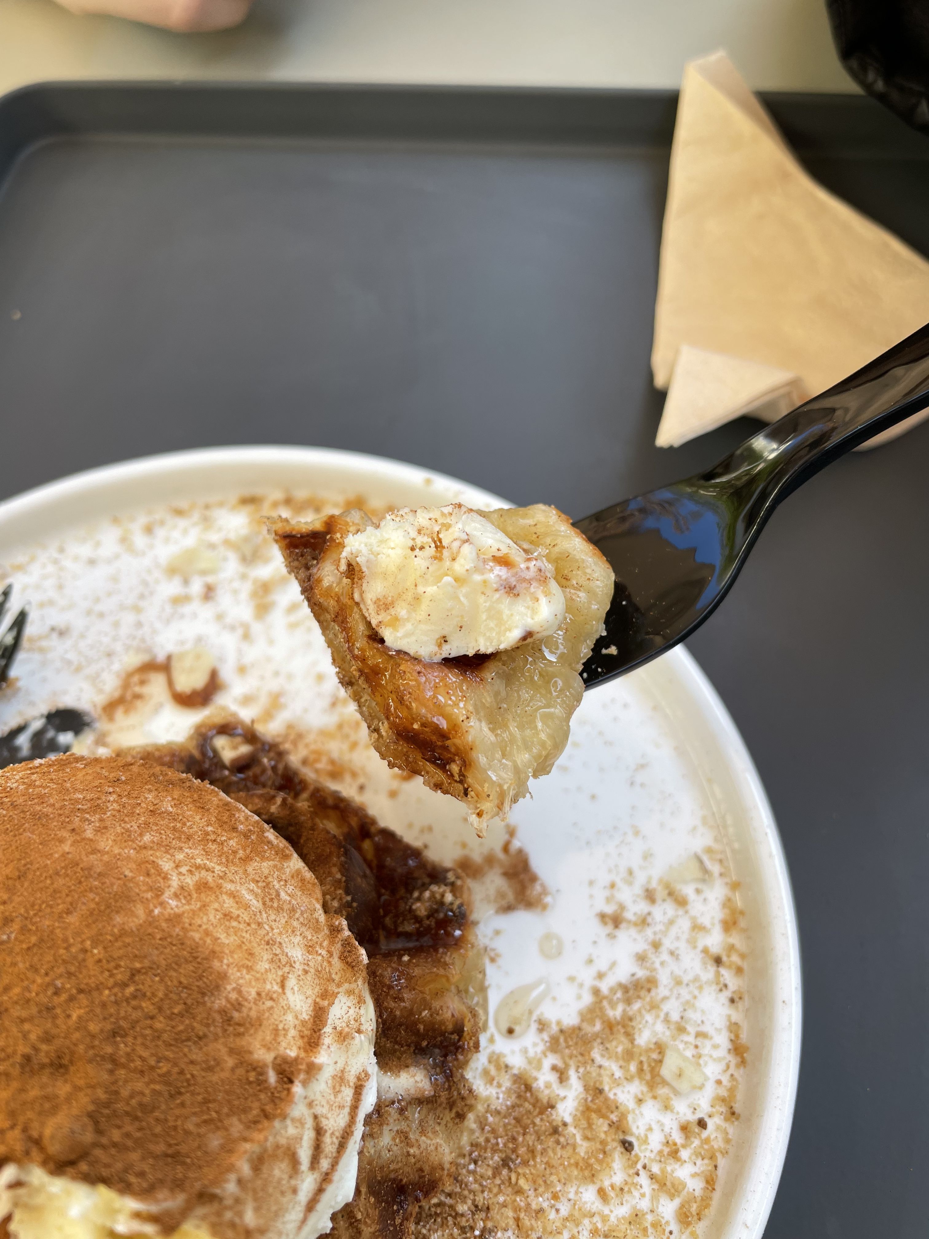 시럽이 발린 크로플을 잘라서 그 위에 아이스크림을 적당량 덜어 함께 먹어 봤는데요, 크로플의 따뜻함과 아이스크림의 차가움이 섞이는 맛의 조화가 좋았어요.